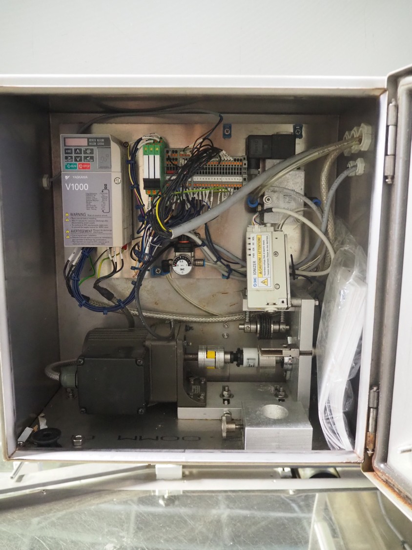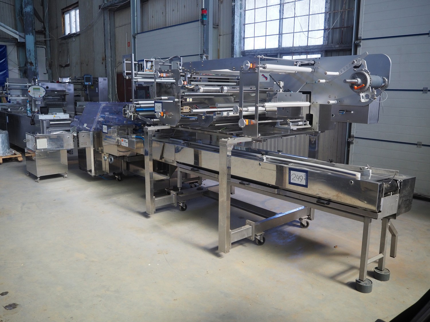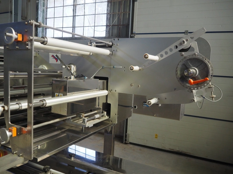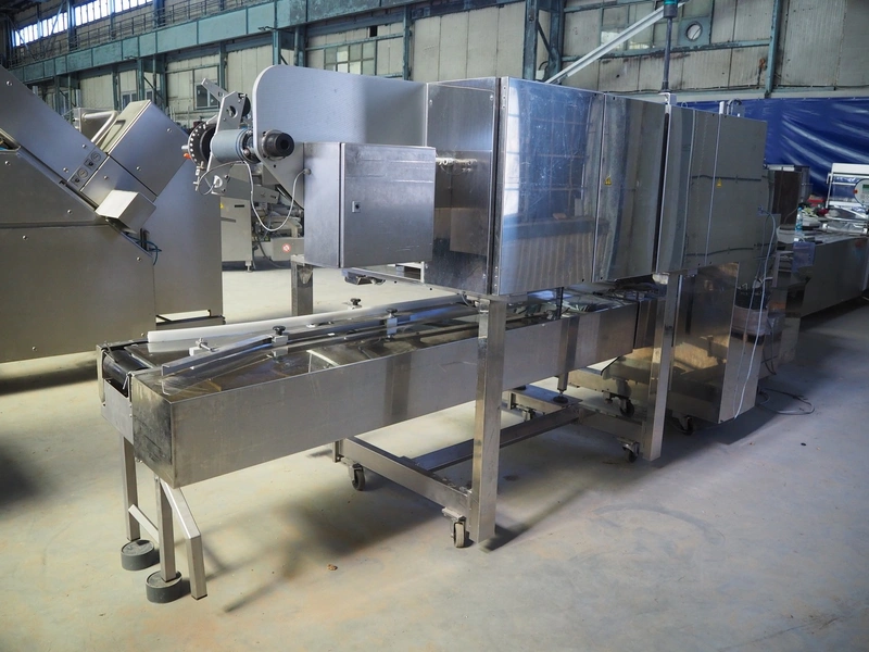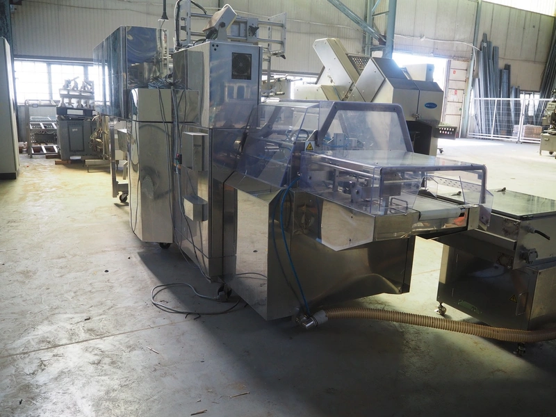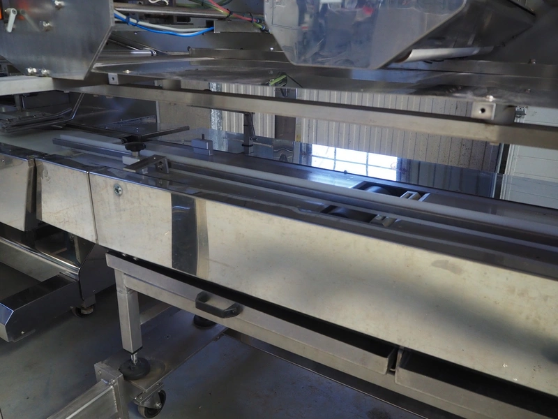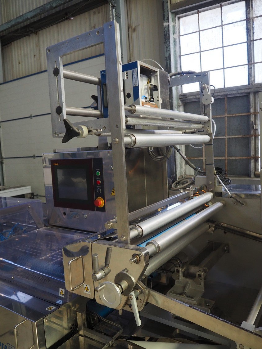 Fuji Machinery Co., Ltd. flowpacker, model: DDWQF-F10200A, type: FW3430, serial number: D0157J525010009, year of construction: 7-2015, 200/220 V, 3 Ph, 50/60 Hz, 5 KVA, with film printing units, plastic belt, belt width: 240 mm, seal length: 295 mm, total dimensions: 5650 mm x 1500 mm x 1950 mm.
