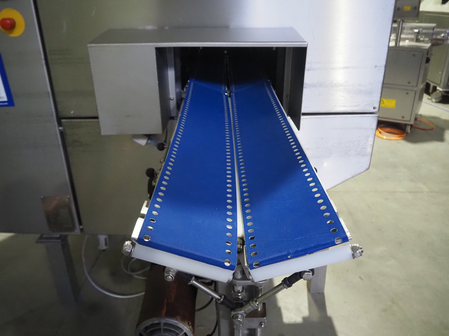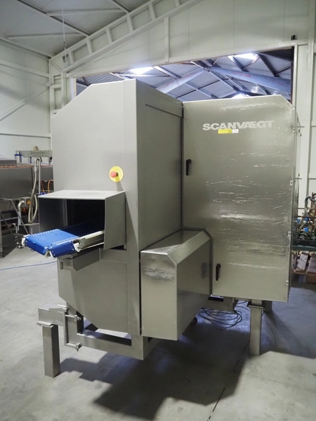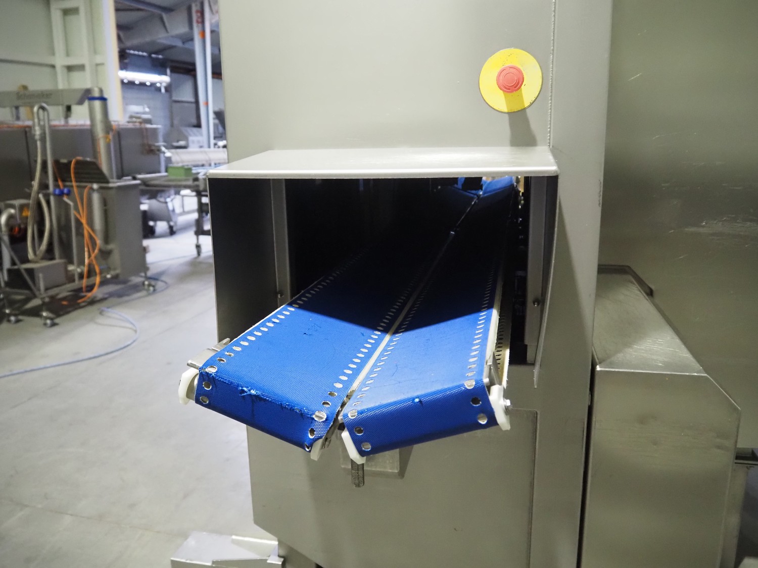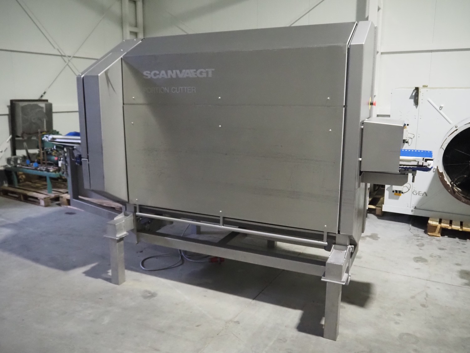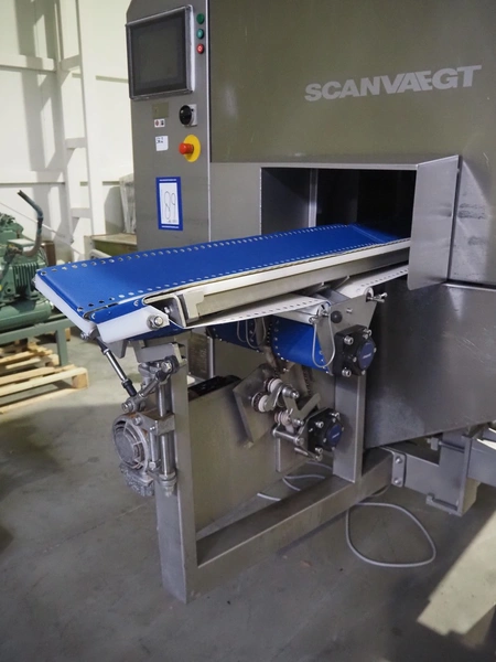 Scanvaegt / Marel portion cutter, type: B-55, serial number: 7143.80.0430, year of construction: 26-08-2004, 400 V, 3 Ph, 50/60 Hz, 20 A, 10 kW, plastic belt, belt width: 290 mm, clearance: 390 mm x 190 mm, total dimensions: 3400 mm x 1650 mm x 1800 mm.