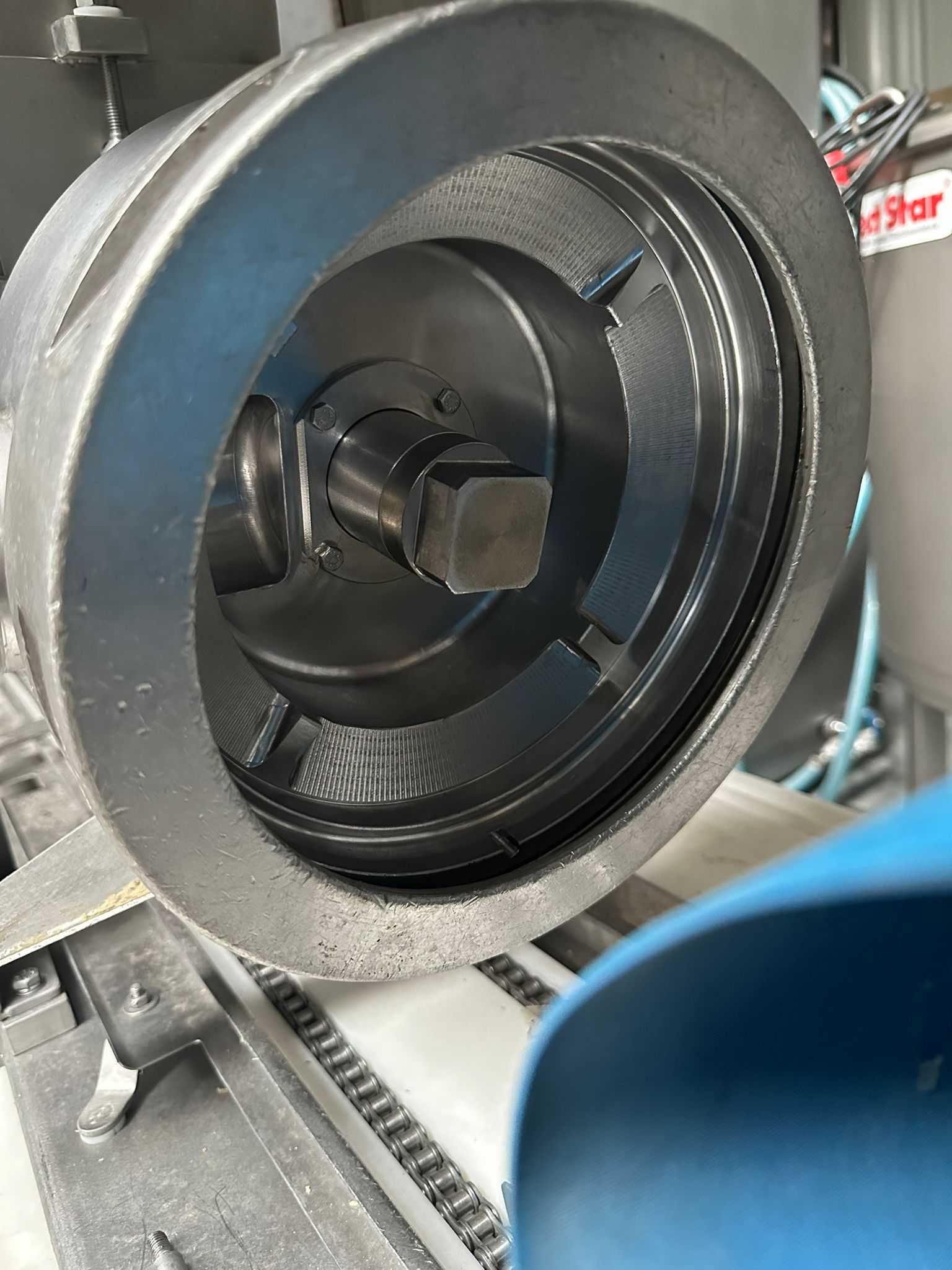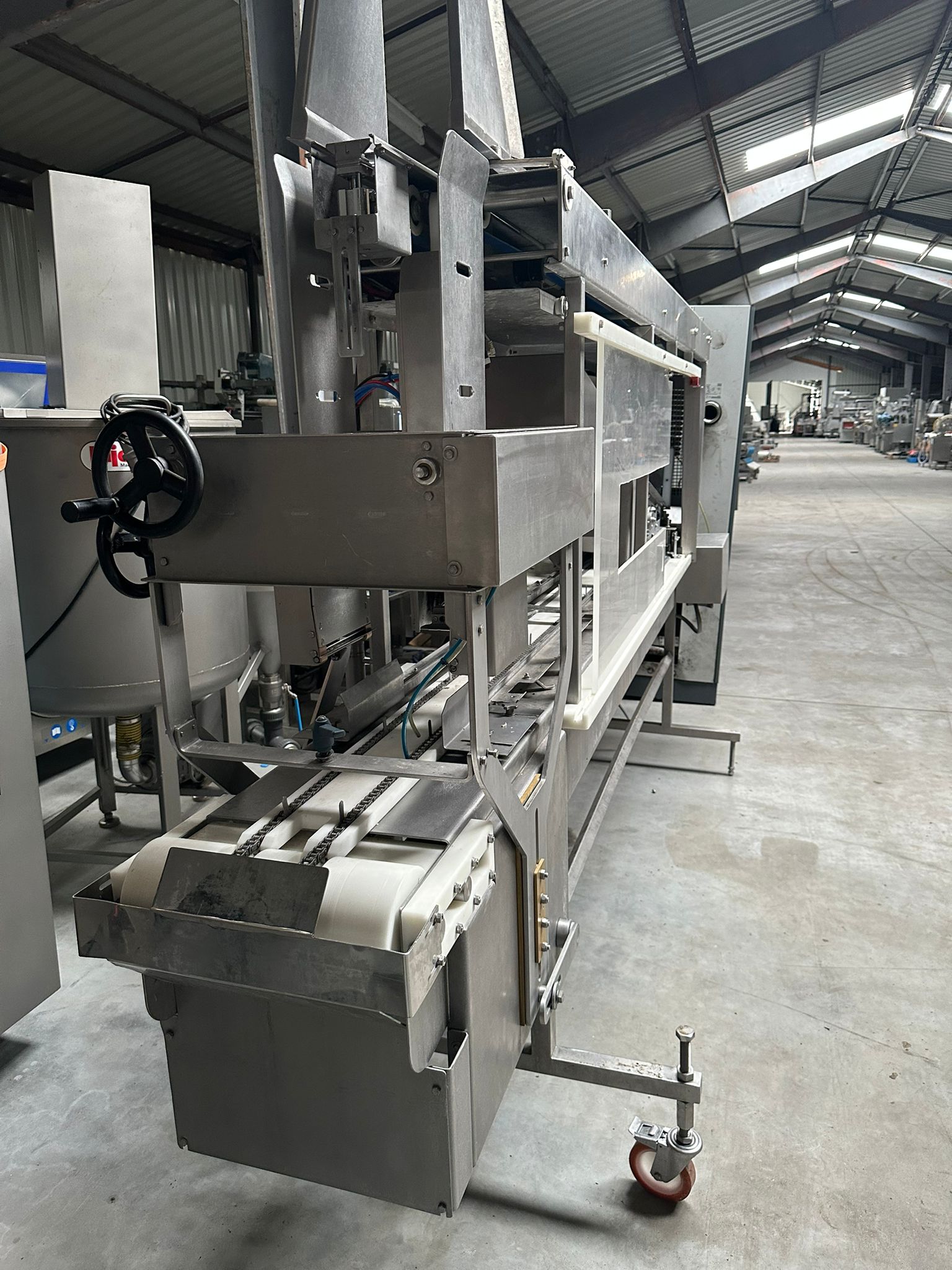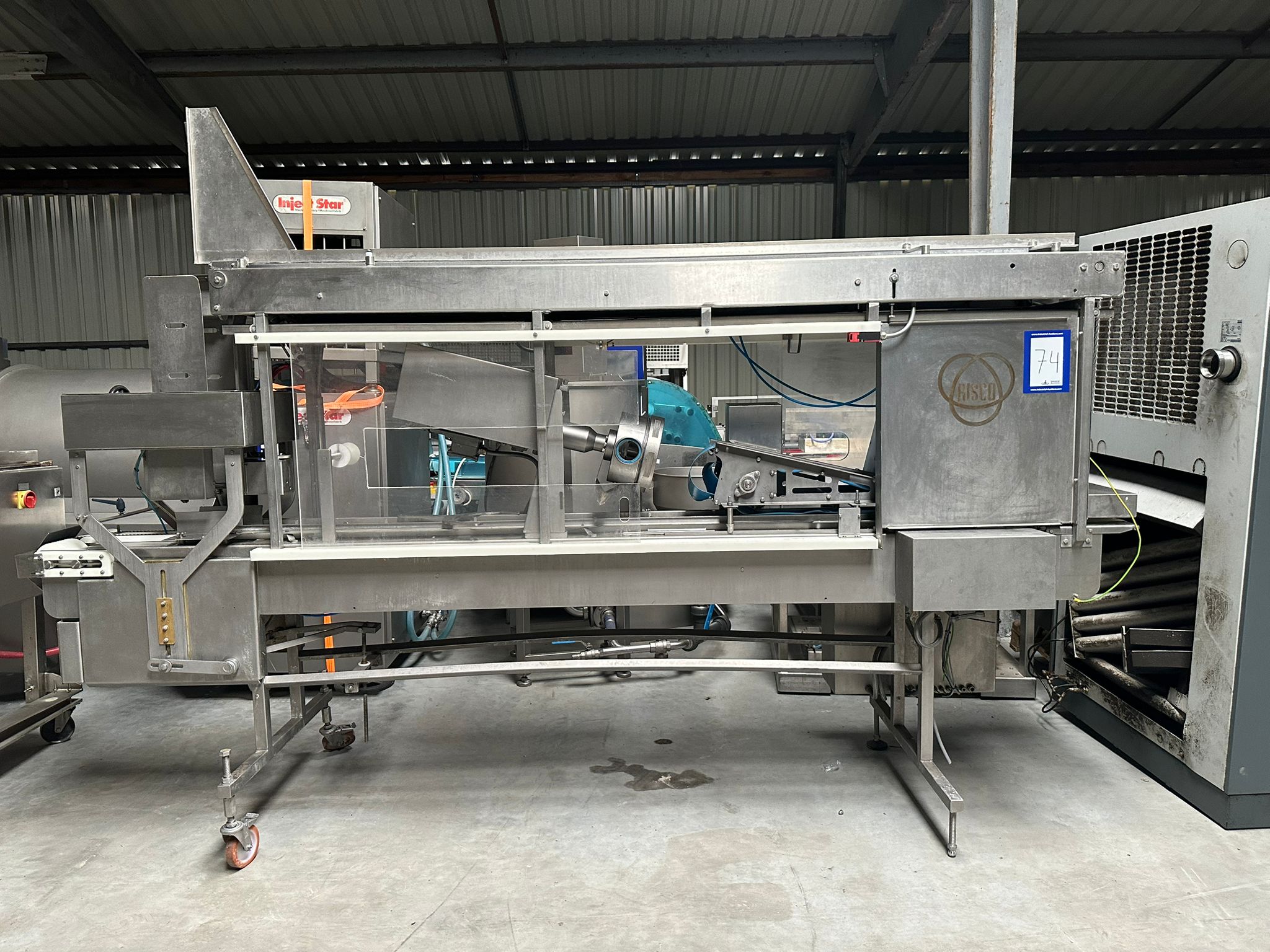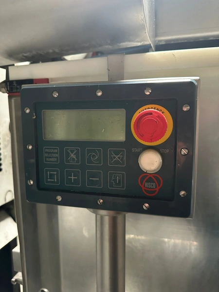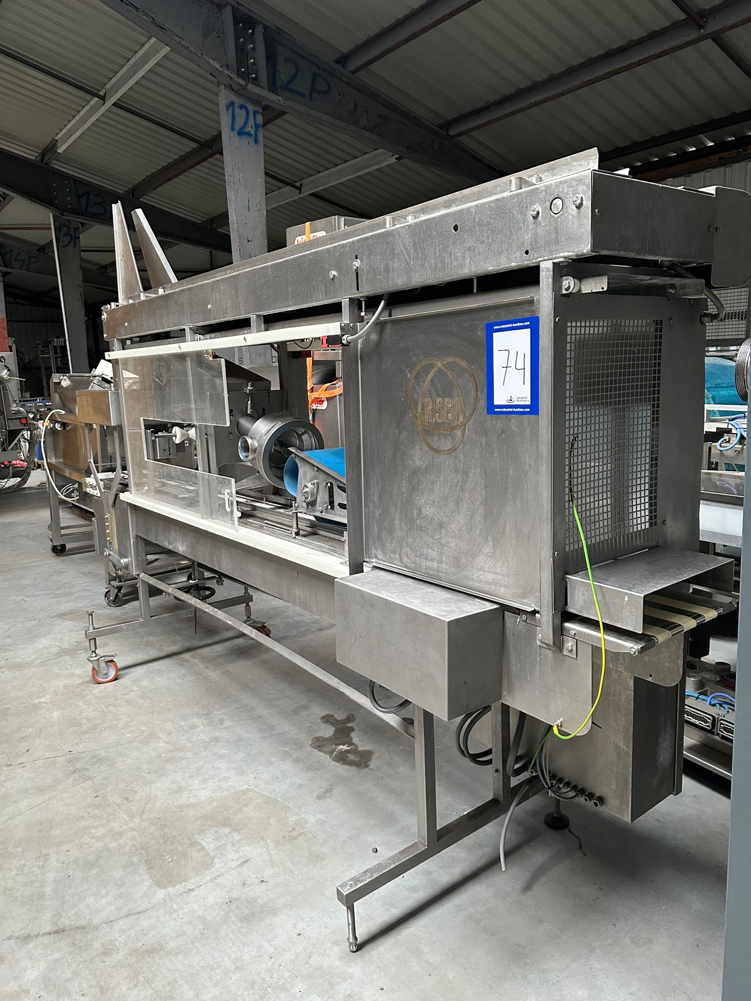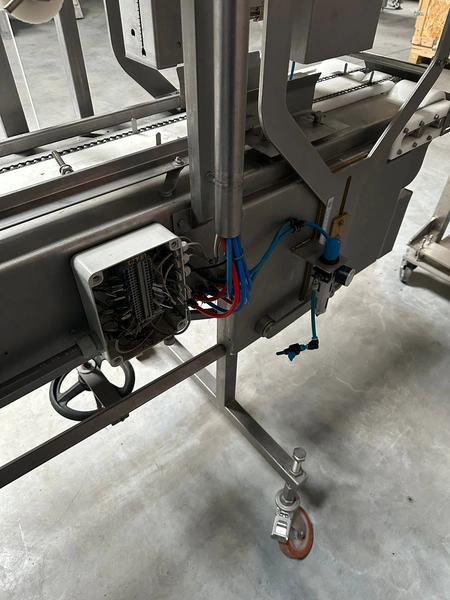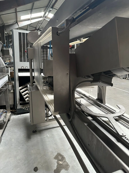 Risco S.p.A. portioning machine, clearance (adjustable): 215 mm x 250 mm, plastic belt, belt width: 180 mm, total dimensions: 3600 mm x 800 mm x 2380 mm. Incomplete.