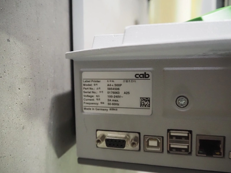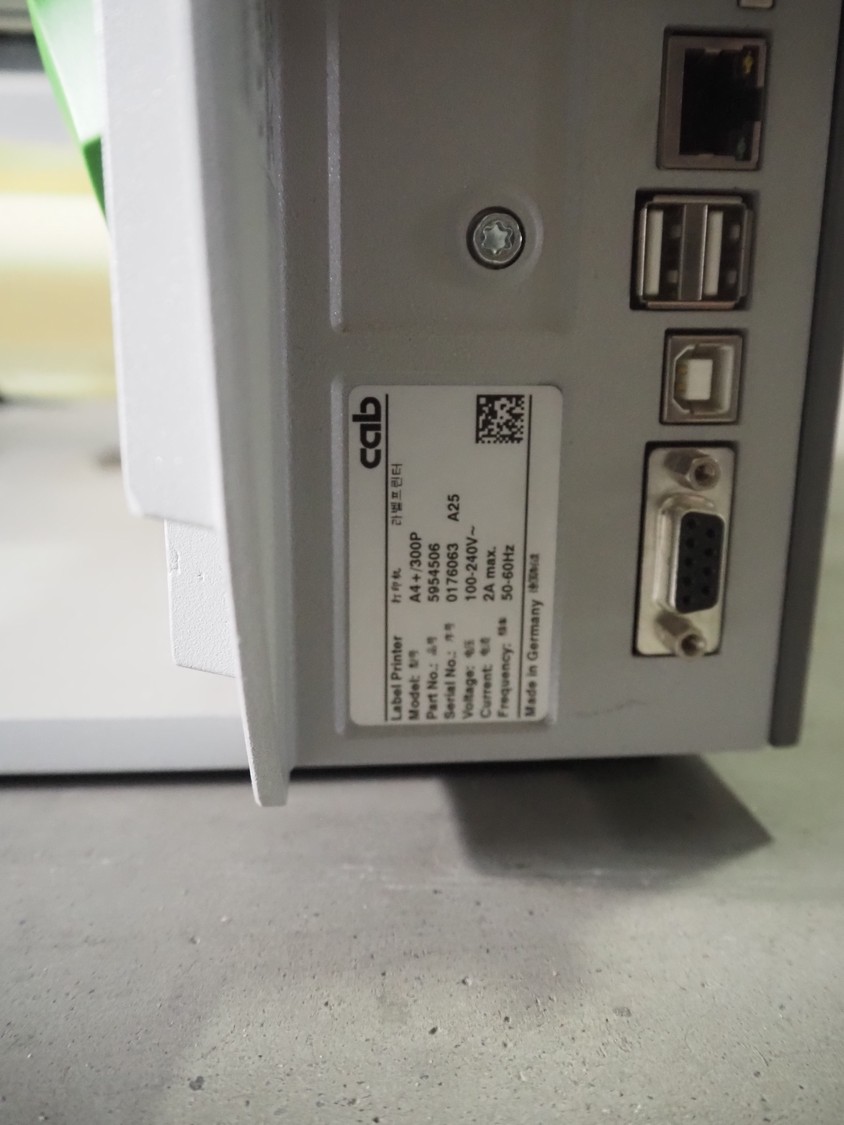 CAB label printer, model: A4+/300P, serial number: 0176063 A25, 100/240 V, 1 Ph, 50/60 Hz, dimensions: 450 mm x 240 mm x 275 mm. Missing cover.