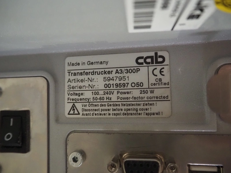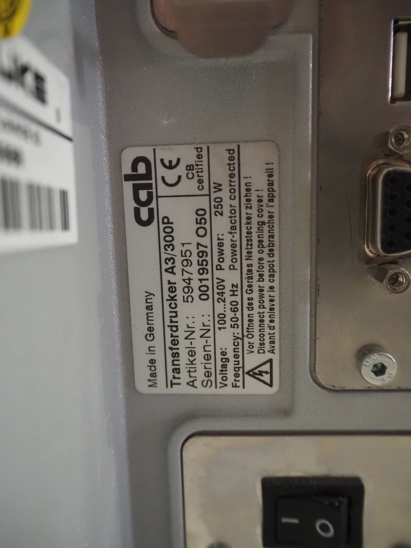 CAB label printer, model: A3/300P, serial number: 0019597 O50, 100/240 V, 1 Ph, 50/60 Hz, dimensions: 450 mm x 240 mm x 275 mm. Missing cover.