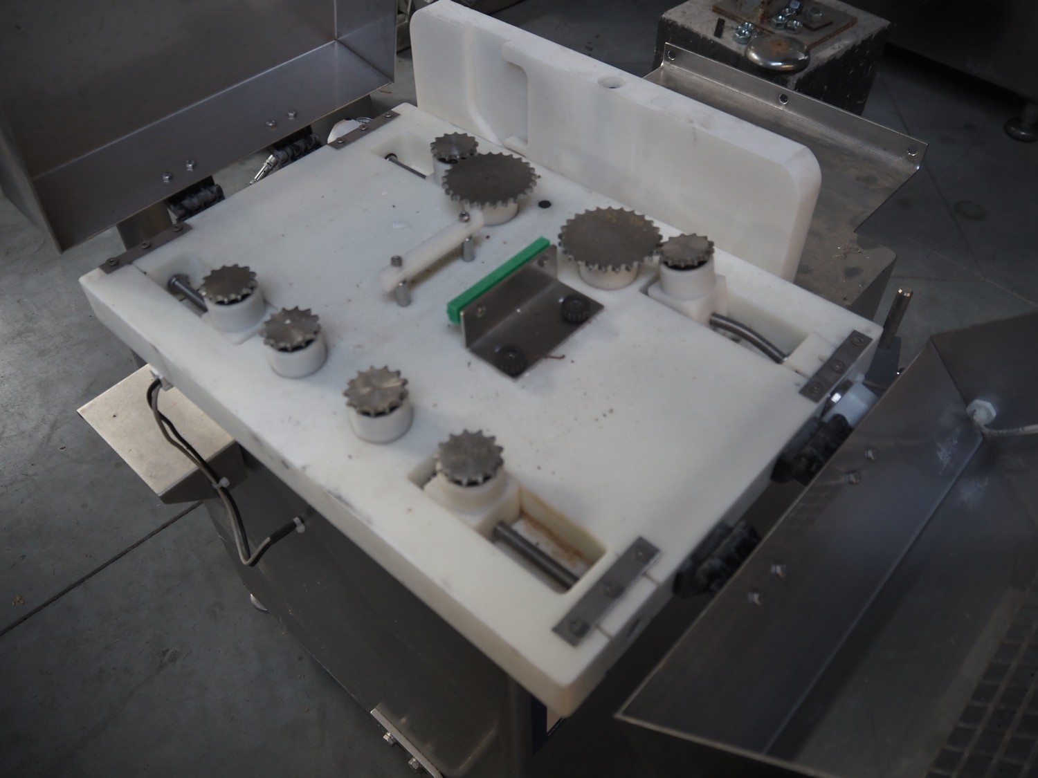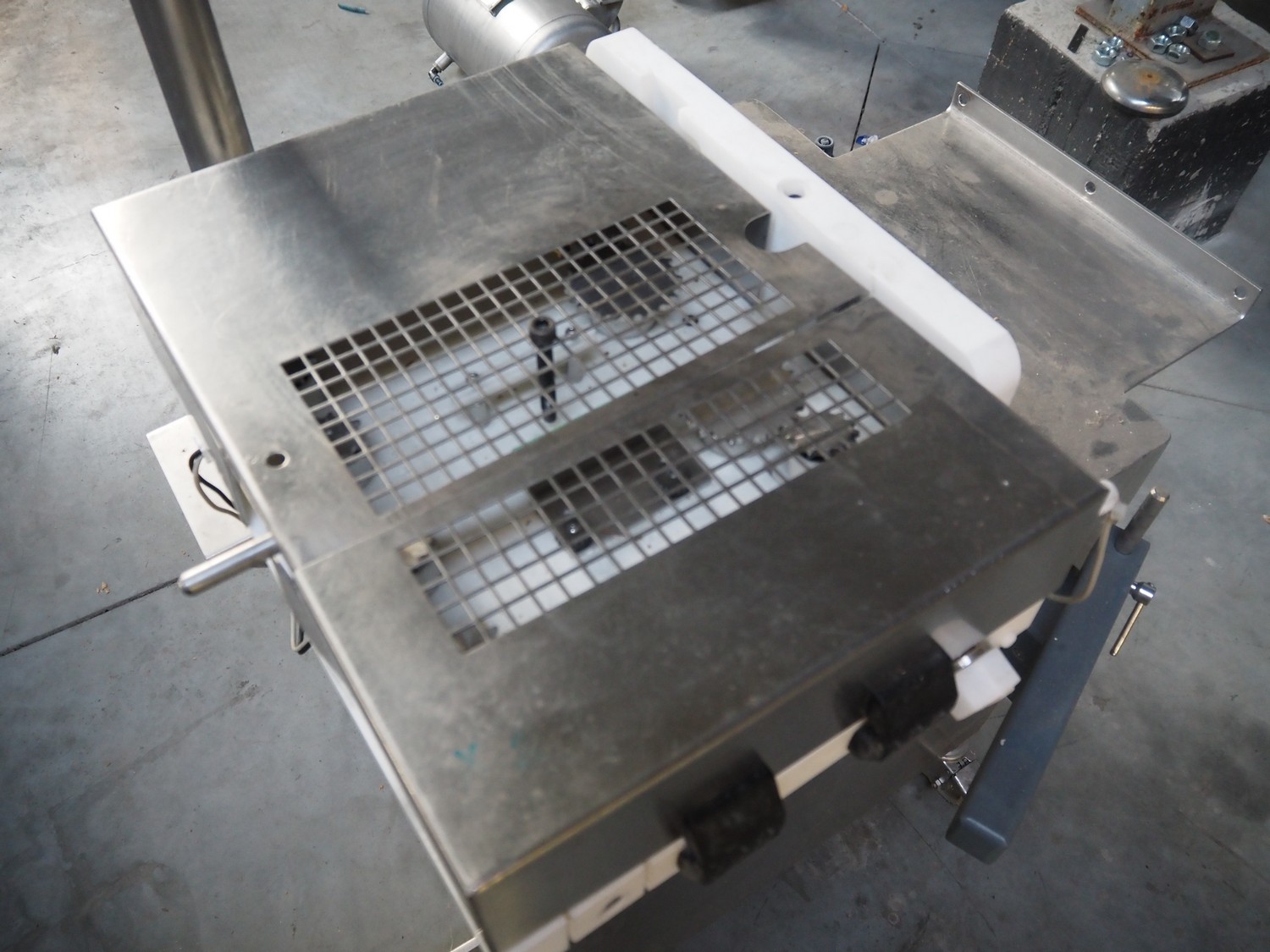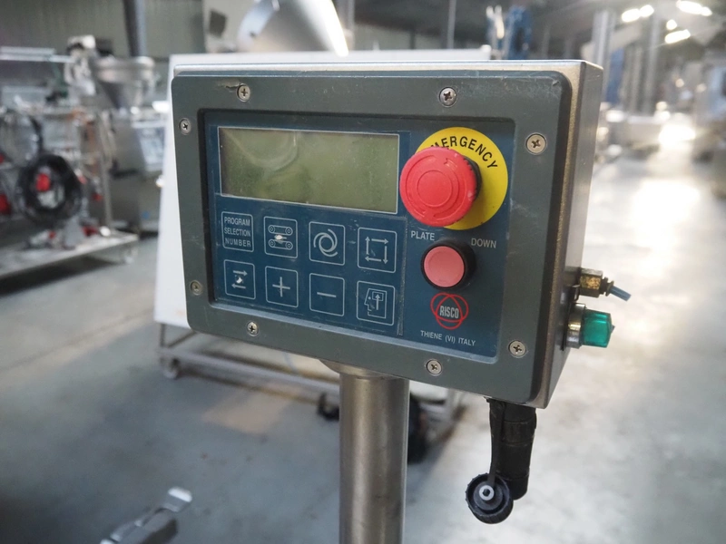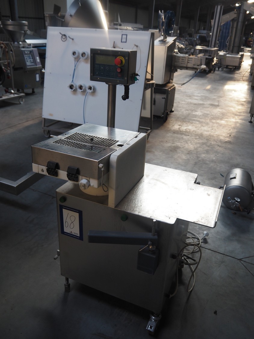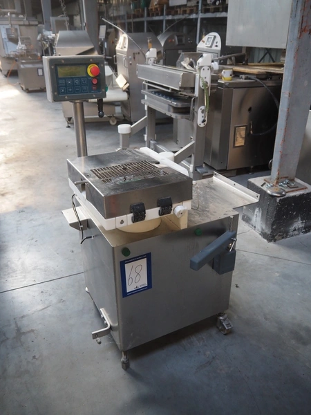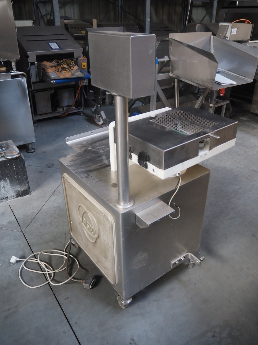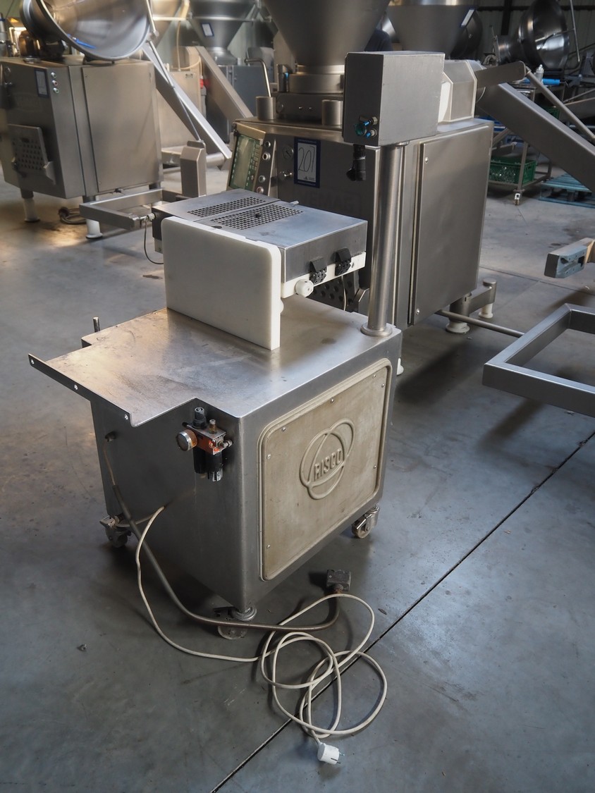 Risco sausage cutter, clearance: 75 mm x 65 mm, total dimensions: 1000 mm x 900 mm x 1430 mm. Incomplete.