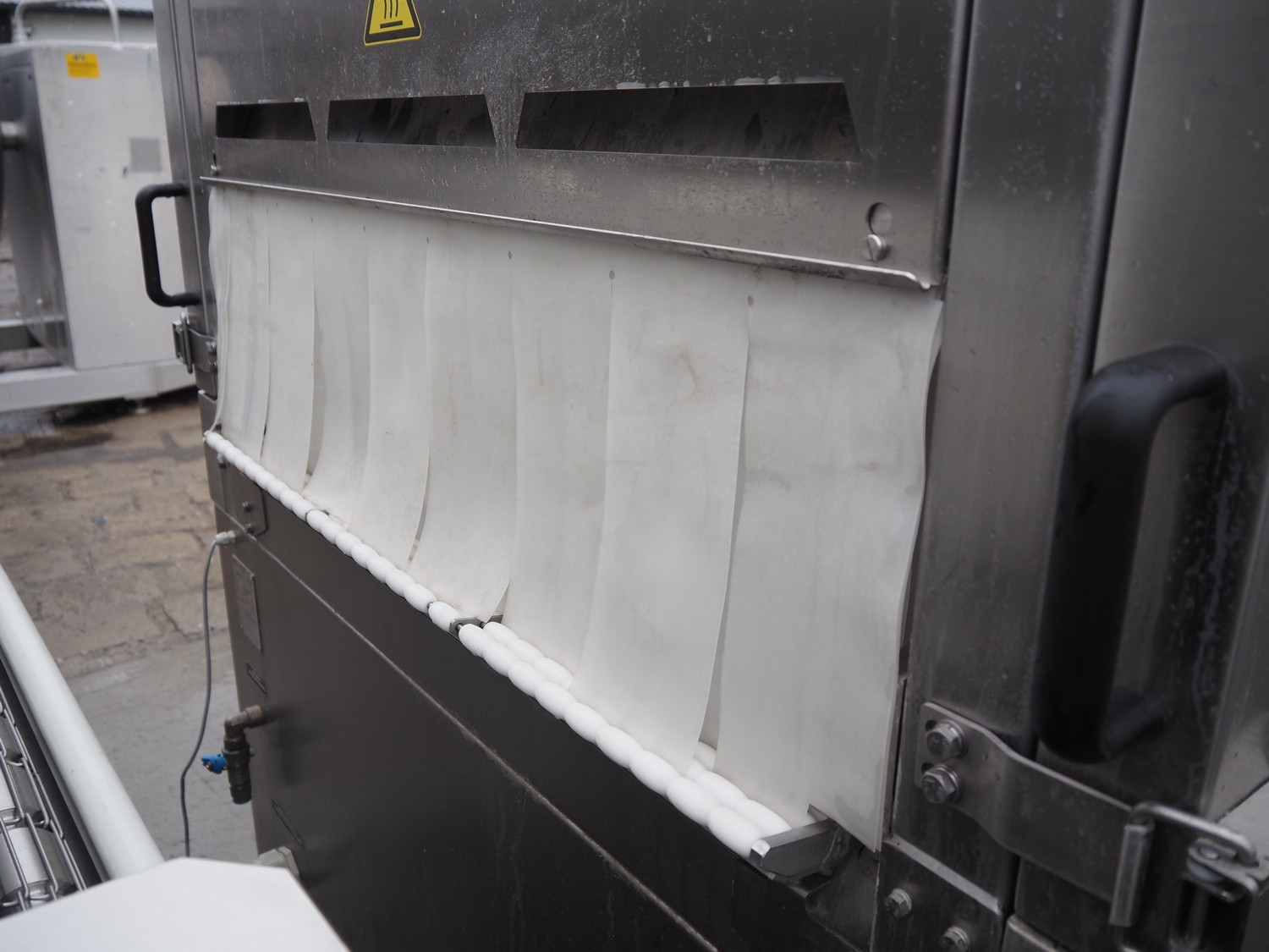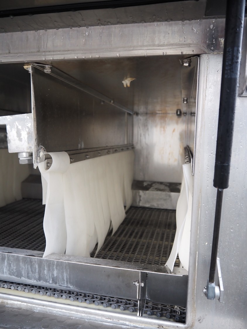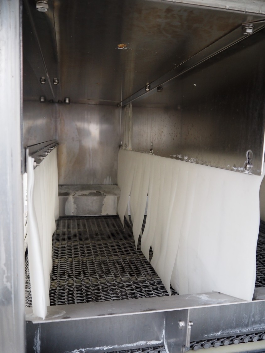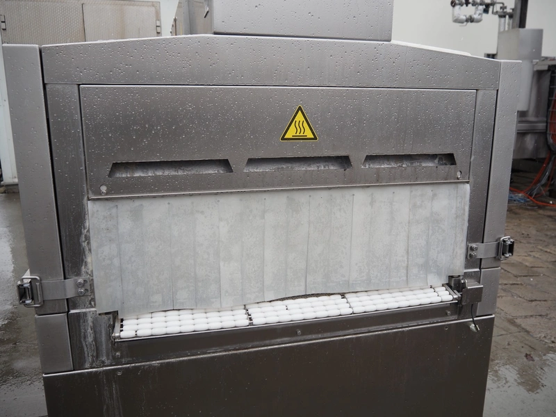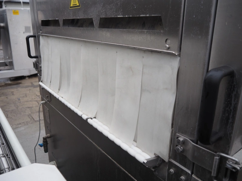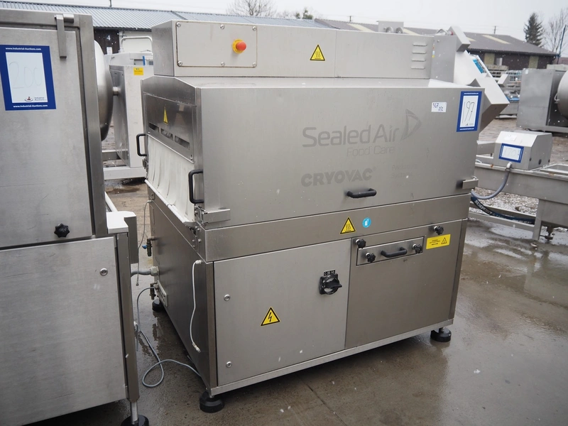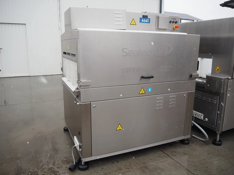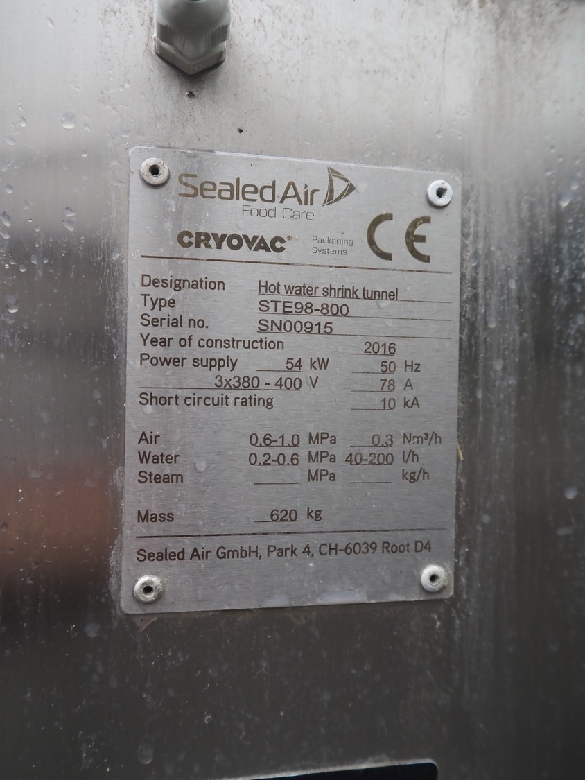 Cryovac shrink tunnel, type: STE98-800, serial number: SN00915, year of construction: 2016, 380-400 V, 3 Ph, 50 Hz, 78 A, 54 kW, 620 kg, s/s mesh belt, belt width: 850 mm, clearance: 825 mm x 275 mm, total dimensions: 1230 mm x 540 mm x 1760 mm.