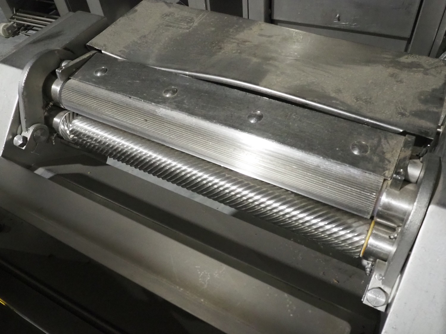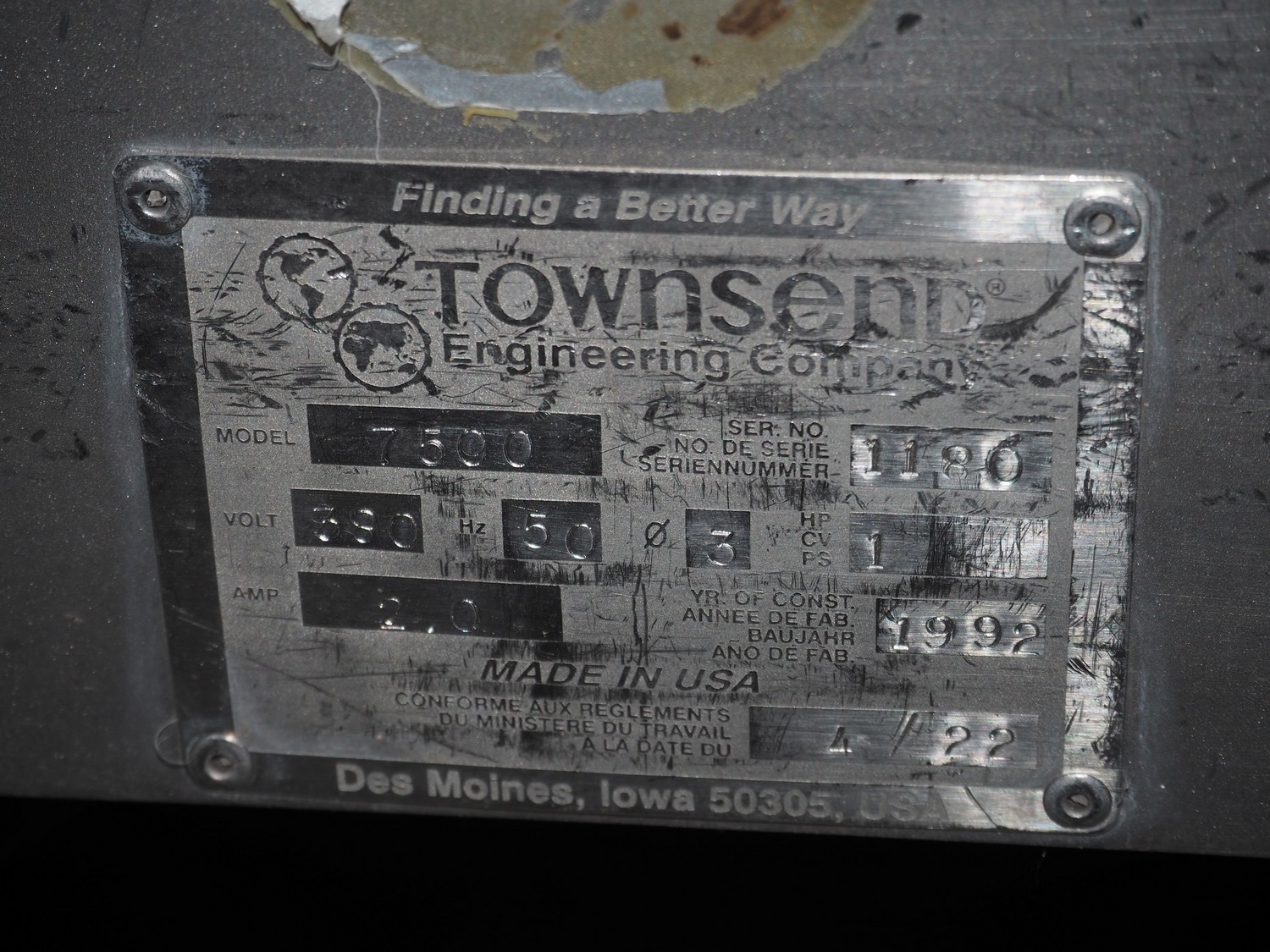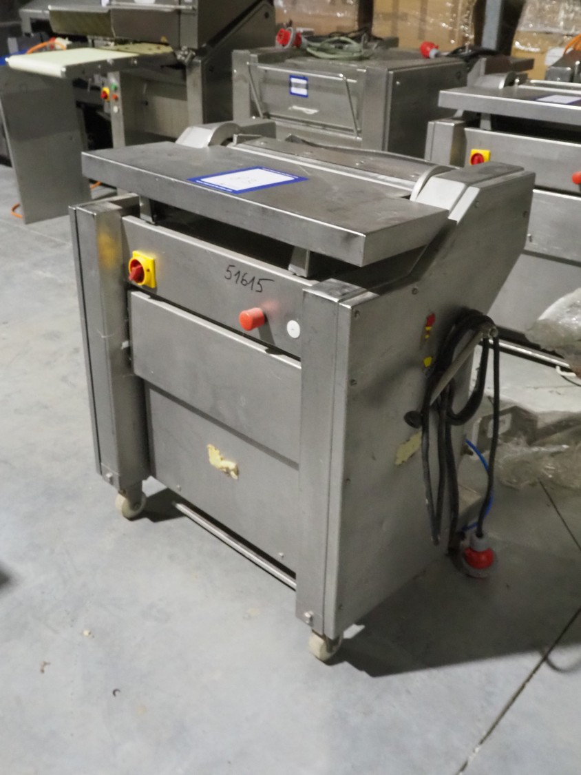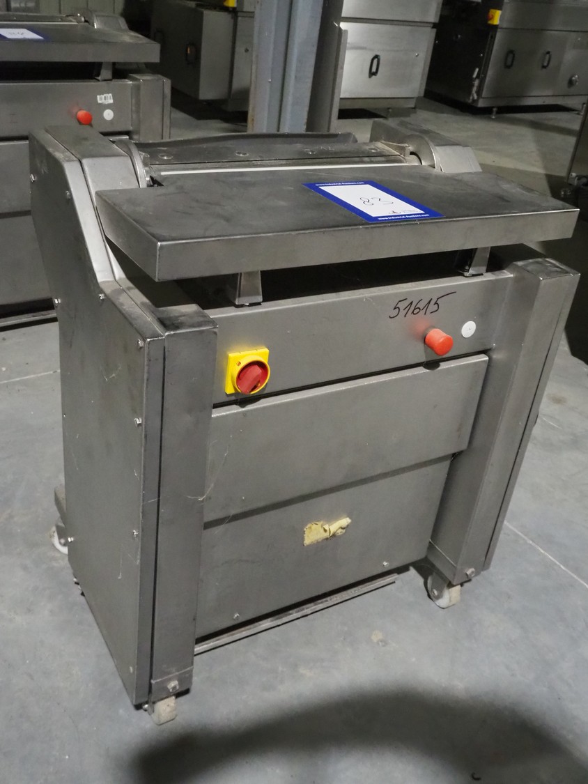 Townsend mobile skinning machine, model: 7500, serial number: 1180, year of construction: 1992, 380 V, 3 Ph, 50 Hz, 2.0 A, working width: 500 mm, foot control, total dimensions: 900 mm x 550 mm x 1100 mm.
