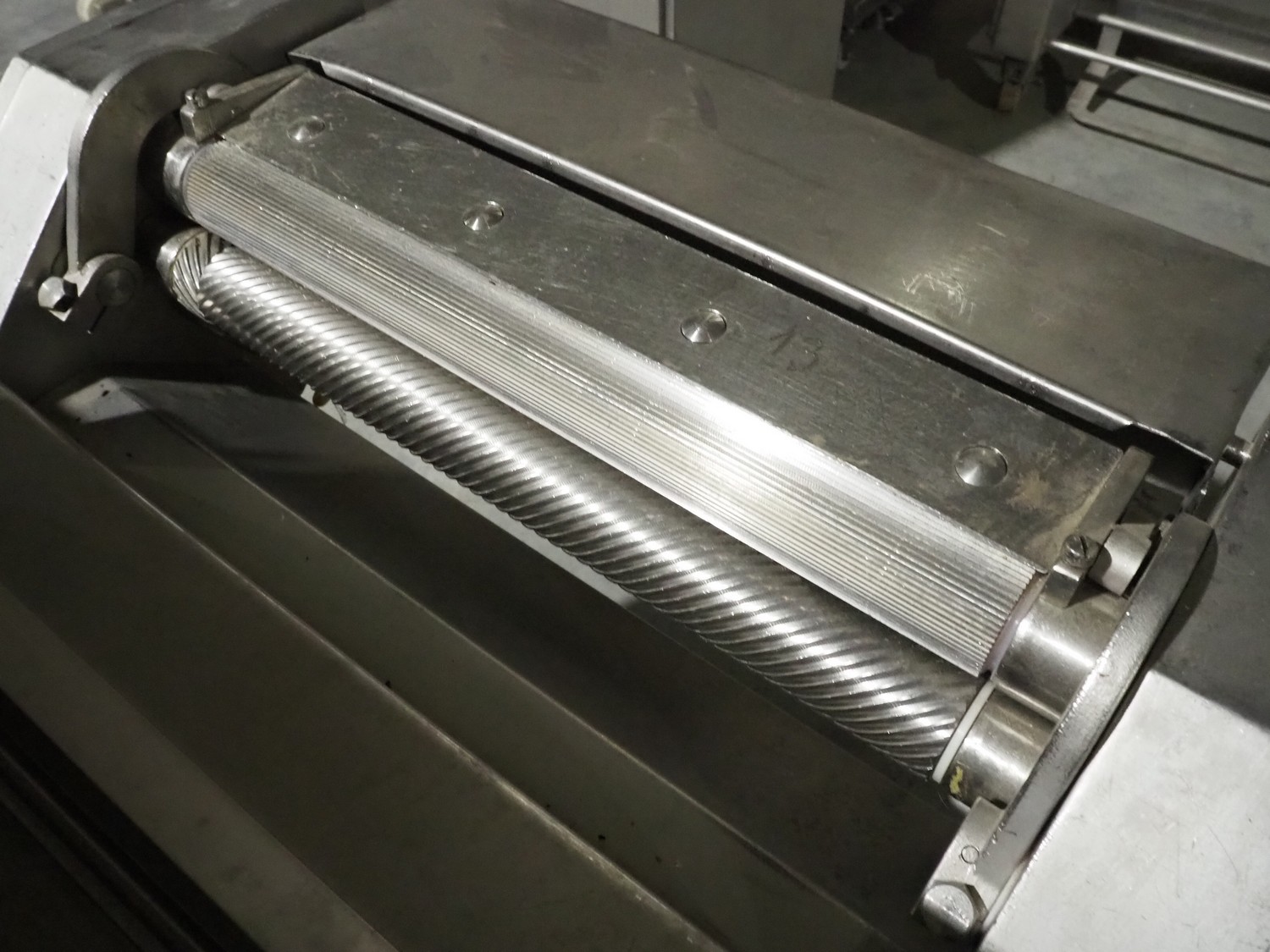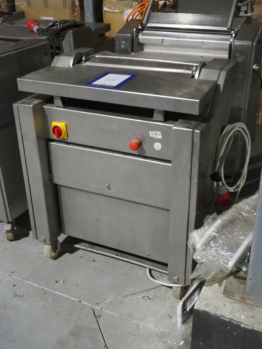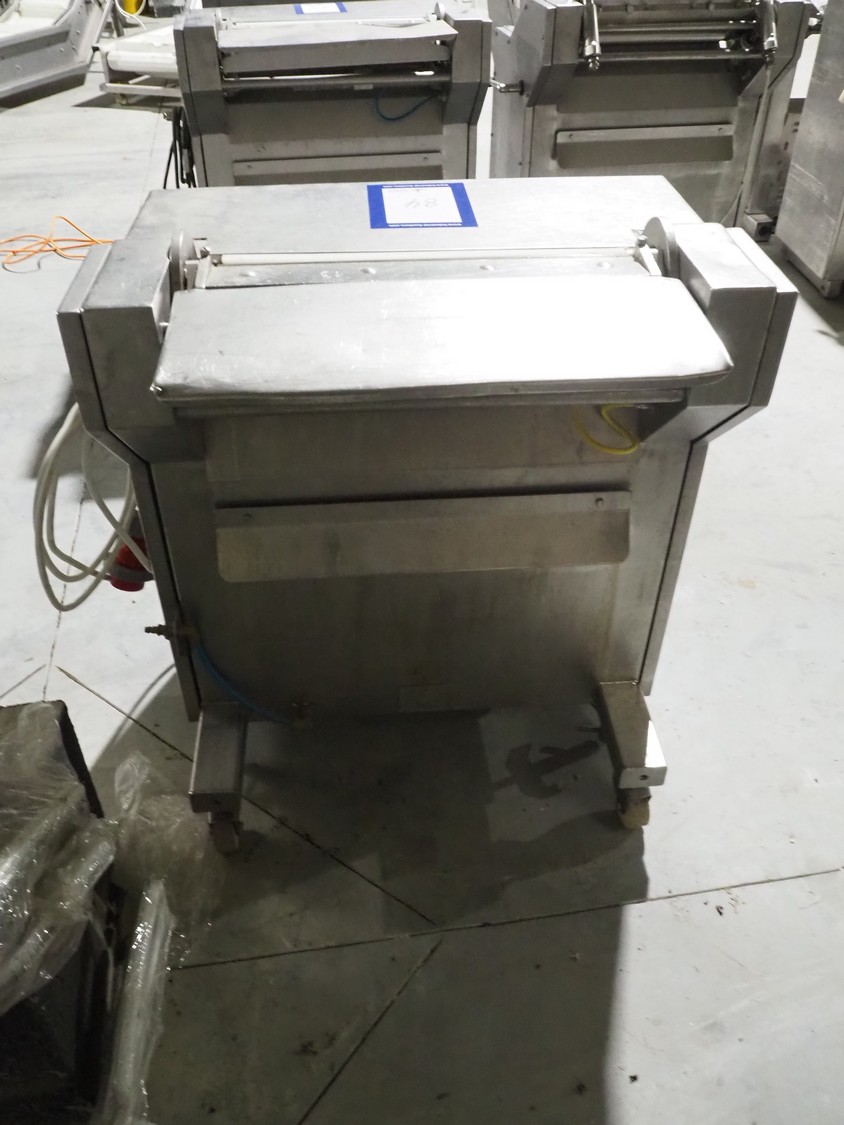 Townsend mobile skinning machine, model: 7500, serial number: 1179, year of construction: 1992, 380 V, 3 Ph, 50 Hz, 2.0 A, working width: 500 mm, foot control, total dimensions: 900 mm x 550 mm x 1100 mm.