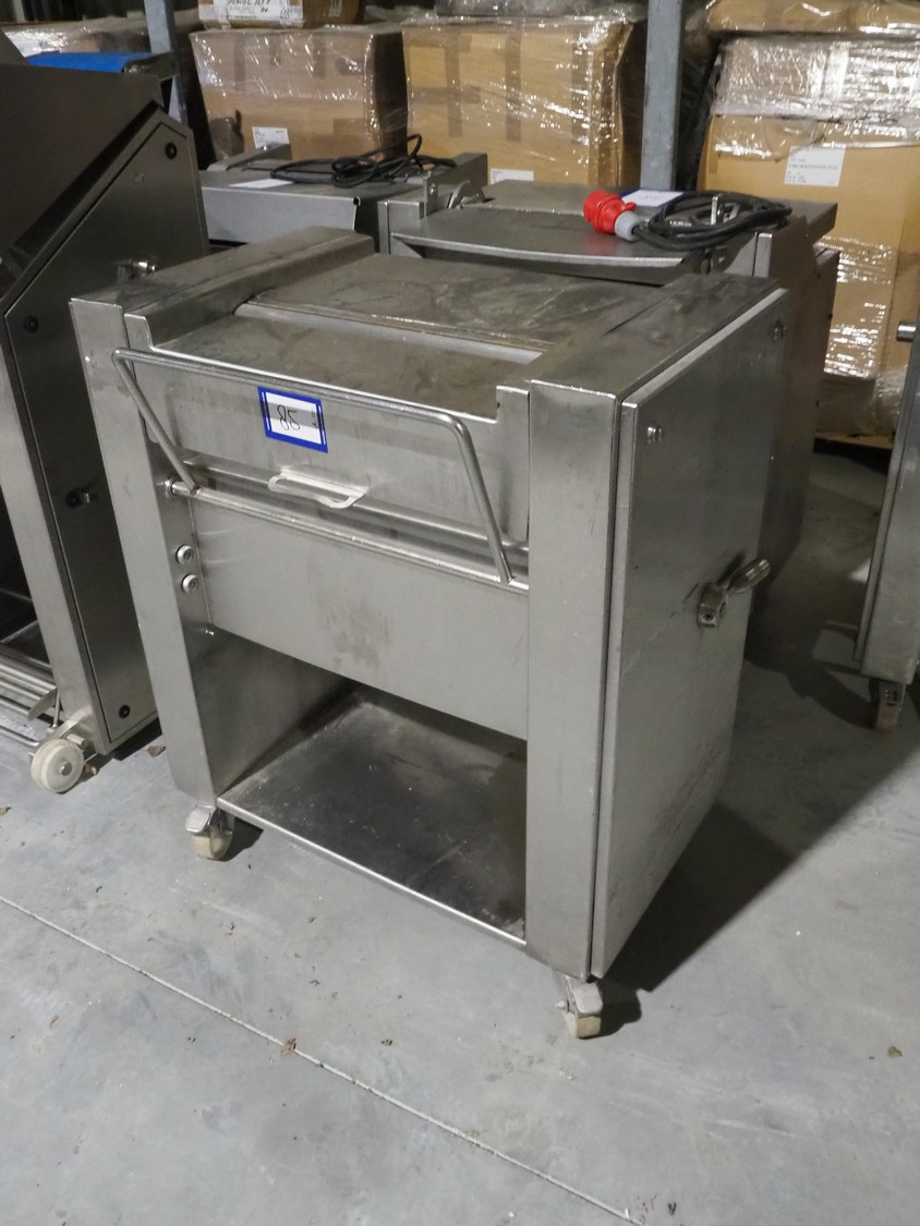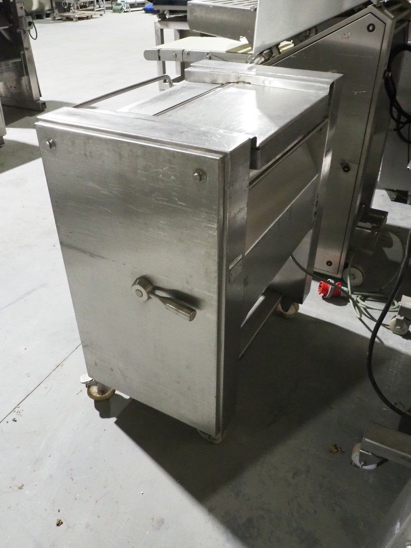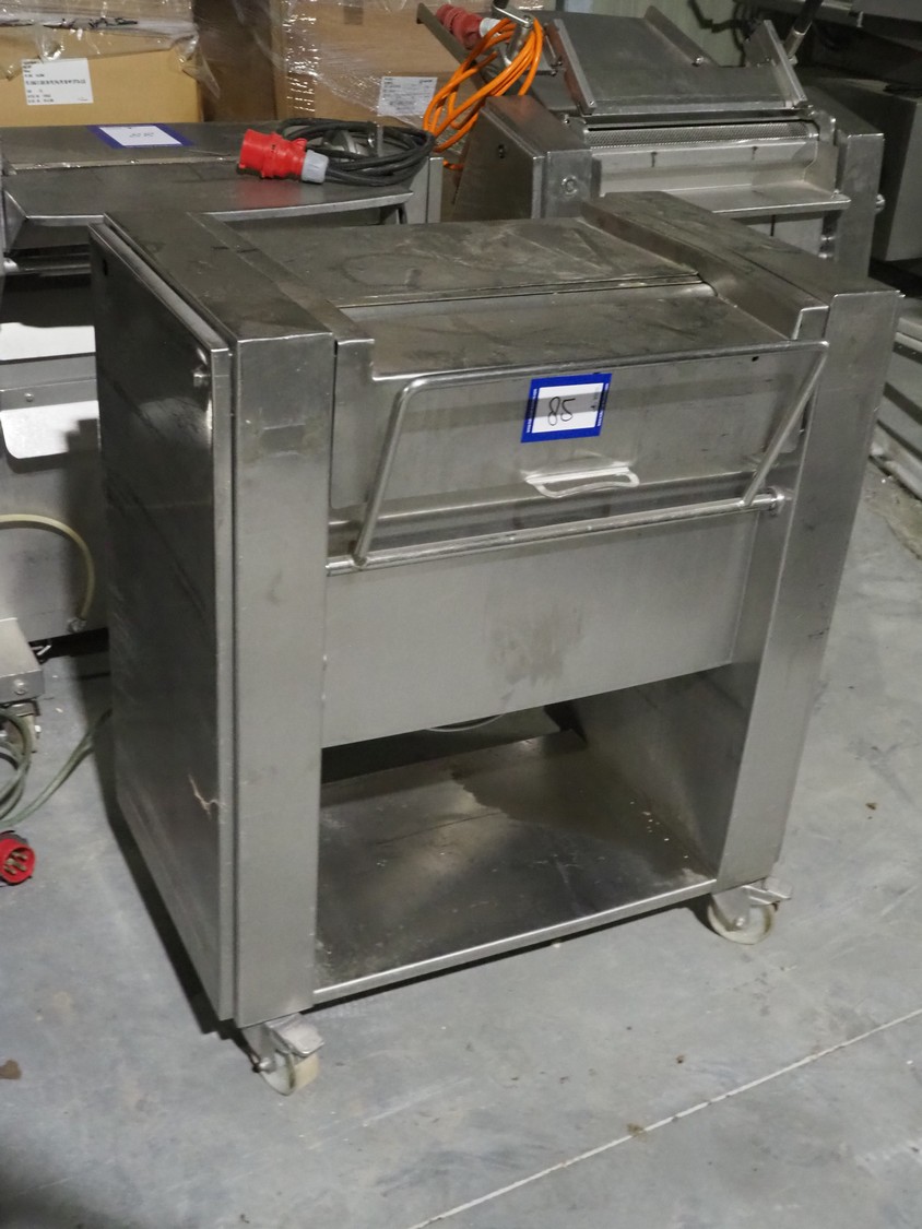 Weber Maschinenbau GmbH mobile skinning machine, type: ASE 570, number: 1472, 400 V, 50 Hz, 0.37 kW, working width: 520 mm, total dimensions: 900 mm x 600 mm x 1000 mm.
