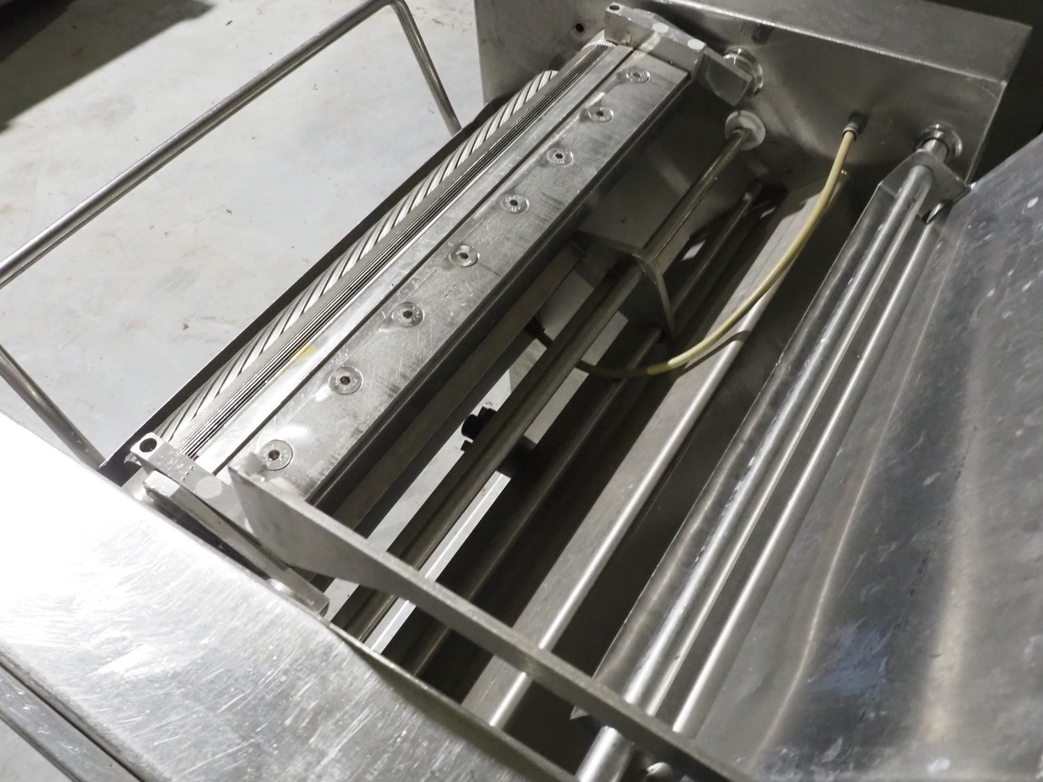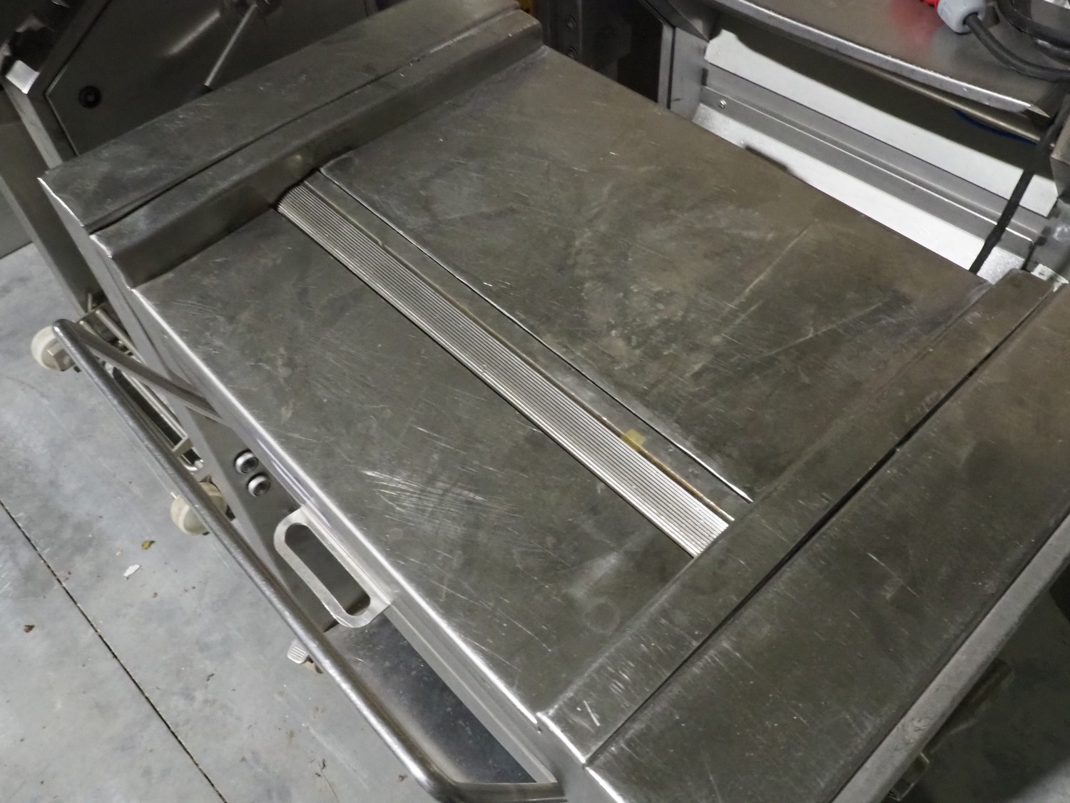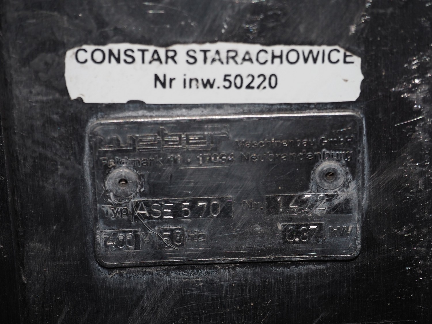 Weber Maschinenbau GmbH mobile skinning machine, type: ASE 570, number: 1472, 400 V, 50 Hz, 0.37 kW, working width: 520 mm, total dimensions: 900 mm x 600 mm x 1000 mm.