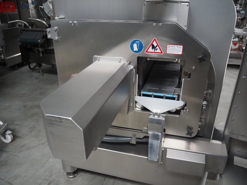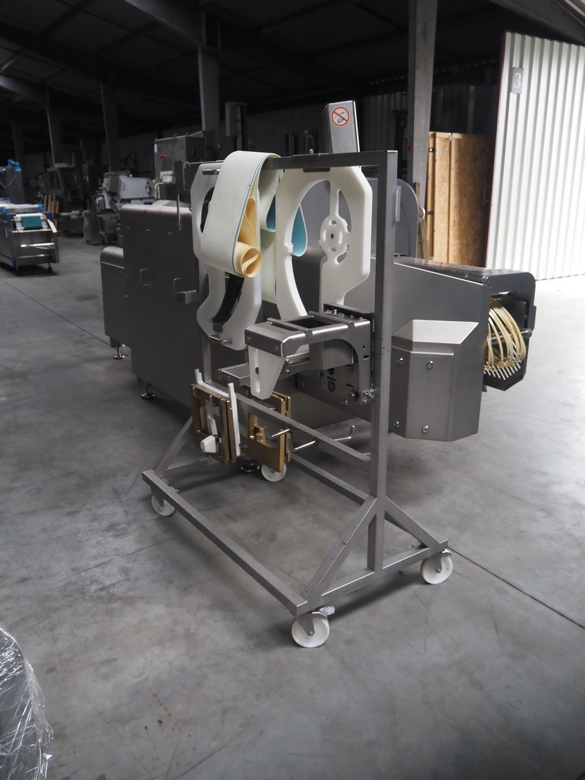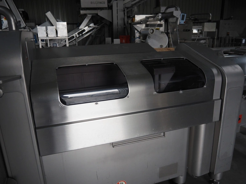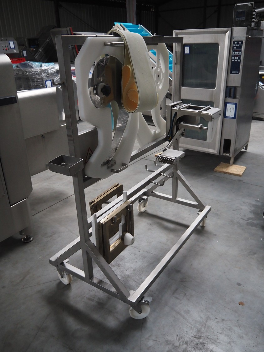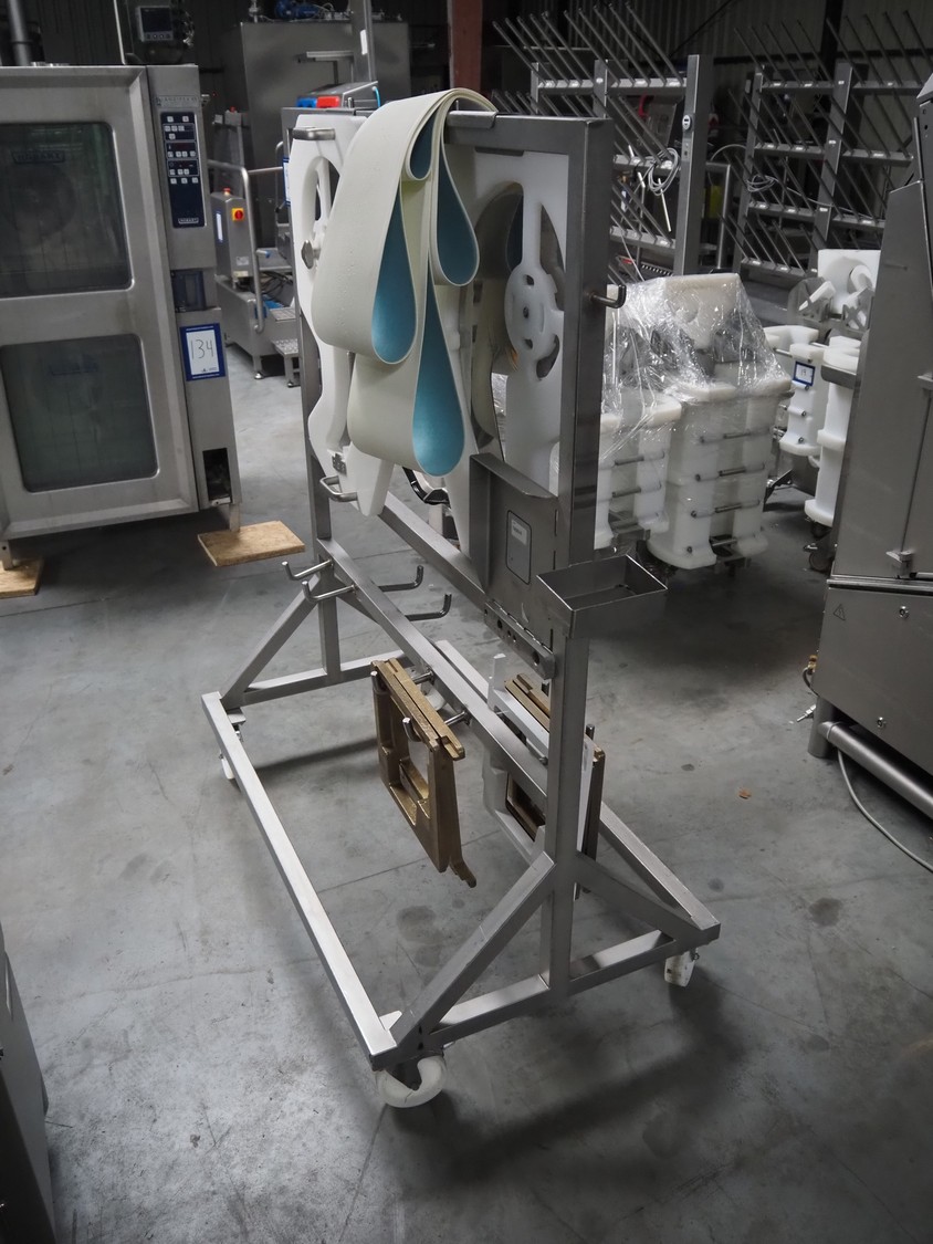 Treif Maschinenbau GmbH slicer and portion cutter, type: FALCON conti, machine number: 461005.154538.109916, year of construction: 2010, 24/380/480 V, 3 Ph, 50/60 Hz, 18/22/32 A, 8.6/11.7 kW, clearance: 260 mm x 220 mm, dimensions: 4300 mm x 1400 mm x 1900 mm. Without belt. Including s/s tool trolley with knife holders, dimensions trolley: 1400 mm x 750 mm x 1600 mm.