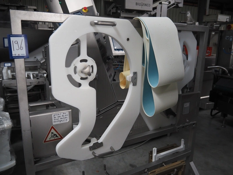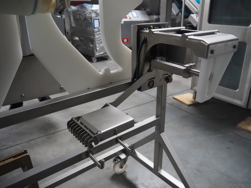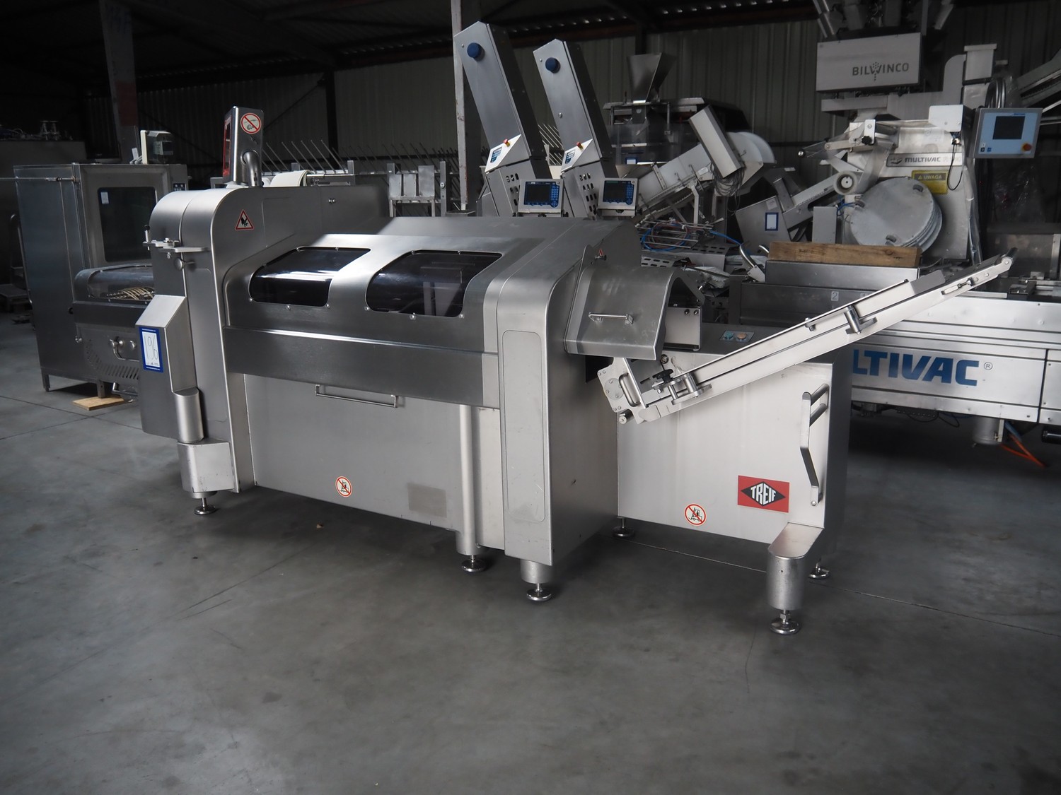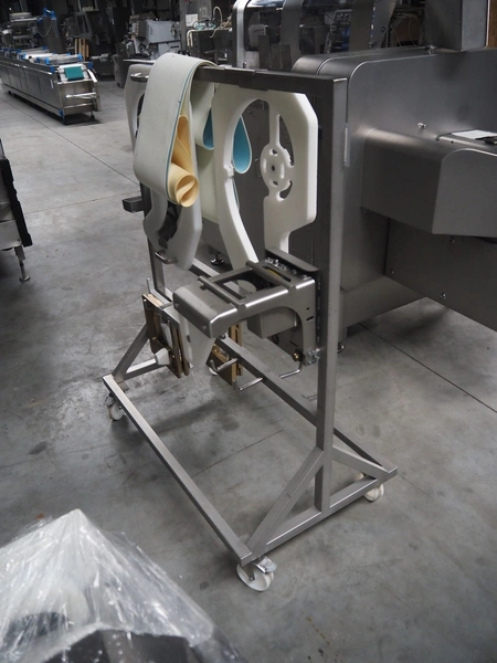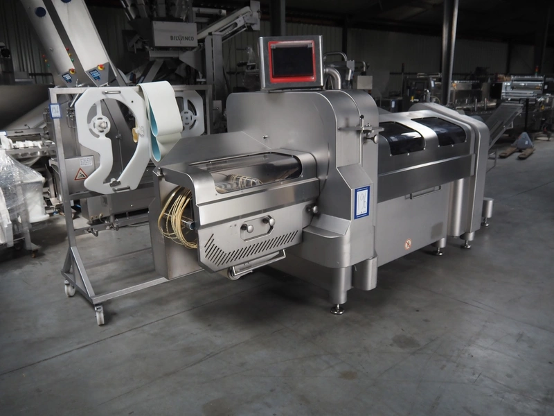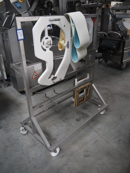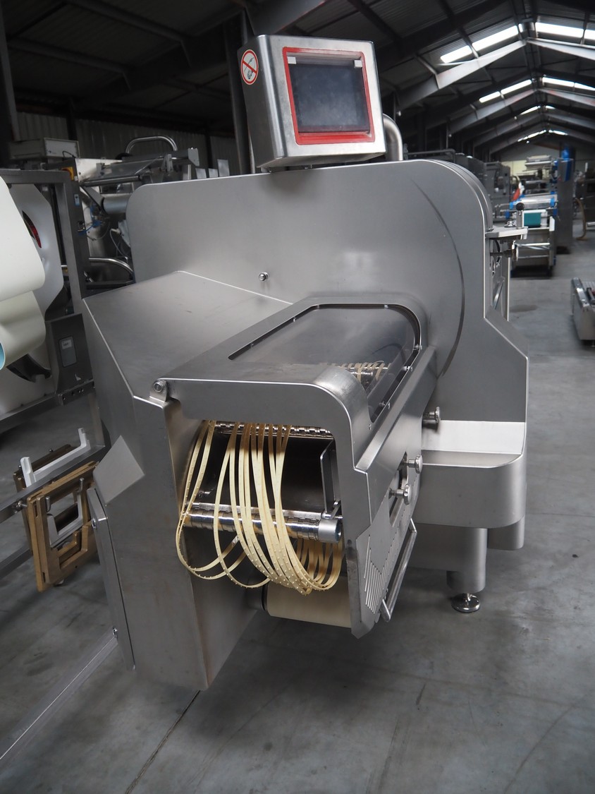 Treif Maschinenbau GmbH slicer and portion cutter, type: FALCON conti, machine number: 461005.154538.109916, year of construction: 2010, 24/380/480 V, 3 Ph, 50/60 Hz, 18/22/32 A, 8.6/11.7 kW, clearance: 260 mm x 220 mm, dimensions: 4300 mm x 1400 mm x 1900 mm. Without belt. Including s/s tool trolley with knife holders, dimensions trolley: 1400 mm x 750 mm x 1600 mm.