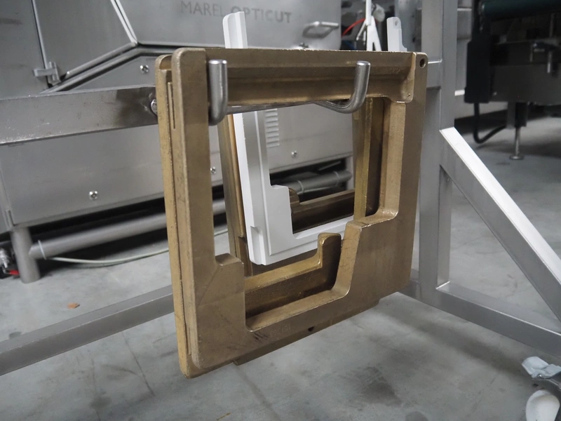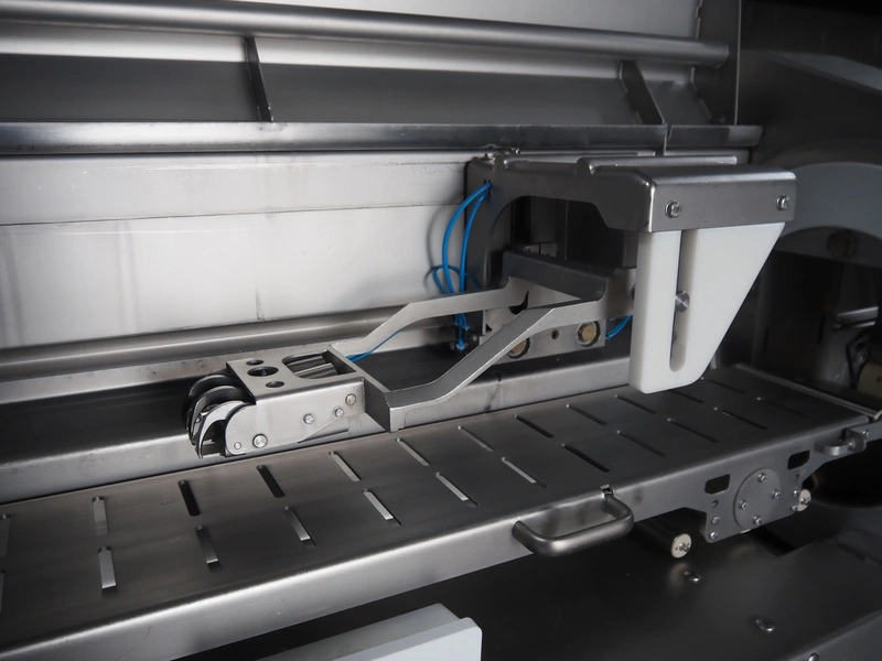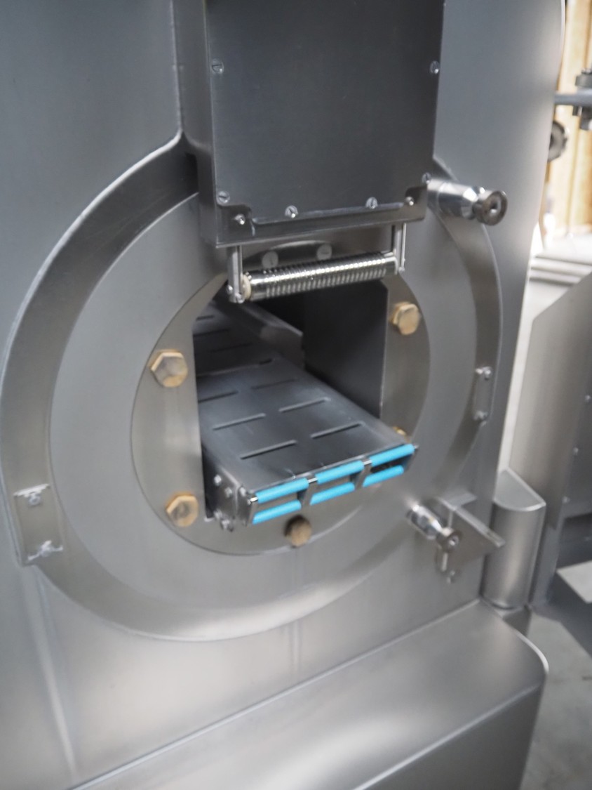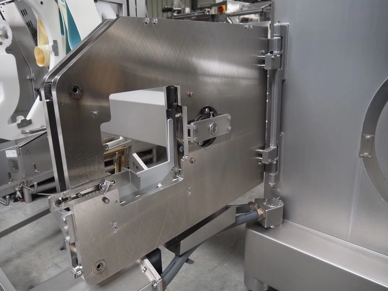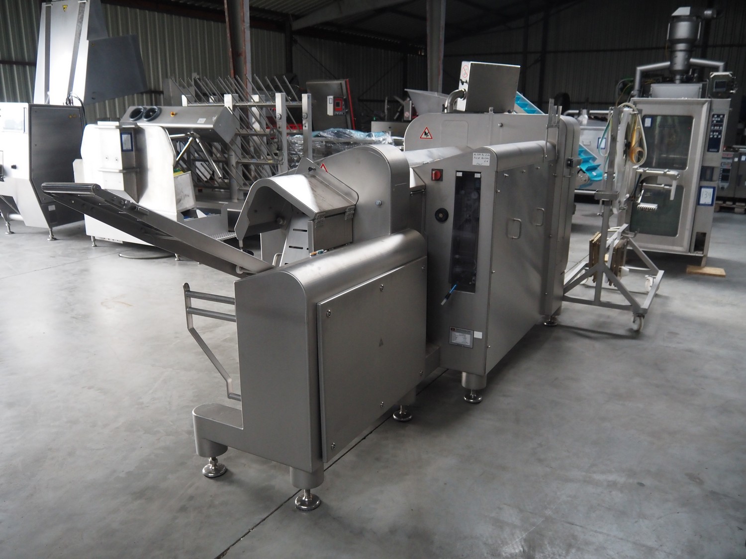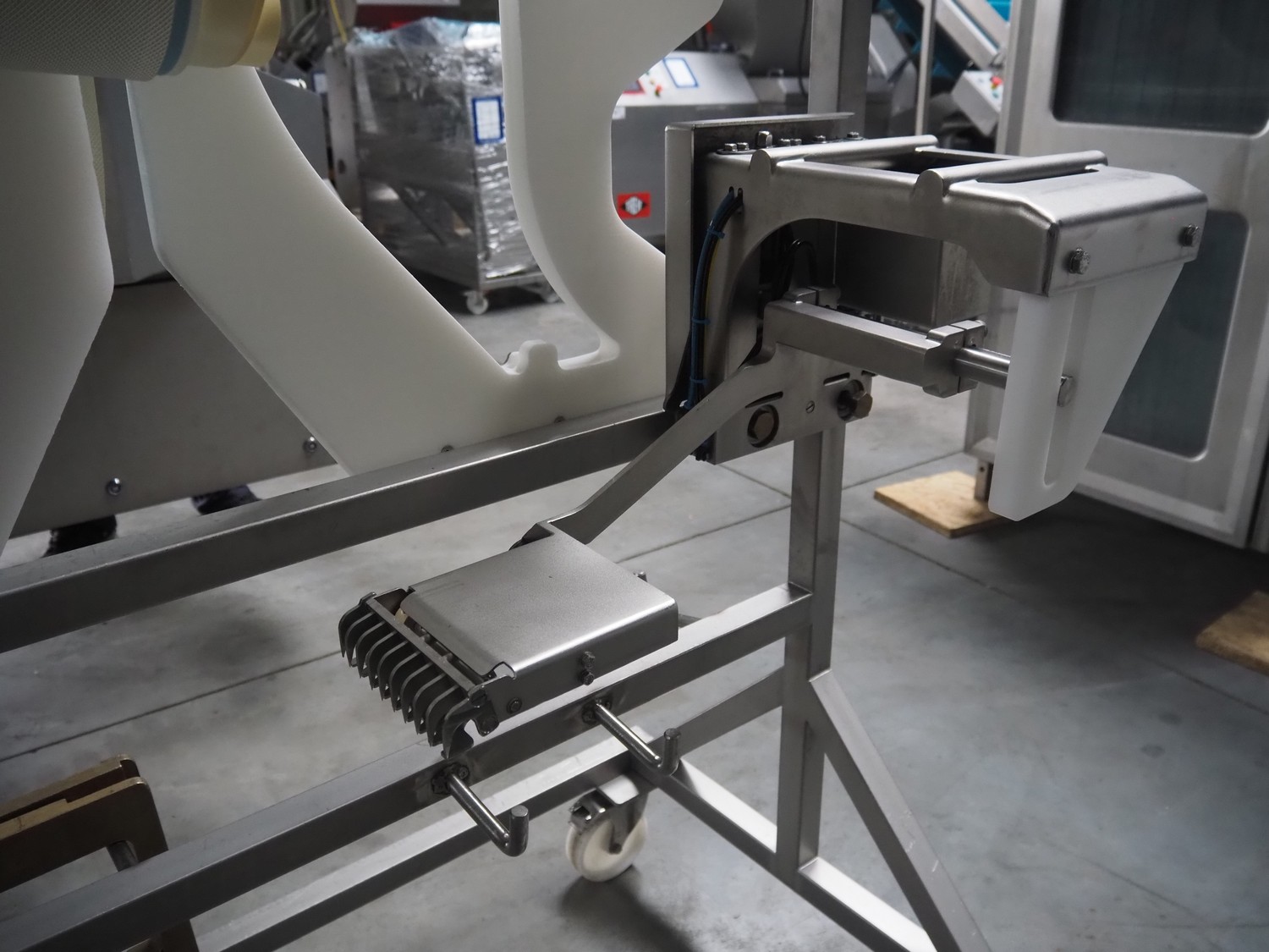 Treif Maschinenbau GmbH slicer and portion cutter, type: FALCON conti, machine number: 461005.154538.109916, year of construction: 2010, 24/380/480 V, 3 Ph, 50/60 Hz, 18/22/32 A, 8.6/11.7 kW, clearance: 260 mm x 220 mm, dimensions: 4300 mm x 1400 mm x 1900 mm. Without belt. Including s/s tool trolley with knife holders, dimensions trolley: 1400 mm x 750 mm x 1600 mm.