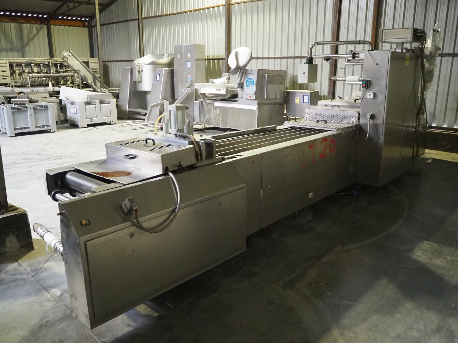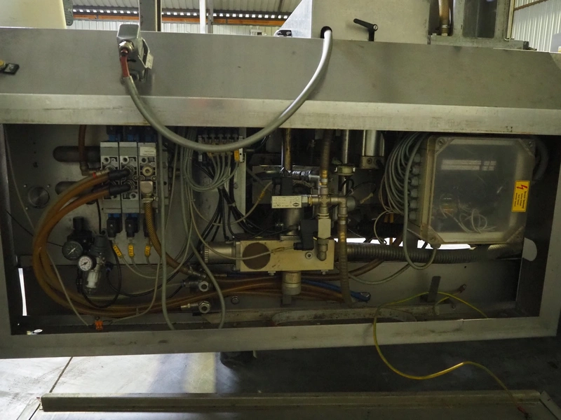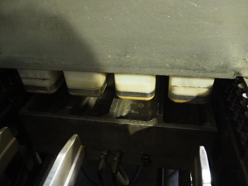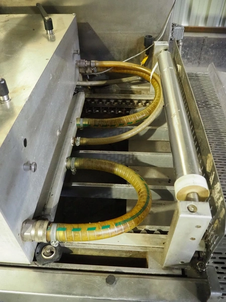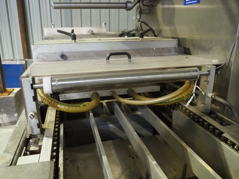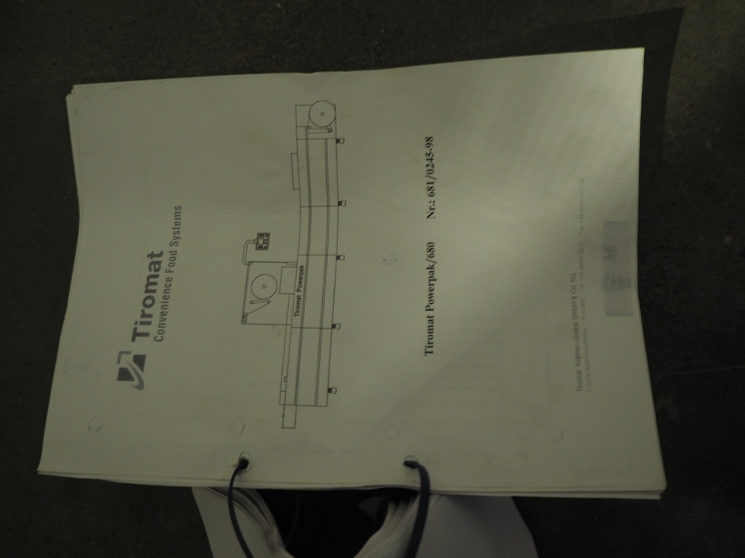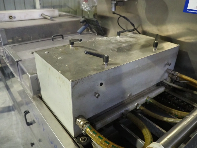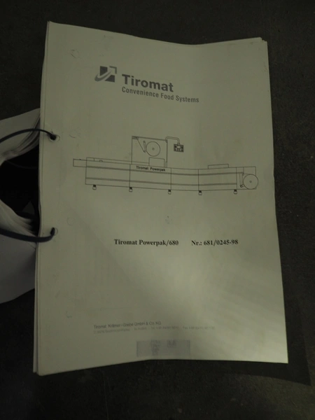 Tiromat thermoformer, type: Powerpack/680, number: 681/0245-98, dye: (4x) 250 mm x 115 mm, total dimensions: 7000 mm x 1300 mm x 2400 mm. Including outfeed belt, plastic belt, belt width: 600 mm, dimensions: 1500 mm x 800 mm x 600 mm. Without vacuum pump.