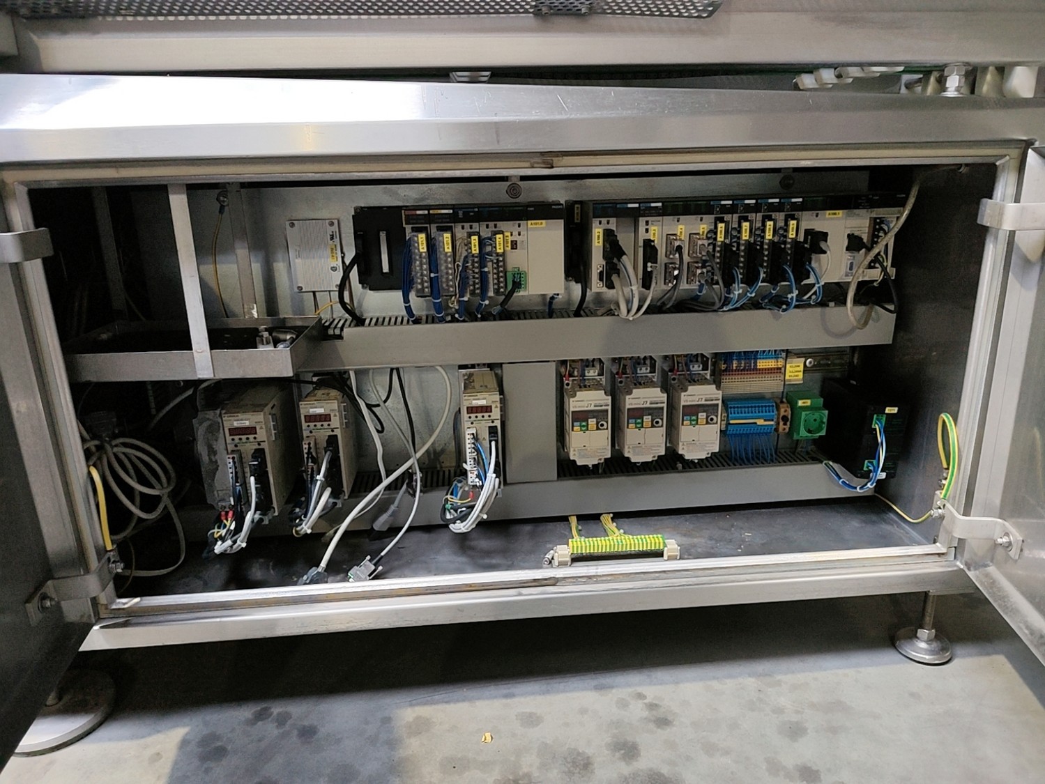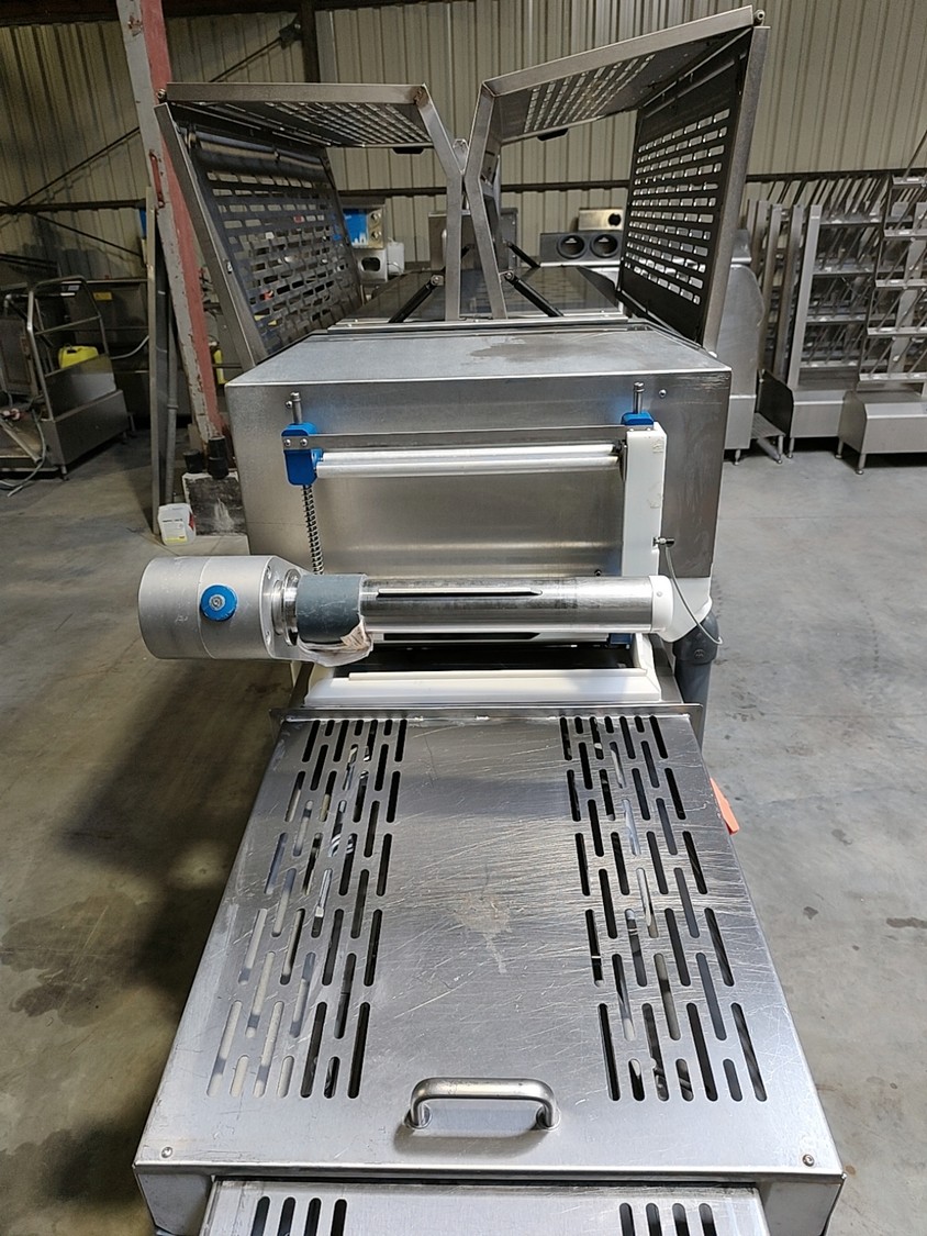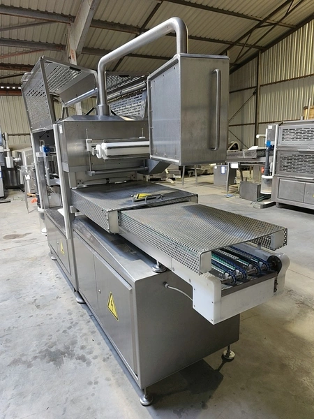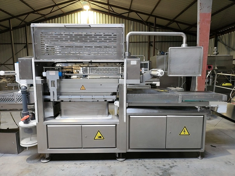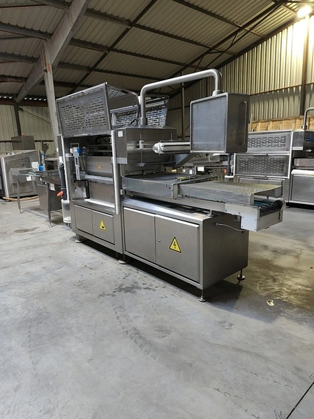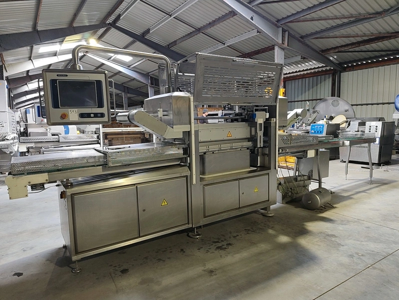Sealpac traysealer, model: 800+, serial number: TVG 01 1124 01, year of construction: 2004, 400 / 230 V, 3 Ph, 50 Hz, 10 kW, weight: 2000 kg, dye dimensions: (6x) 170 mm x 130 mm, total dimensions: 6600 mm x 900 mm x 2200 mm. Including trolley for dyes, dimensions 1600 mm x 1000 mm x 1400 mm.