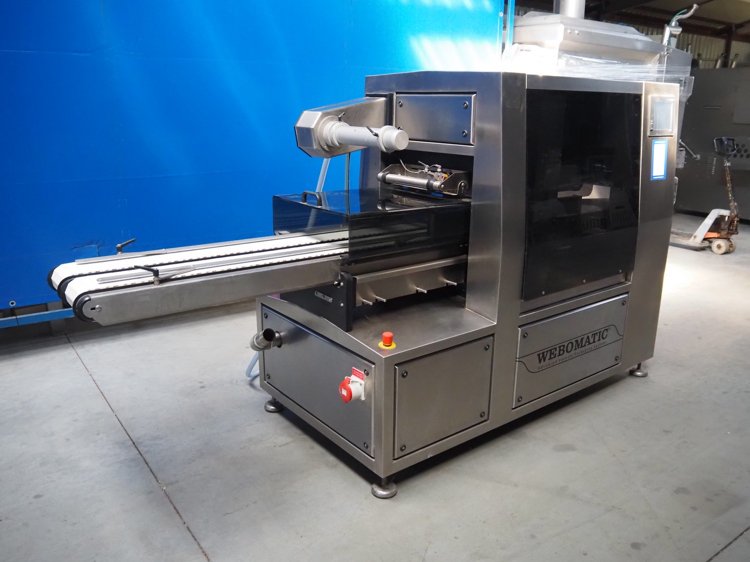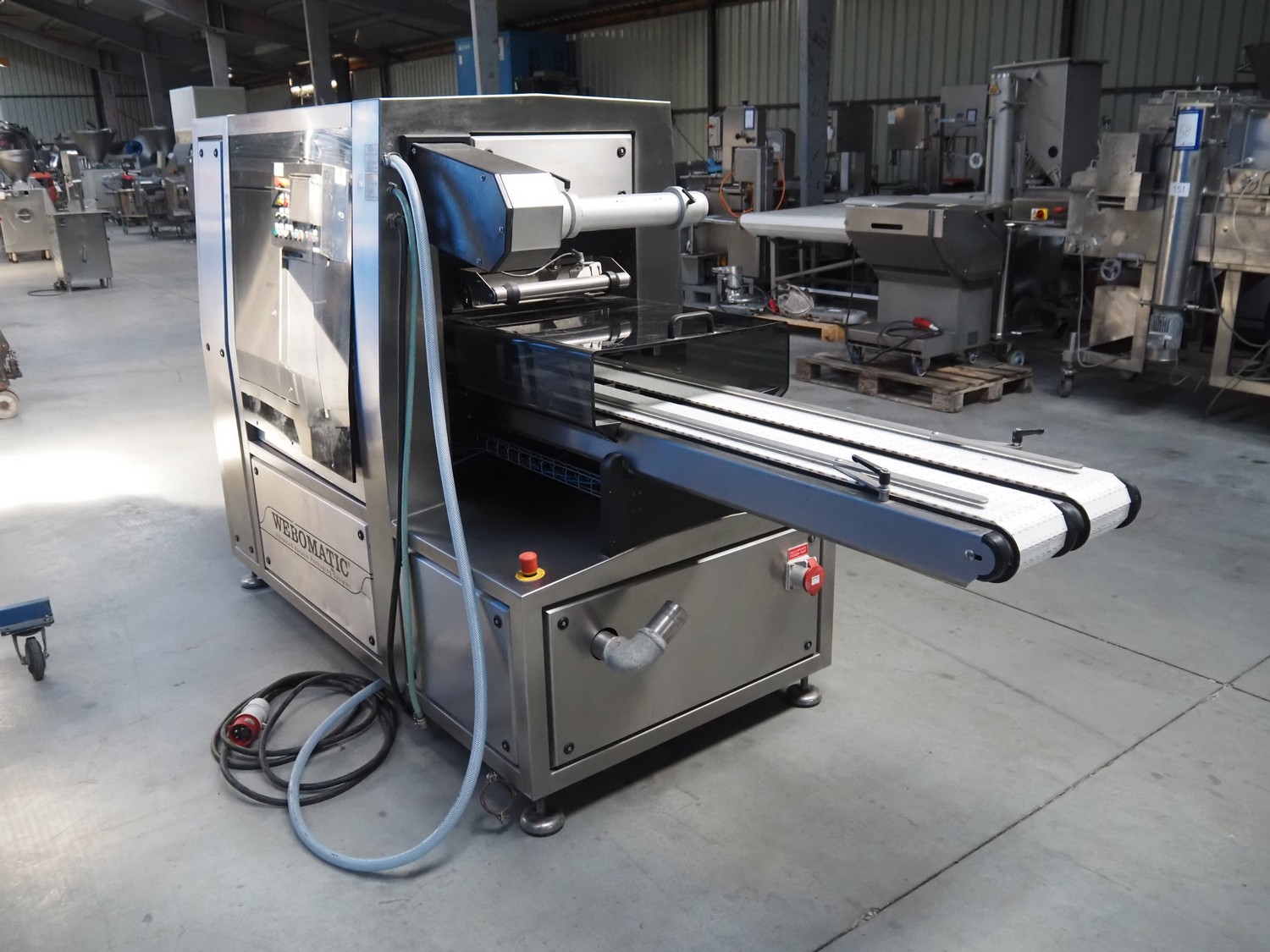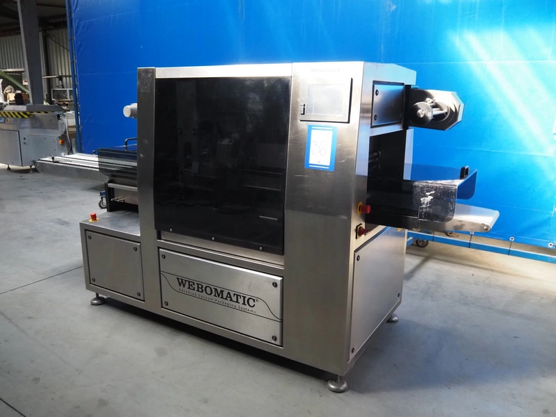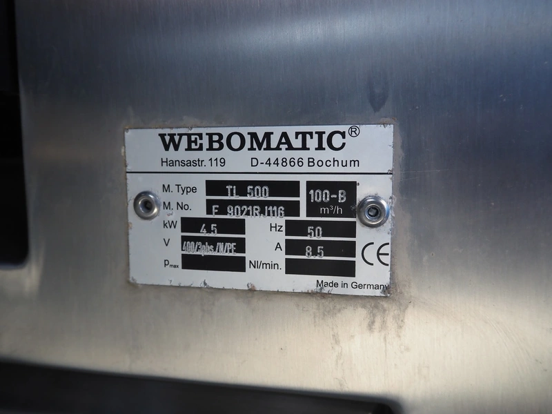 Webomatic traysealer, type: TL 500, machine number: F 9021RJ116, 400 V, 3 Ph, 50 Hz, 8.5 A, 4.5 kW, 100-B m3/h, plastic mesh belt, belt width: (2x) 150 mm, dye: (2x) 155 mm x 200 mm, plastic belt, belt width: 320 mm, total dimensions: 3500 mm x 1060 mm x 1570 mm. Without vacuum pump.