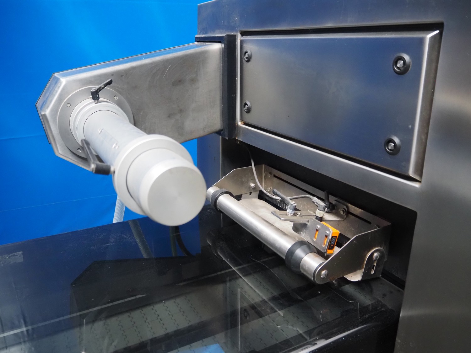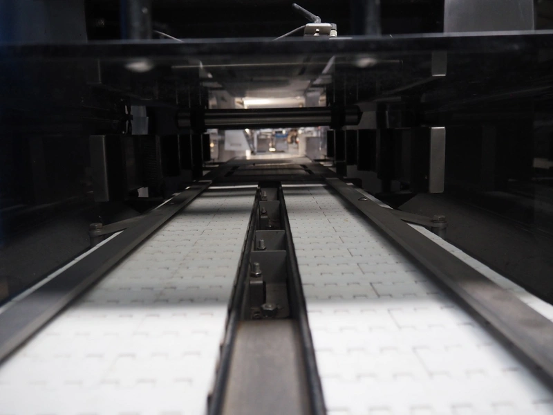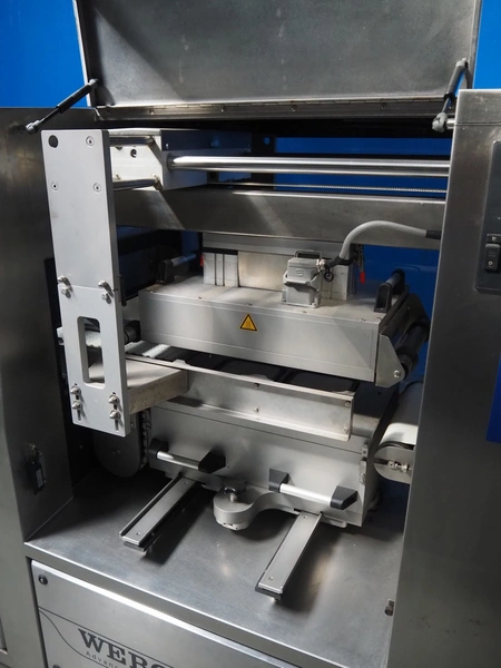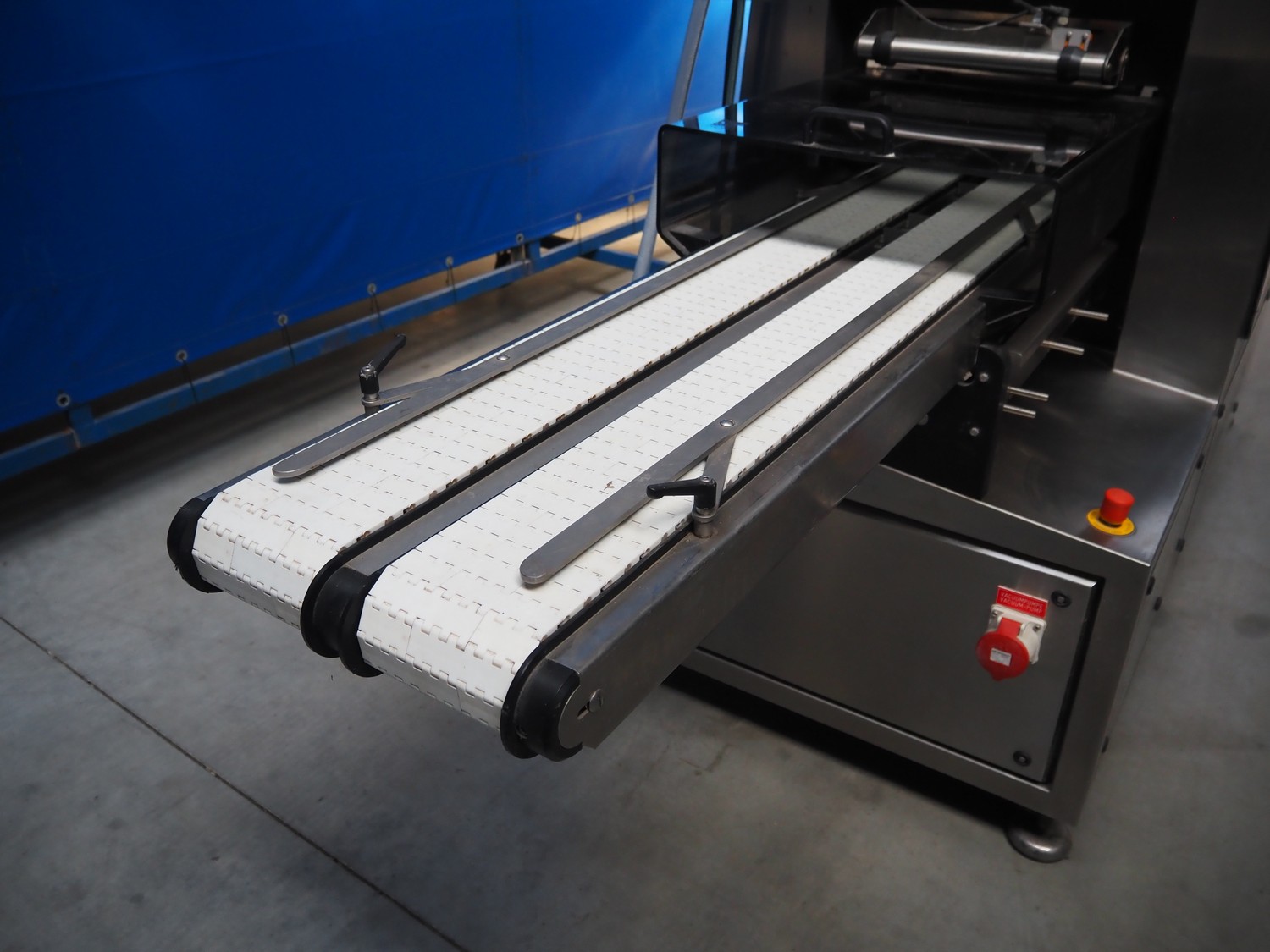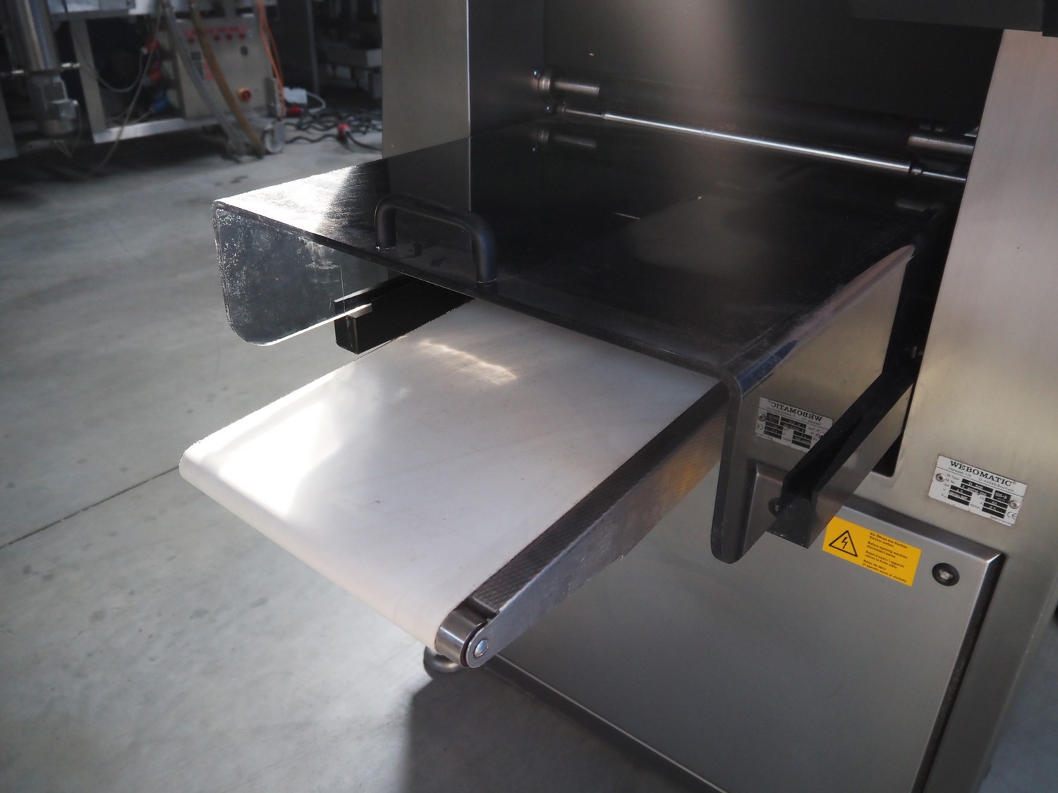 Webomatic traysealer, type: TL 500, machine number: F 9021RJ116, 400 V, 3 Ph, 50 Hz, 8.5 A, 4.5 kW, 100-B m3/h, plastic mesh belt, belt width: (2x) 150 mm, dye: (2x) 155 mm x 200 mm, plastic belt, belt width: 320 mm, total dimensions: 3500 mm x 1060 mm x 1570 mm. Without vacuum pump.