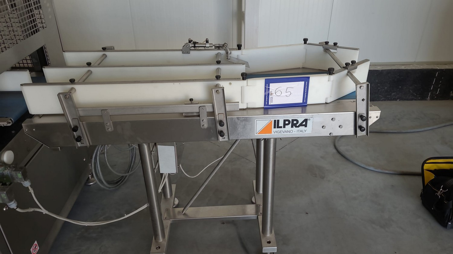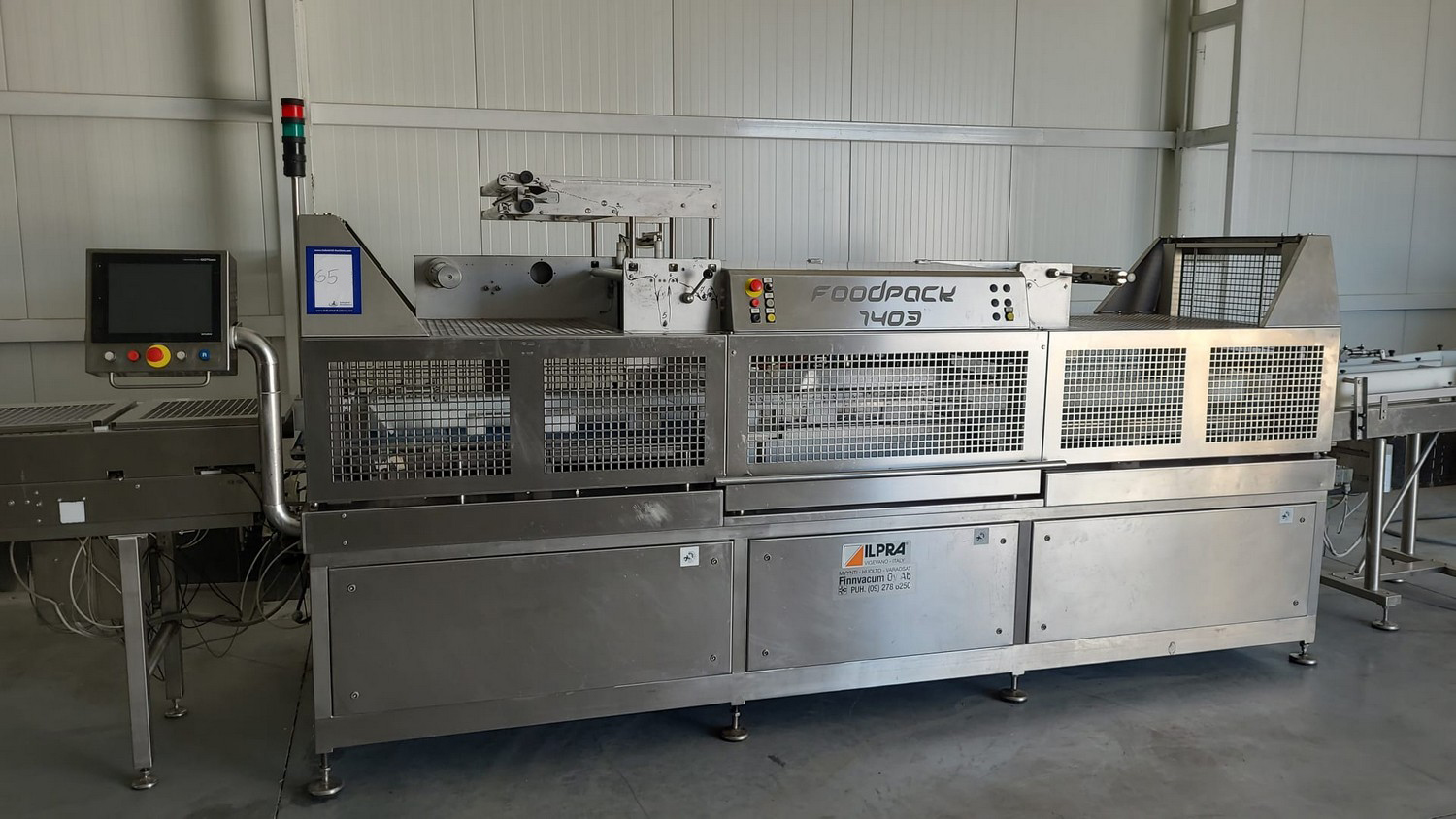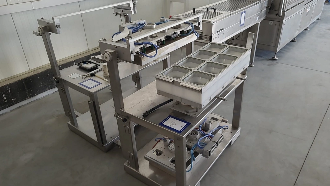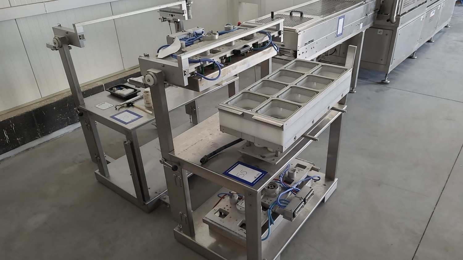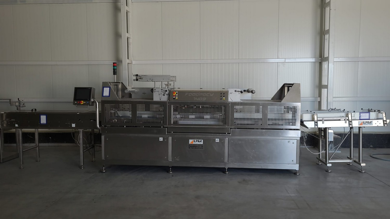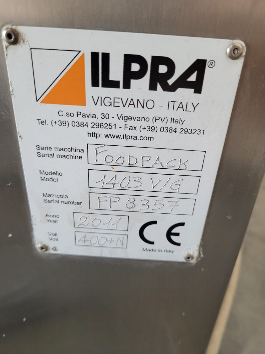Ilpra traysealer, model: 1403 V/G, serial number: FP 8357, year of construction: 2011, 400 V, dye: (6x) 250 mm x 170 mm, total dimensions: 7500 mm x 1400 mm x 2200 mm. Including 2 trolleys with dye and extra parts, dye: (8x) 170 mm x 155 mm.
