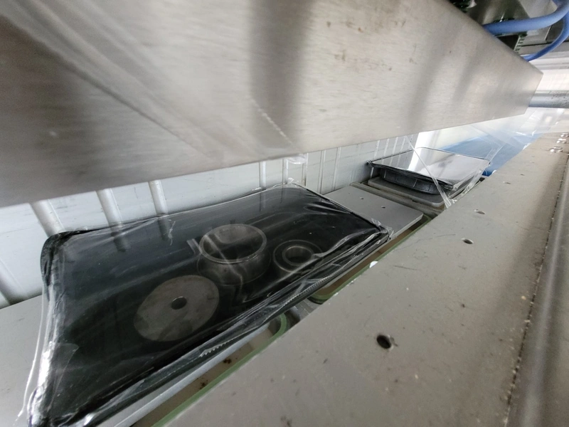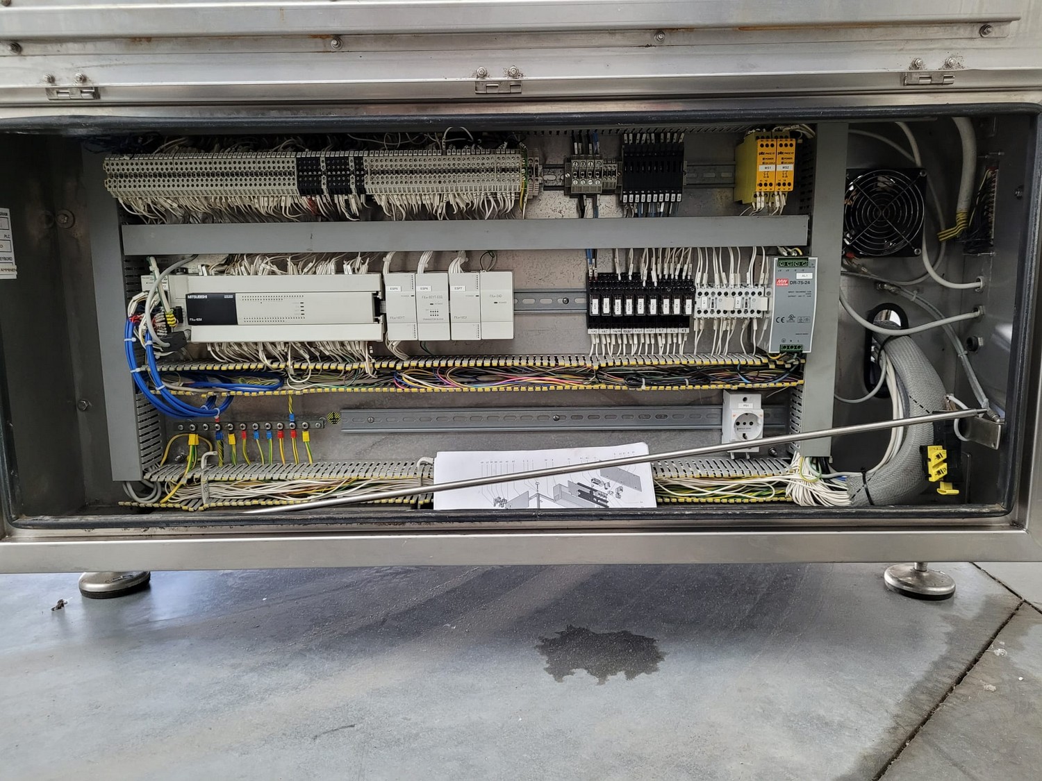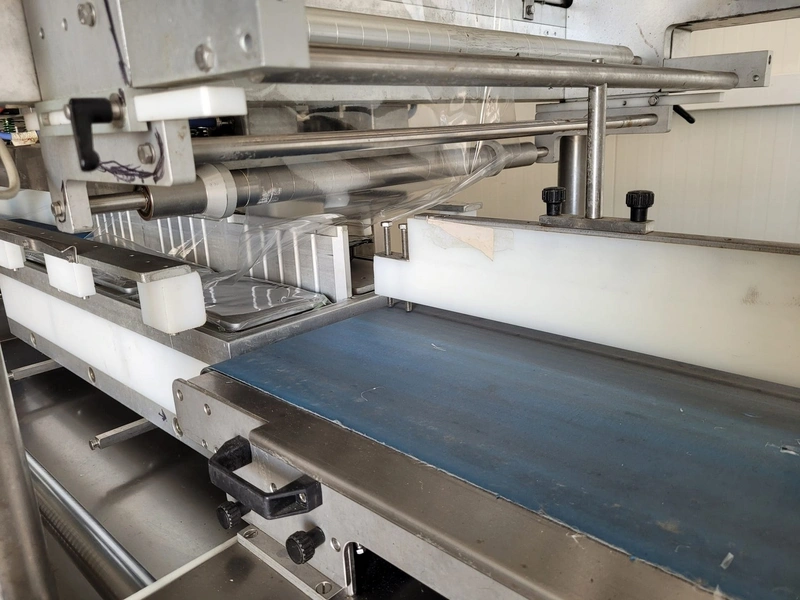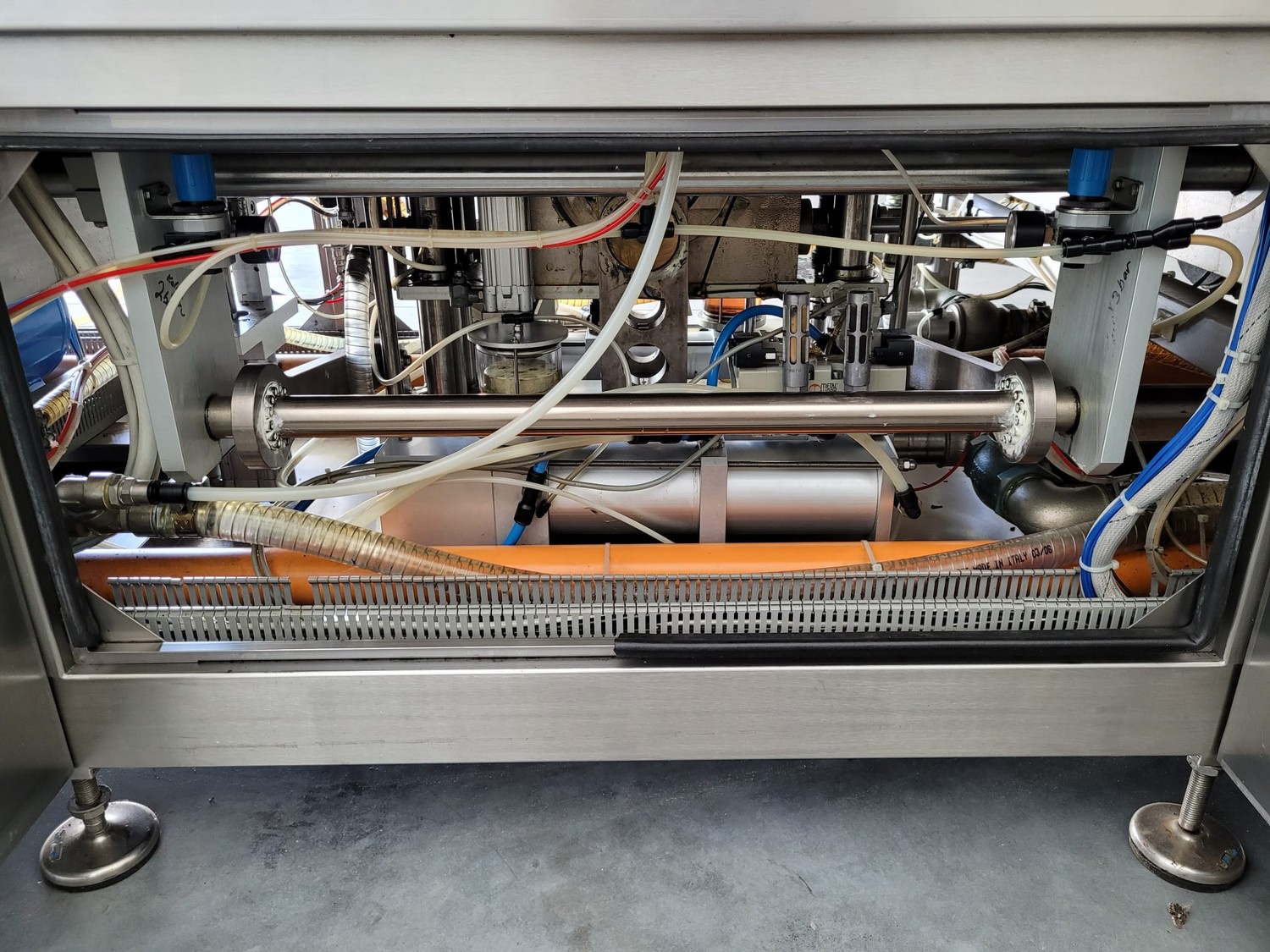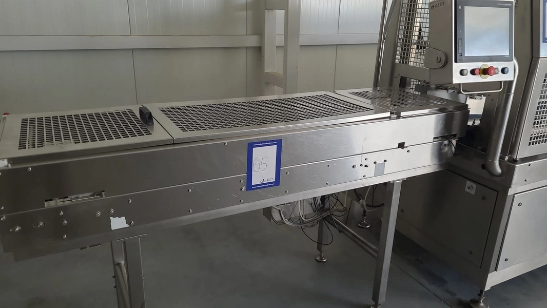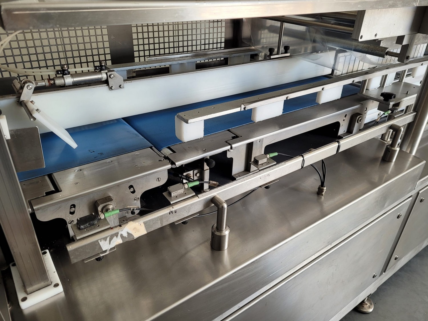 Ilpra traysealer, model: 1403 V/G, serial number: FP 8357, year of construction: 2011, 400 V, dye: (6x) 250 mm x 170 mm, total dimensions: 7500 mm x 1400 mm x 2200 mm. Including 2 trolleys with dye and extra parts, dye: (8x) 170 mm x 155 mm.