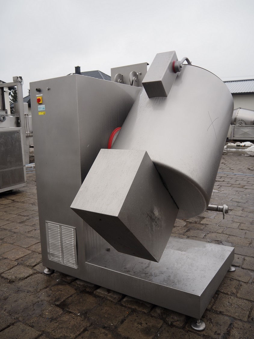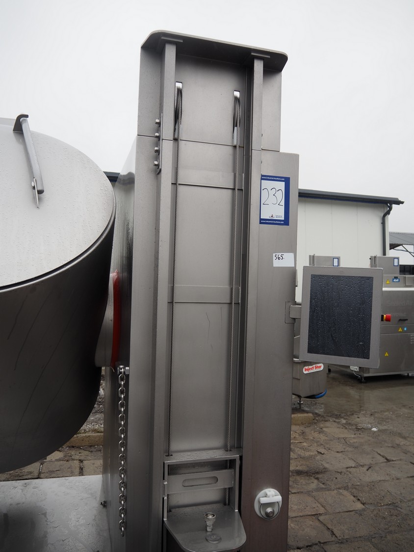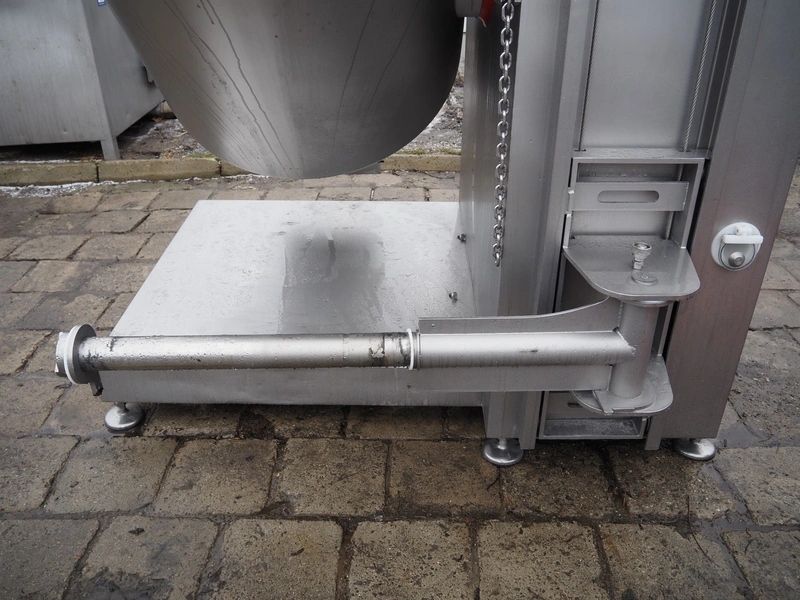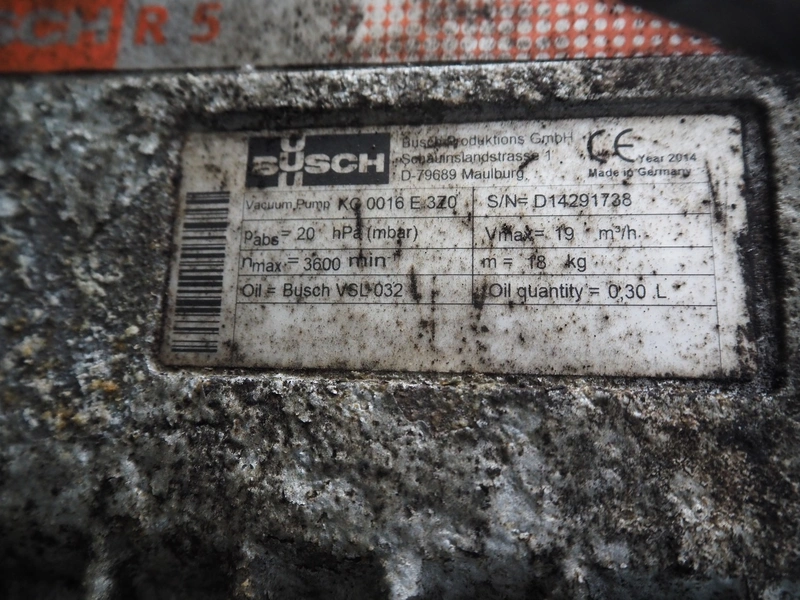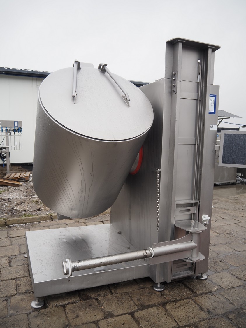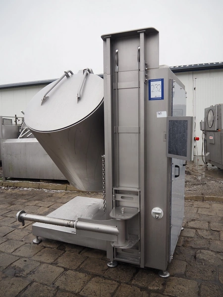 Rühle tumbler with lifter for 200 liter meat bins, type: MGR 900, serial number: 0140, year of construction: 2014, 400 V, 3 Ph, 50/60 Hz, 31.4 A, 16.1 kW, capacity: 900 liter, with Busch vacuum pump, type: KG0016 E 3z0, serial number: D14291738, Vmax = 19 m³/h, total dimensions: 2000 mm x 2200 mm x 2450 mm. Missing parts of lifting arm.