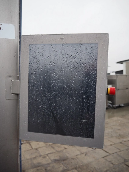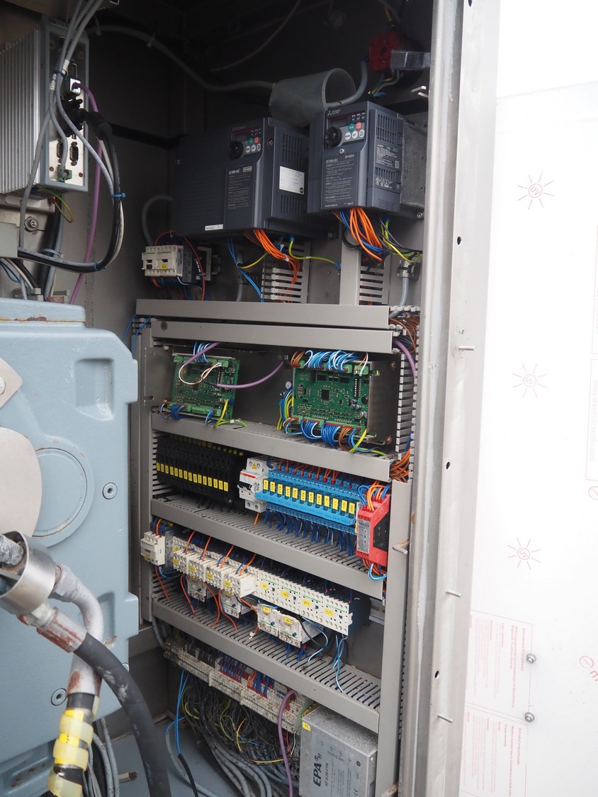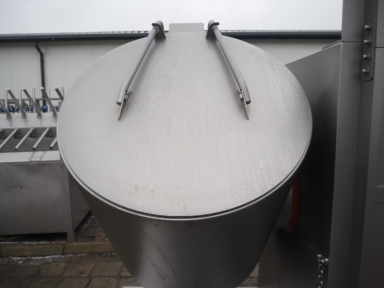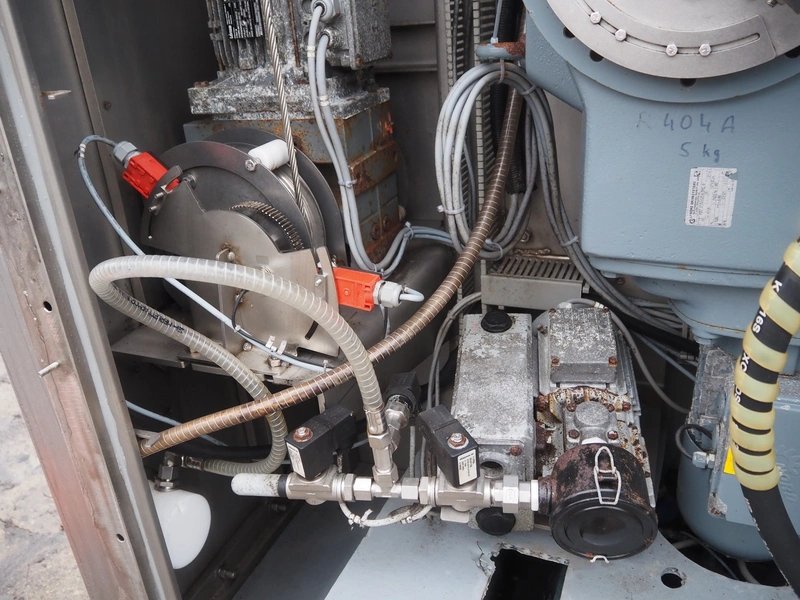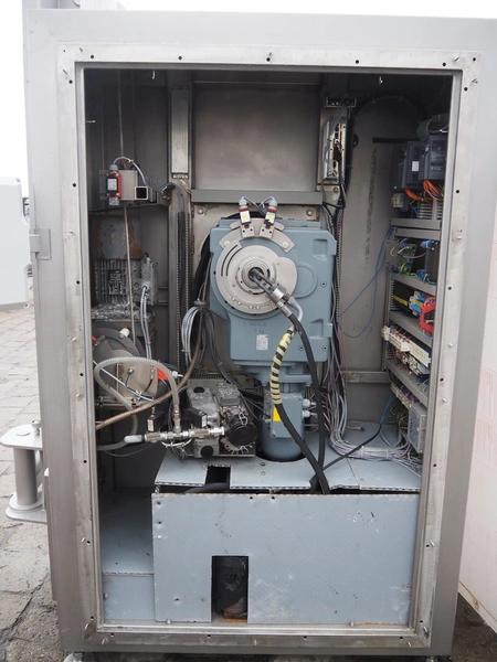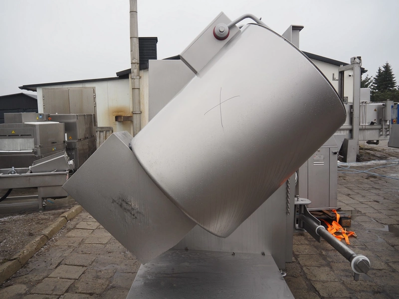 Rühle tumbler with lifter for 200 liter meat bins, type: MGR 900, serial number: 0140, year of construction: 2014, 400 V, 3 Ph, 50/60 Hz, 31.4 A, 16.1 kW, capacity: 900 liter, with Busch vacuum pump, type: KG0016 E 3z0, serial number: D14291738, Vmax = 19 m³/h, total dimensions: 2000 mm x 2200 mm x 2450 mm. Missing parts of lifting arm.