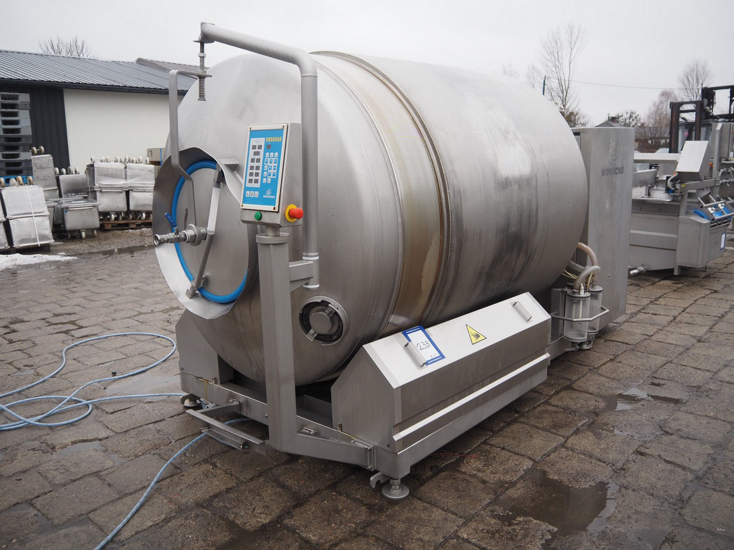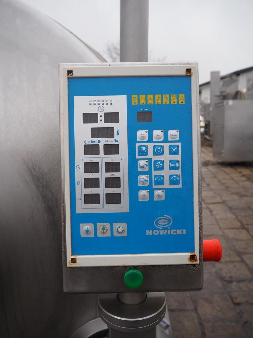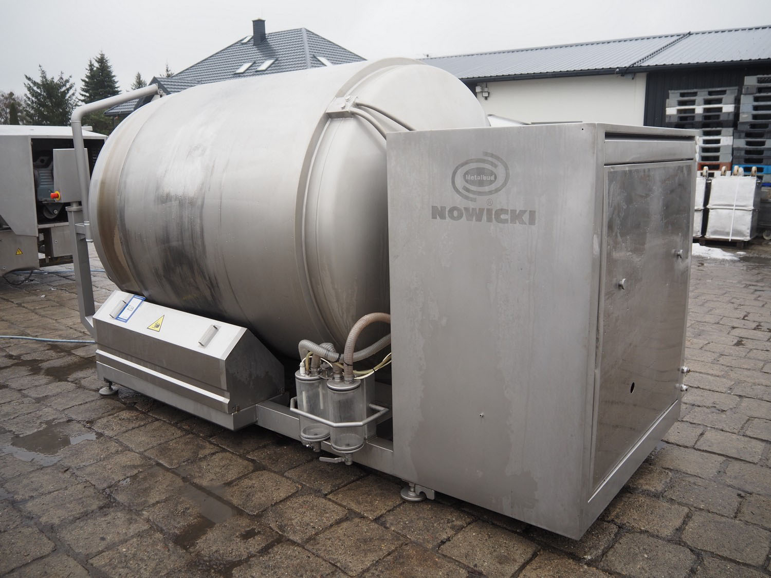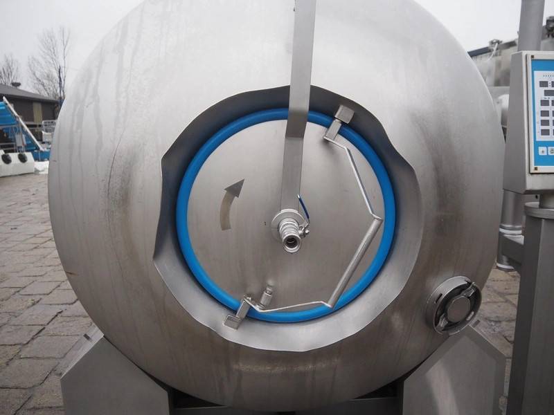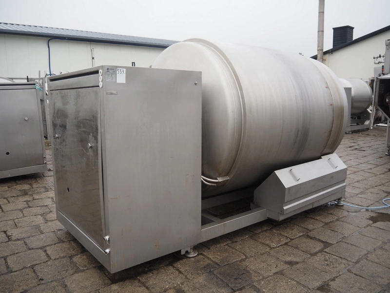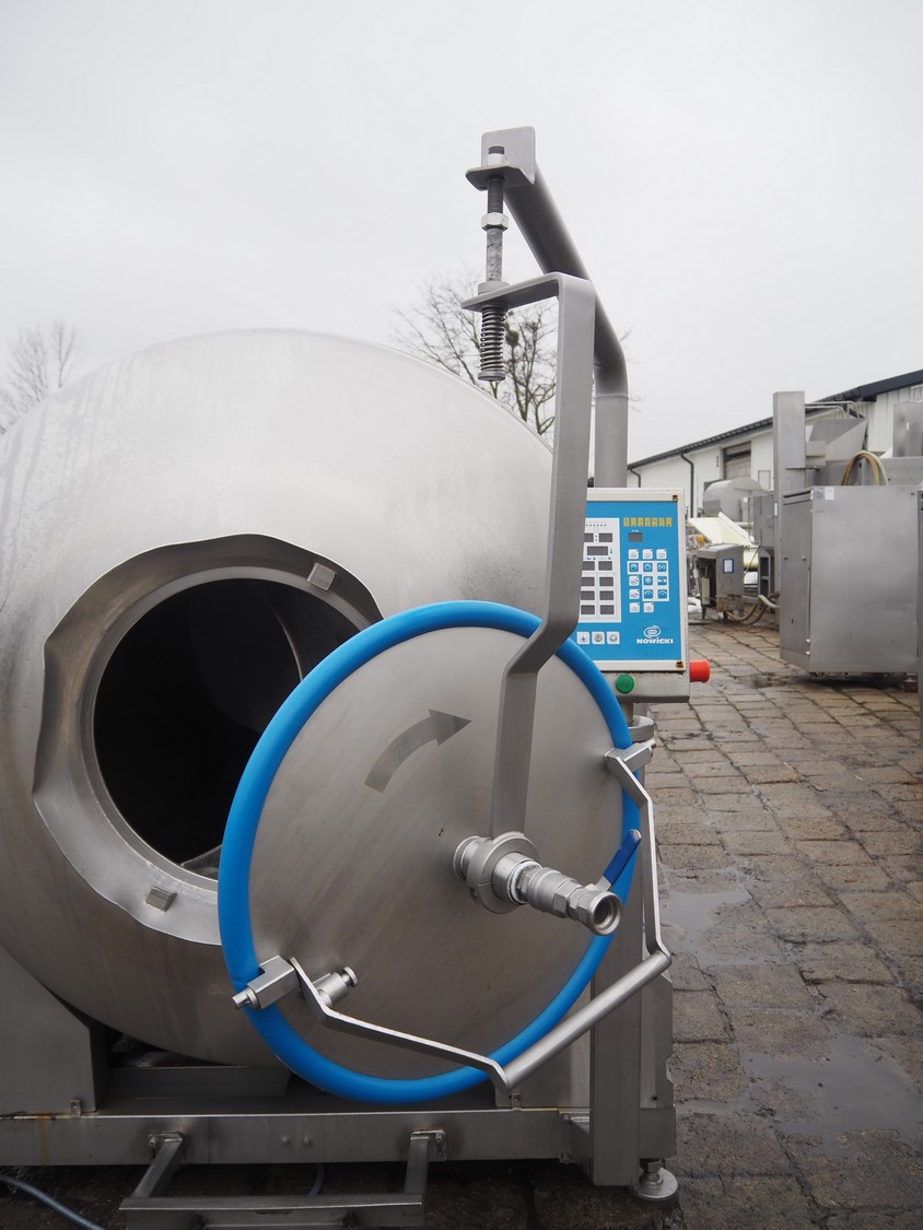 Nowicki s/s vacuum tumbler, type: MA-3600 PSCH, serial number: 22703025, year of construction 2003, 400 V, 3 Ph, 5.3 / 11.1 kW, capacity: 3600 liter, weight: 2000 kg, clearance: Ø 600 mm, with Busch vacuum pump, type: RC 0063 E 501, serial number: 03007773, 20 hPa, total dimensions: 3200 mm x 1750 mm x 2050 mm.