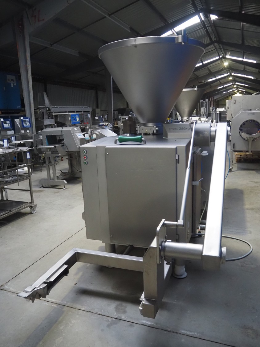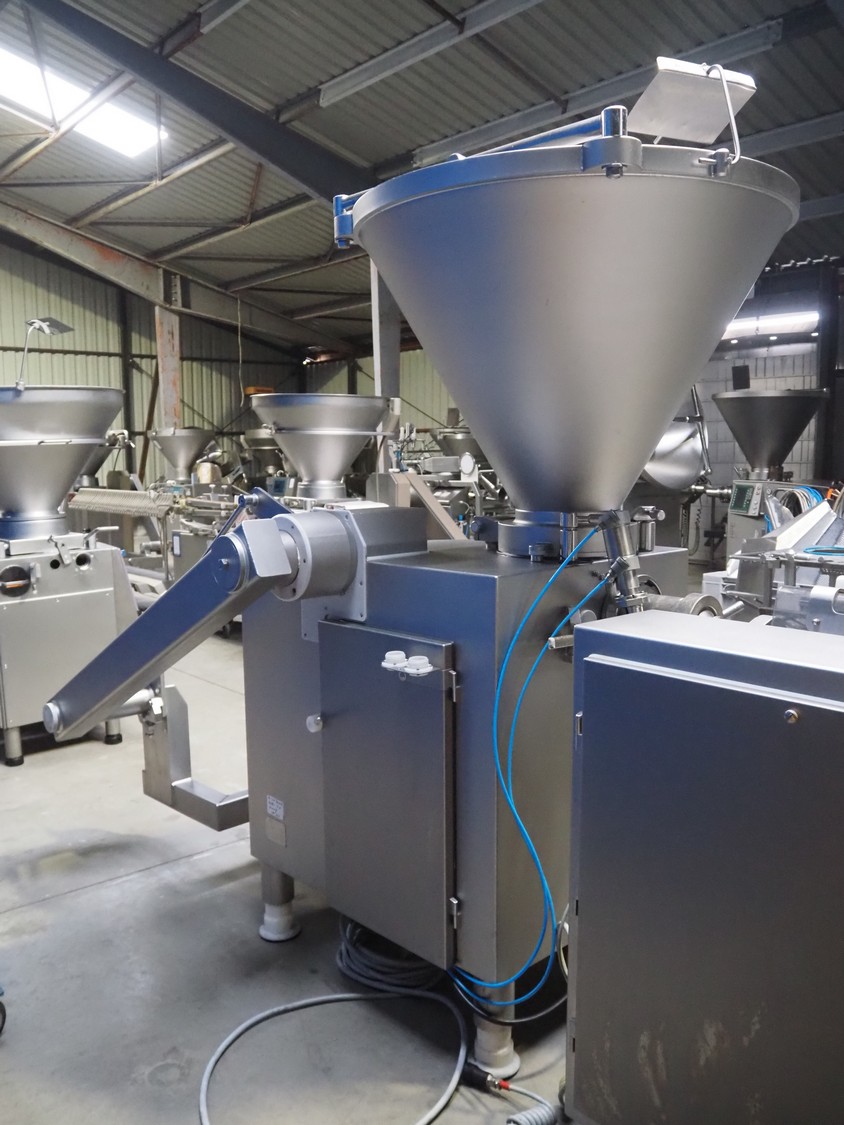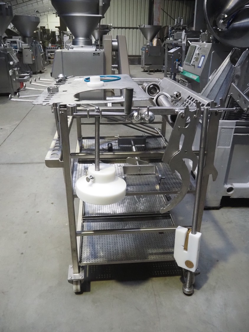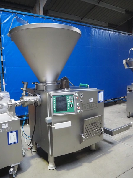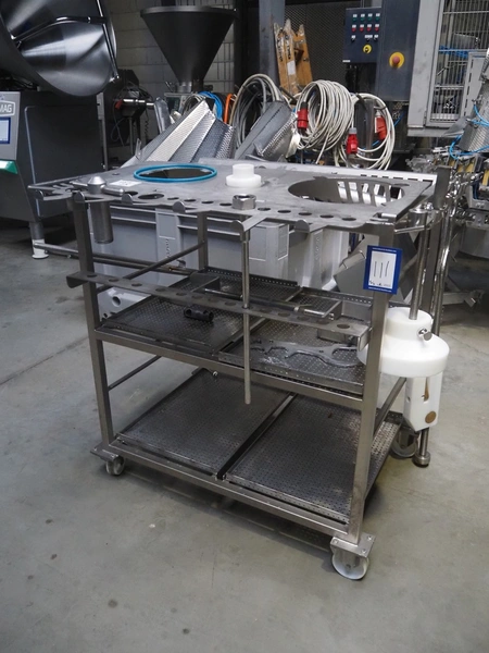 Vemag Maschinenbau GmbH vacuum filling machine with lifter for 200 liter meat bins, model: PH20E, number: 1630774, year of construction: 2015, 400-460 V, 3 Ph, 50/60 Hz, 38 A, 23 kW, dimensions: 2200 mm x 1400 mm x 2130 mm. Including s/s tool trolley.