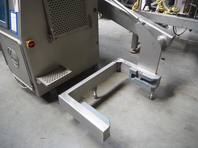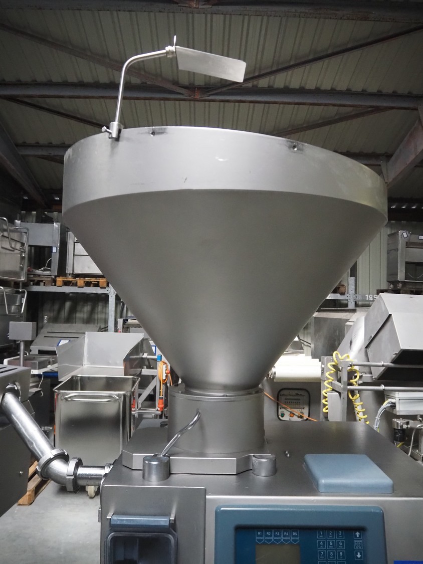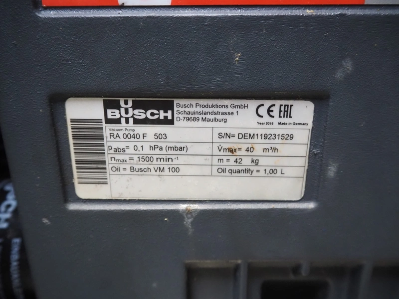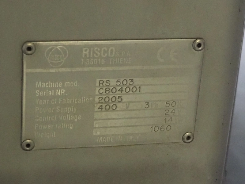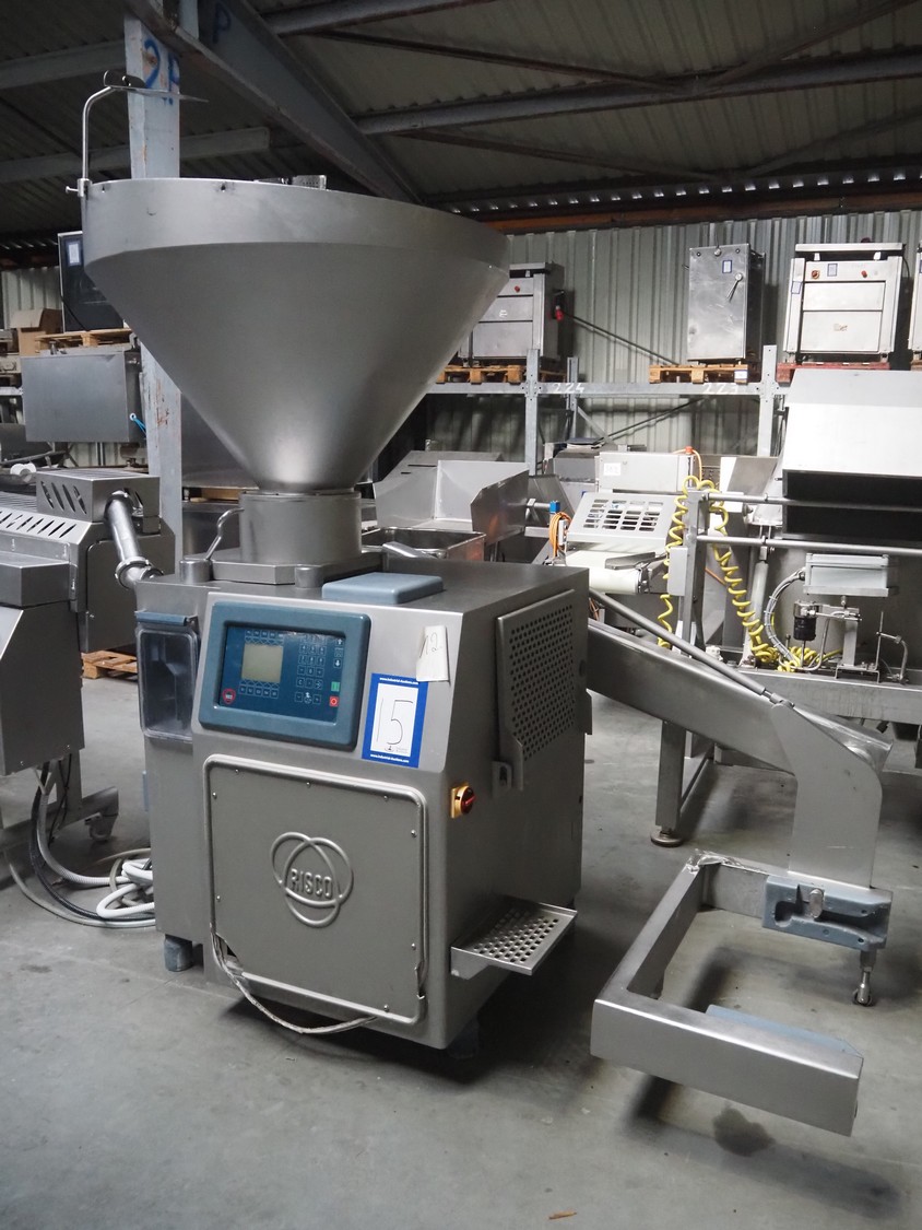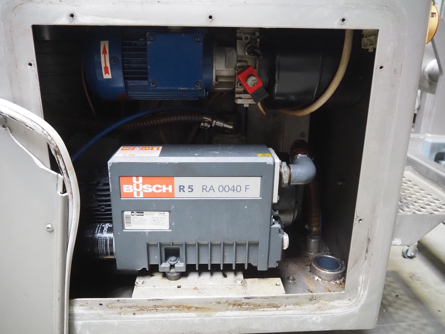 Risco S.p.A. vacuum filling machine with lifter for 200 liter meat bins, model: RS 503, serial number: C804001, year of construction: 2005, 400 V, 3 Ph, 50 Hz, 14 kW, weight: 1060, with Busch vacuum pump, type: RA 0040 F 503, serial number: DEM119231529, Vmax = 40 m³/h, total dimensions: 2000 mm x 1400 mm x 2300 mm. Including extra parts.