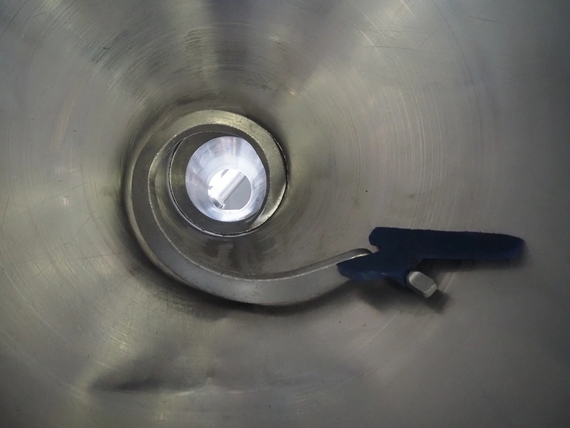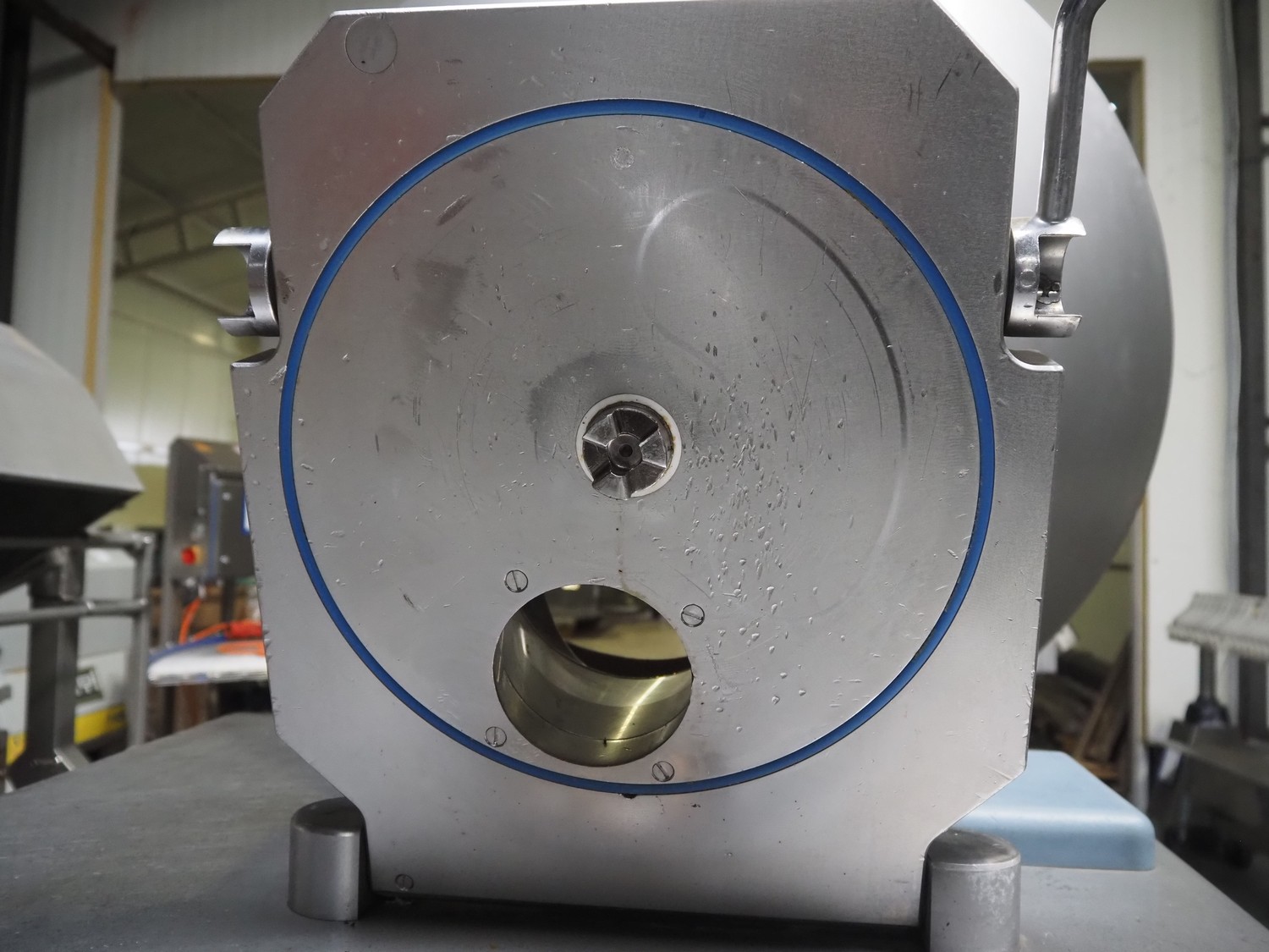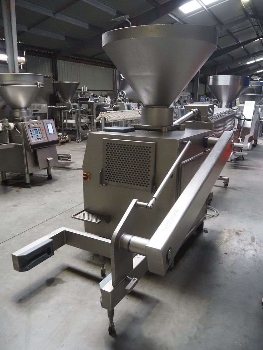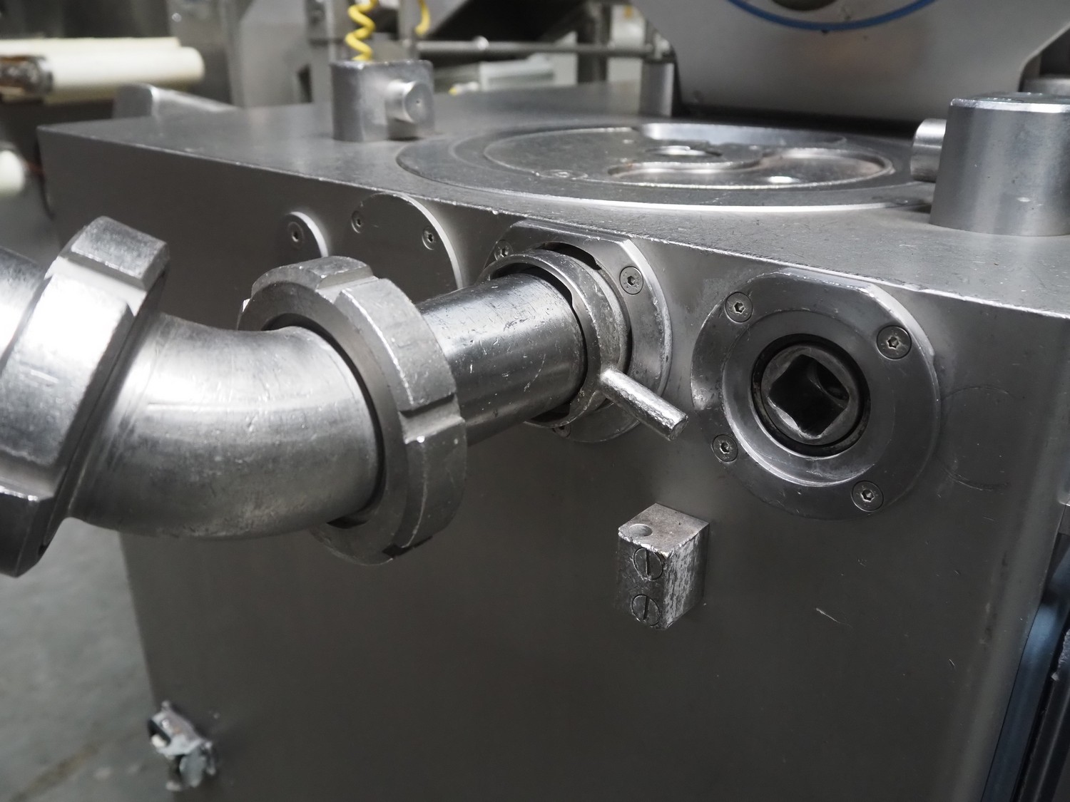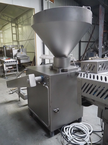 Risco S.p.A. vacuum filling machine with lifter for 200 liter meat bins, model: RS 503, serial number: C804001, year of construction: 2005, 400 V, 3 Ph, 50 Hz, 14 kW, weight: 1060, with Busch vacuum pump, type: RA 0040 F 503, serial number: DEM119231529, Vmax = 40 m³/h, total dimensions: 2000 mm x 1400 mm x 2300 mm. Including extra parts.