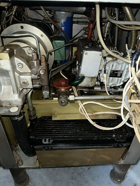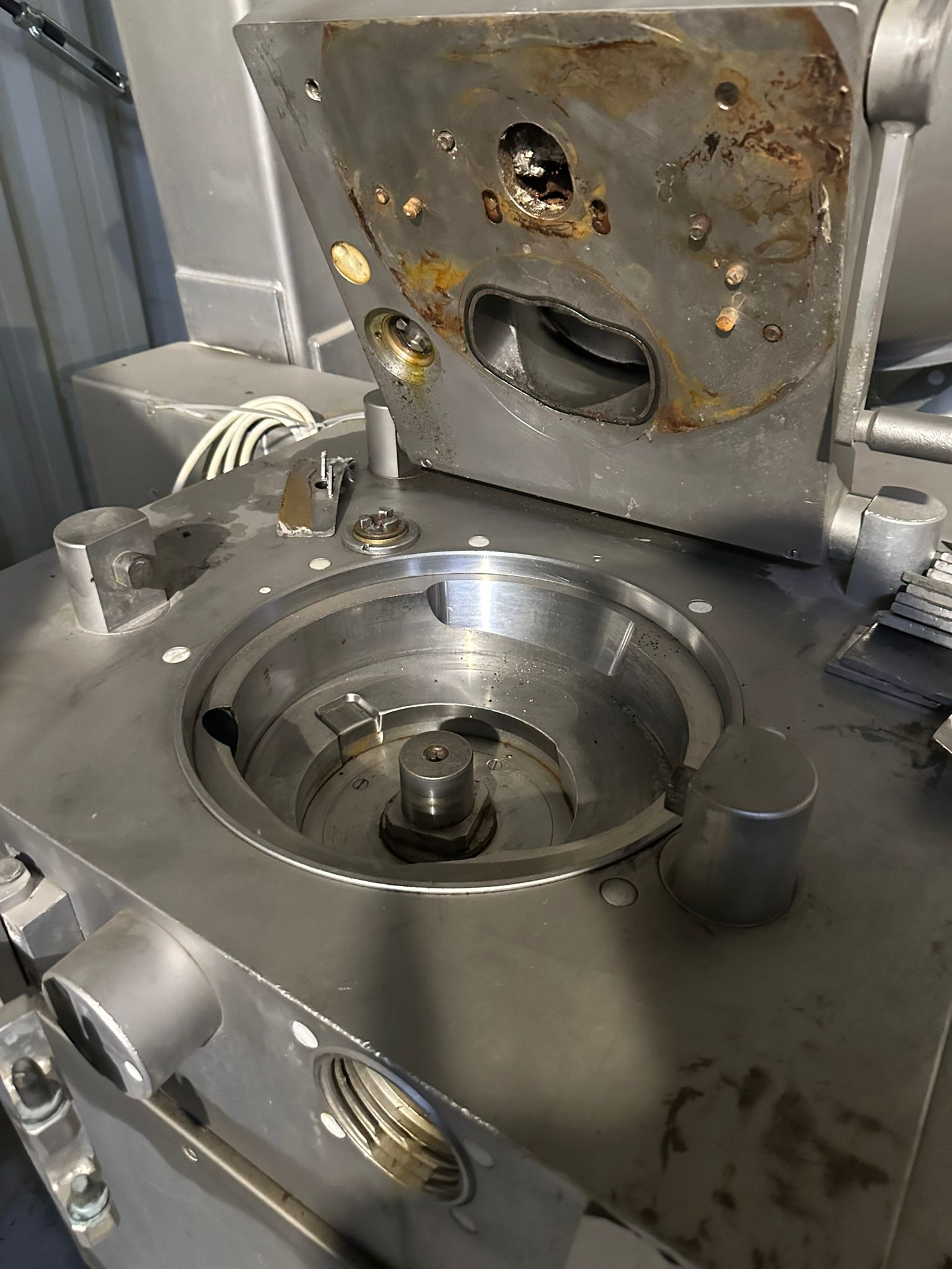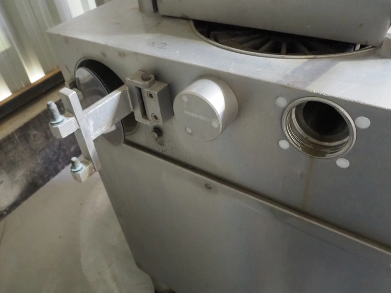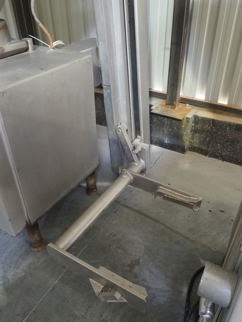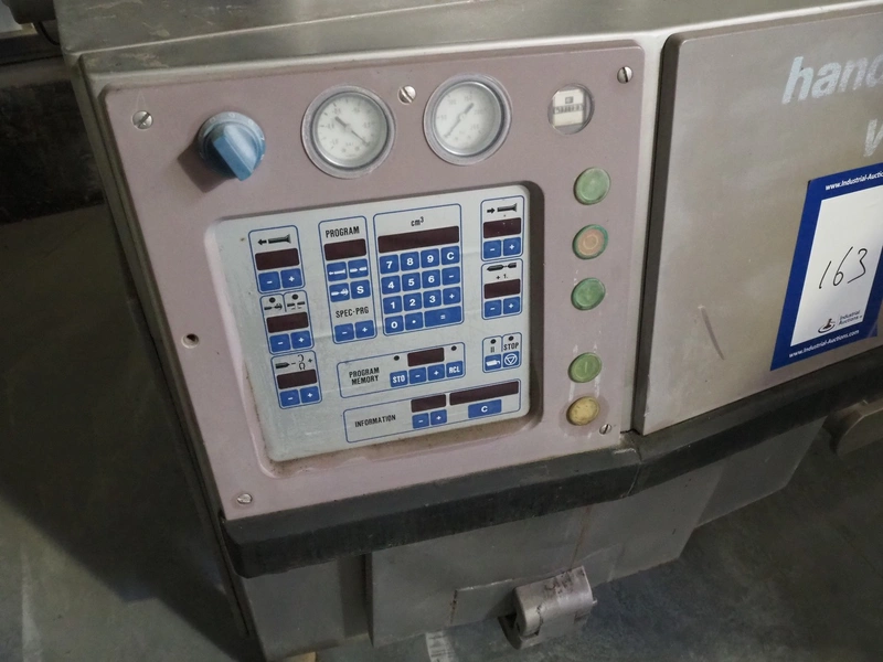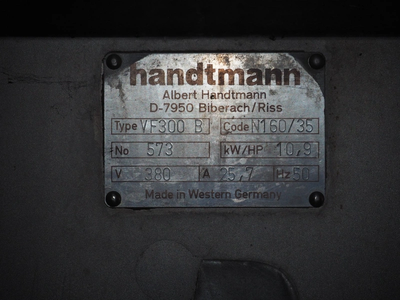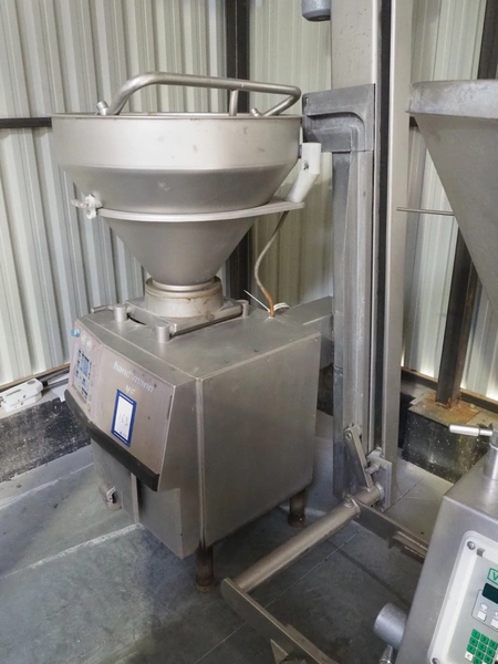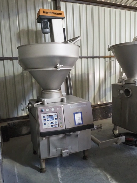 Handtmann vacuum filling machine with lifter for 200 liter meat bins, type: VF300B, number: 573, 380 V, 50 Hz, 25.7 A, 10.9 kW, filling and portioning, dimensions: 1900 mm x 1400 mm x 2870 mm. Incomplete.