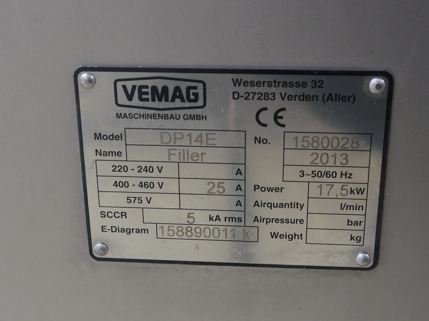 Vemag Maschinenbau GmbH vacuum filling machine, type: DP14E, serial number: 1580028, year of construction: 2013, 400-460 V, 3 Ph, 50/60 Hz, 25 A, 17.5 kW, dimensions: 2100 mm x 1530 mm x 2200 mm.
