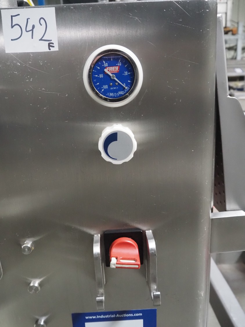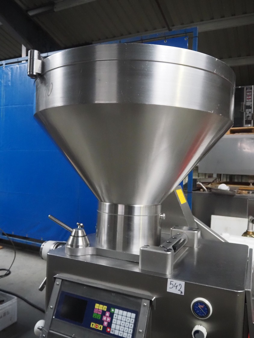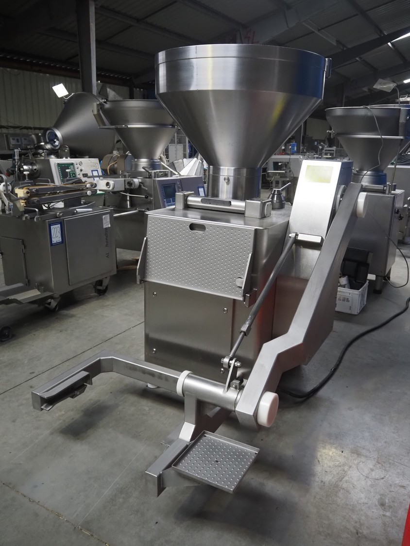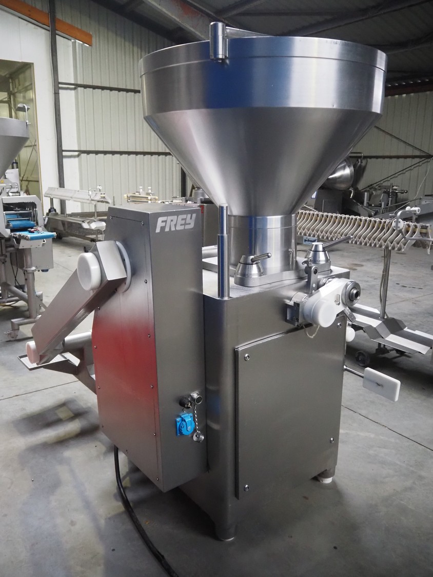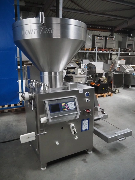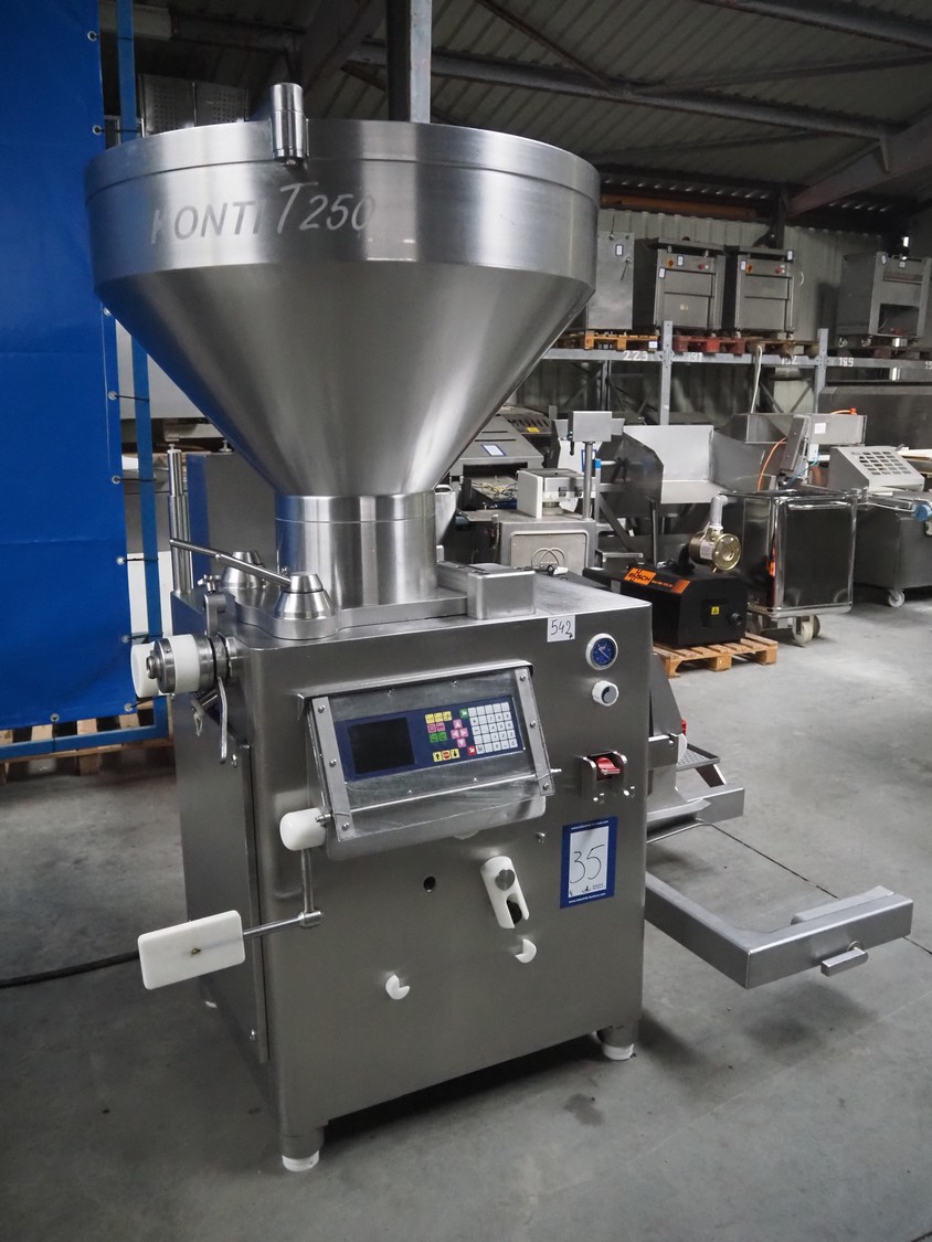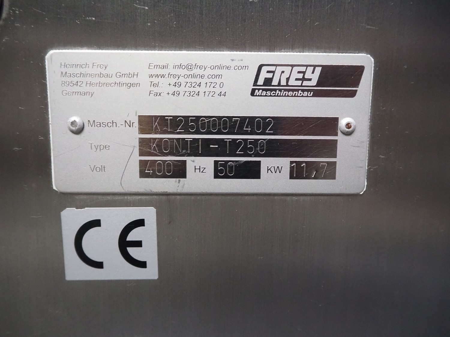 Frey vacuum filling machine with lifter for 200 liter meat bins and linking attachment, type: KONTI-T250, serial number: KT250007402, 400 V, 50 Hz, 11.7 kW, with Busch vacuum pump, type: RB 0021 C 3Z3, serial number: D15150344, Vmax = 24 m³/h, total dimensions: 2100 mm x 1200 mm x 2040 mm. Including extra parts.