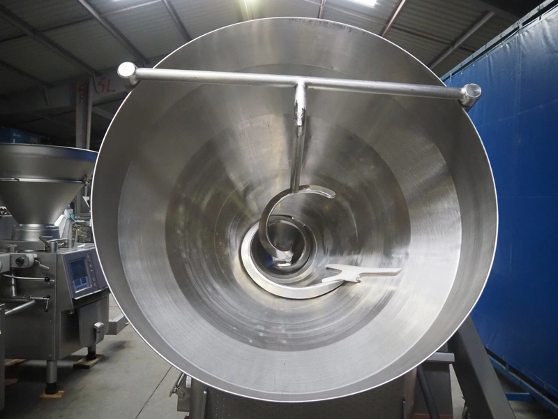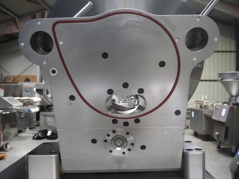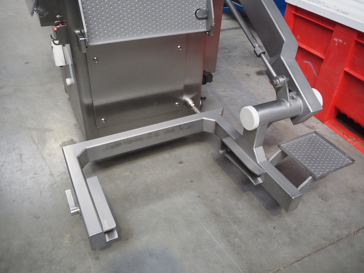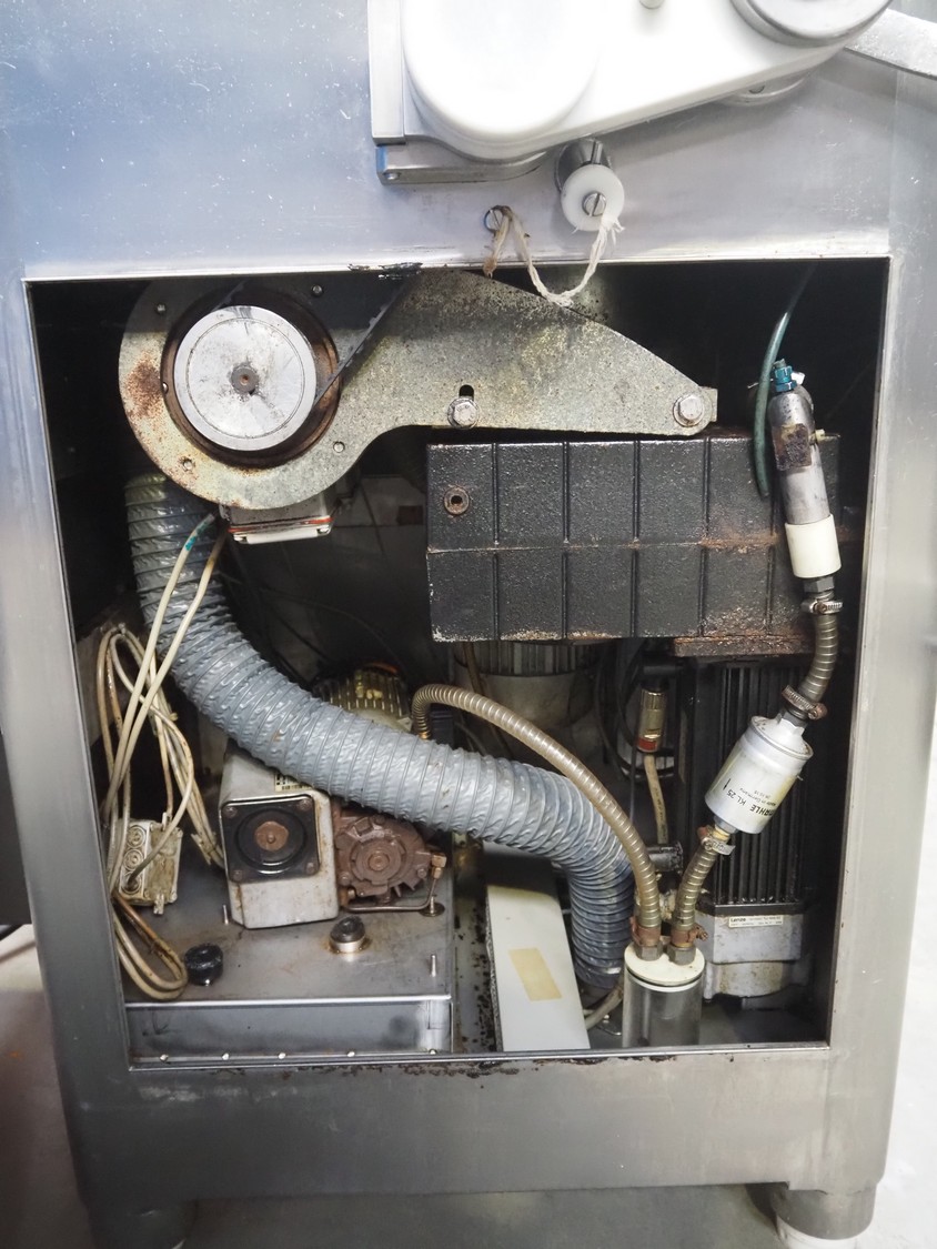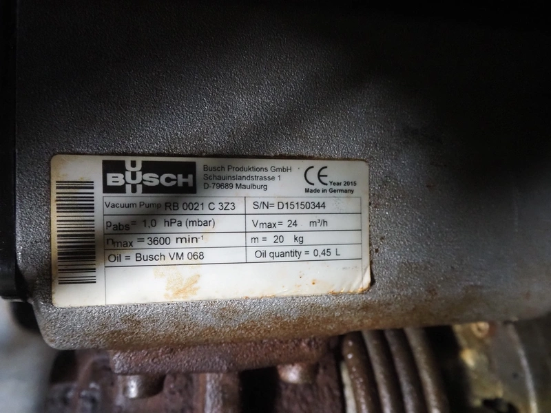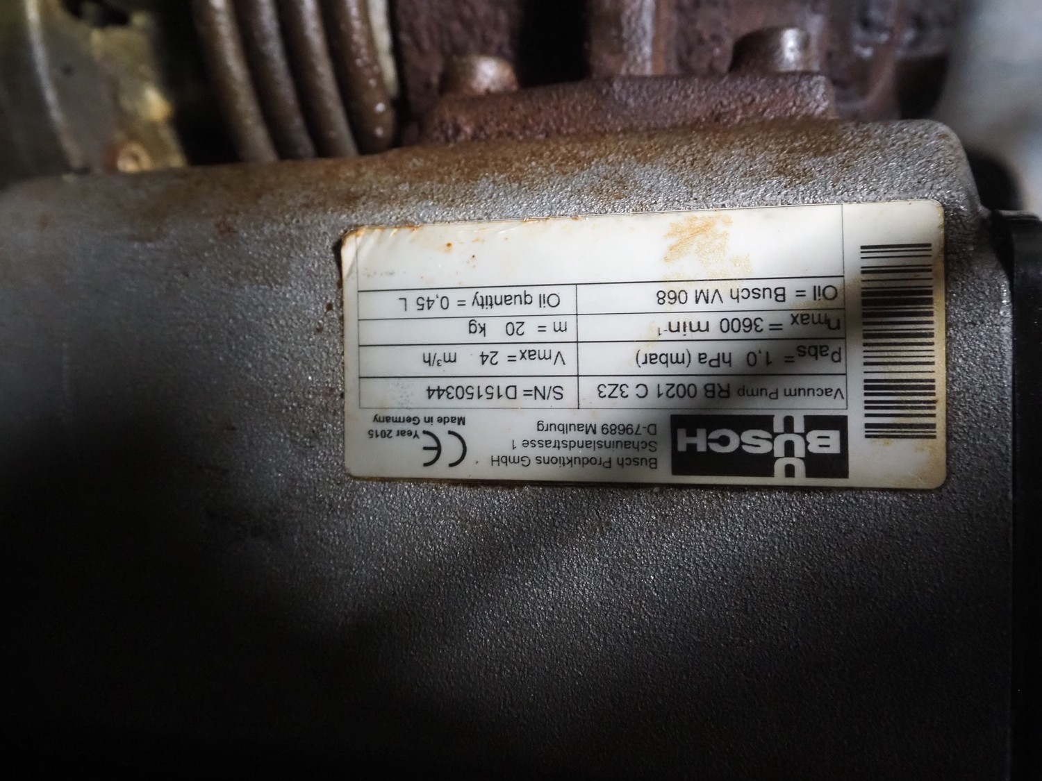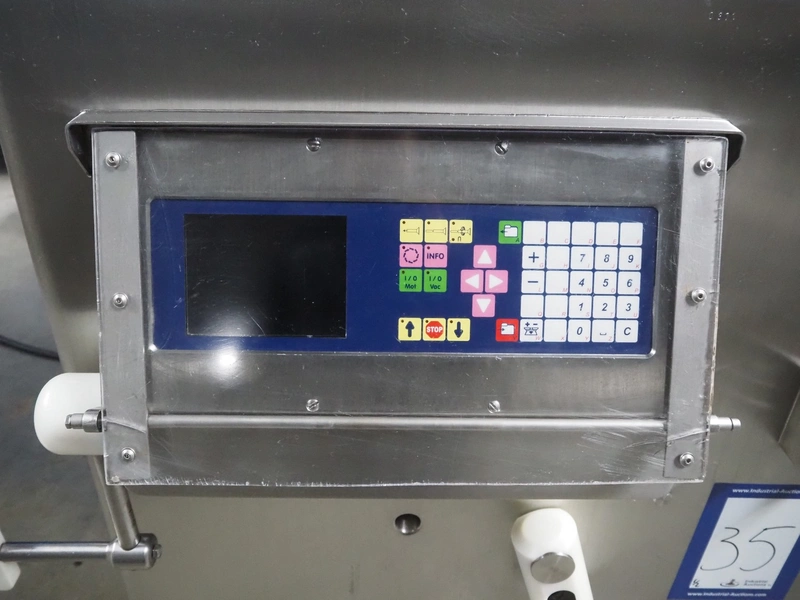 Frey vacuum filling machine with lifter for 200 liter meat bins and linking attachment, type: KONTI-T250, serial number: KT250007402, 400 V, 50 Hz, 11.7 kW, with Busch vacuum pump, type: RB 0021 C 3Z3, serial number: D15150344, Vmax = 24 m³/h, total dimensions: 2100 mm x 1200 mm x 2040 mm. Including extra parts.