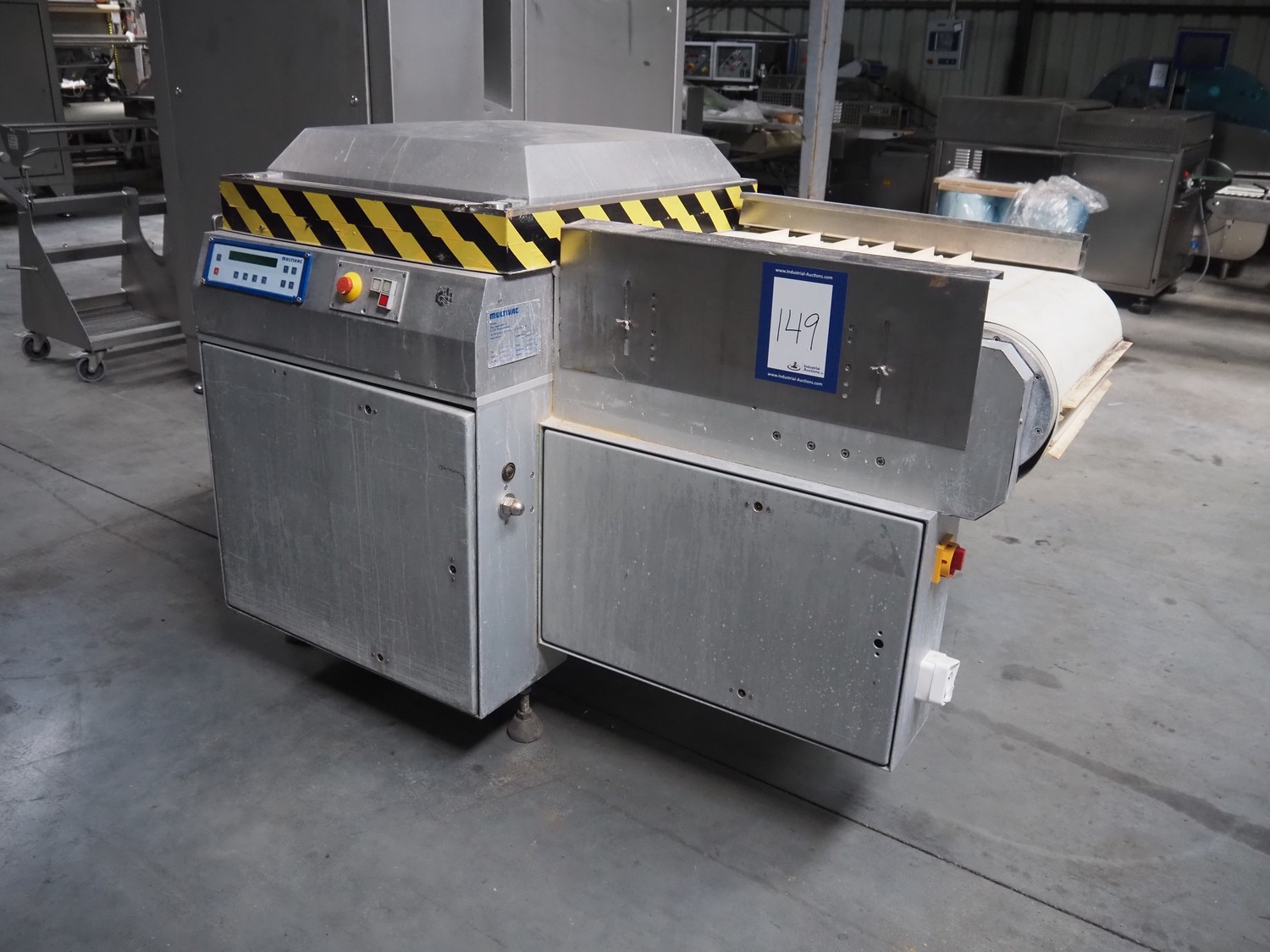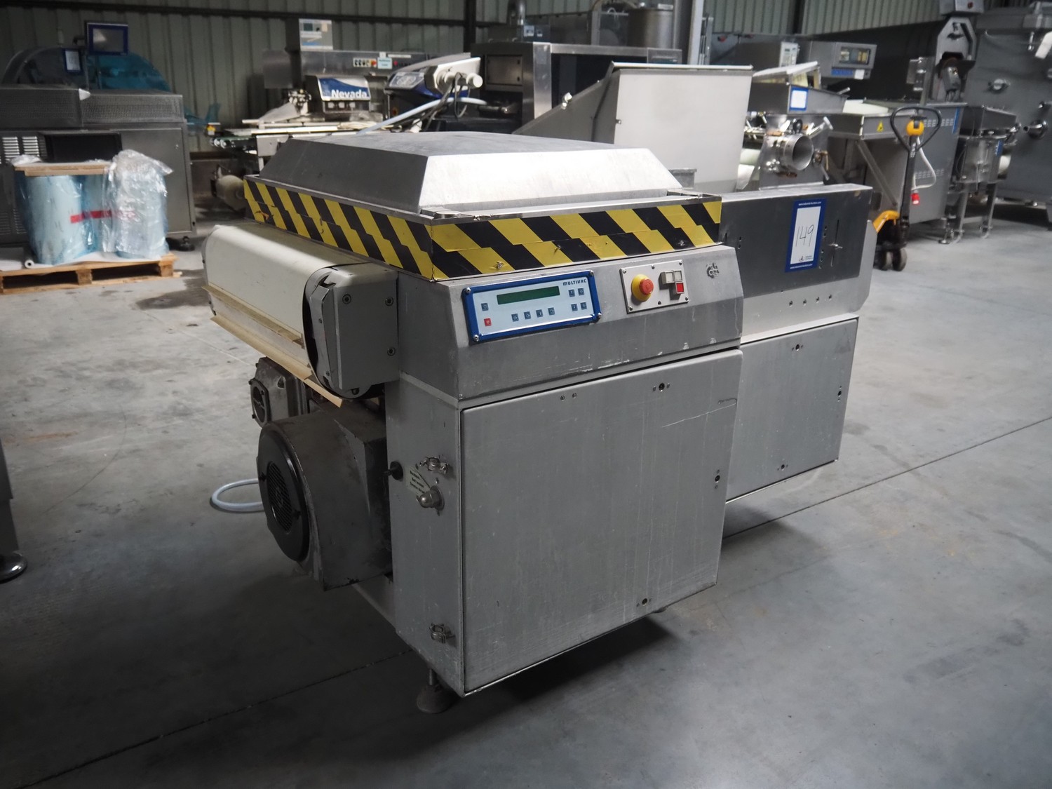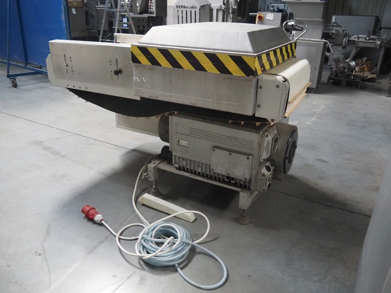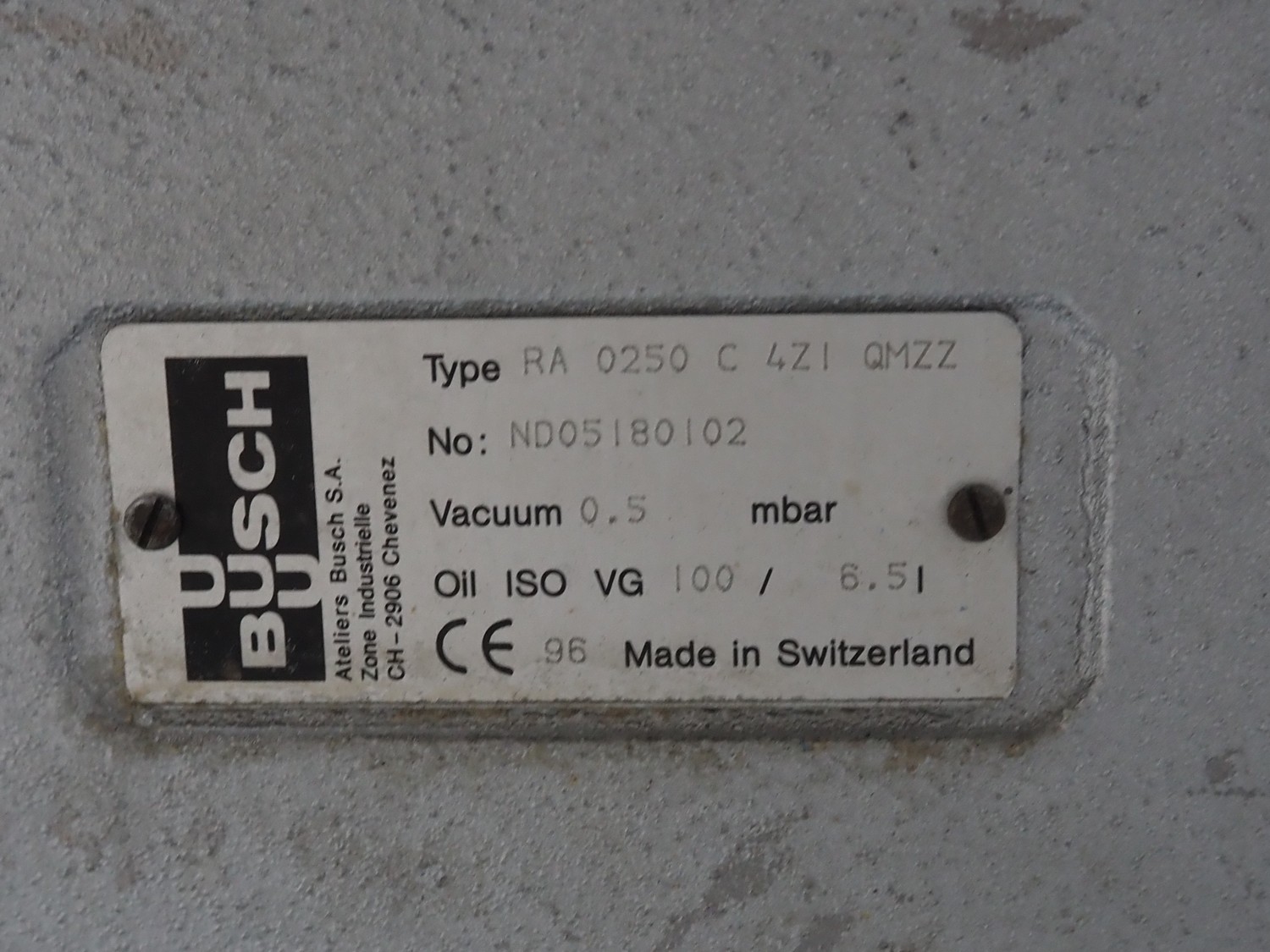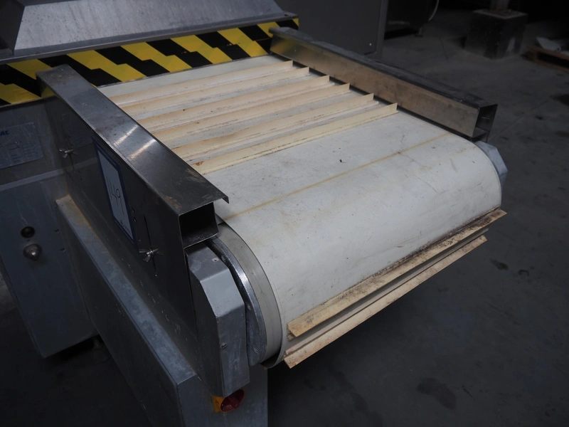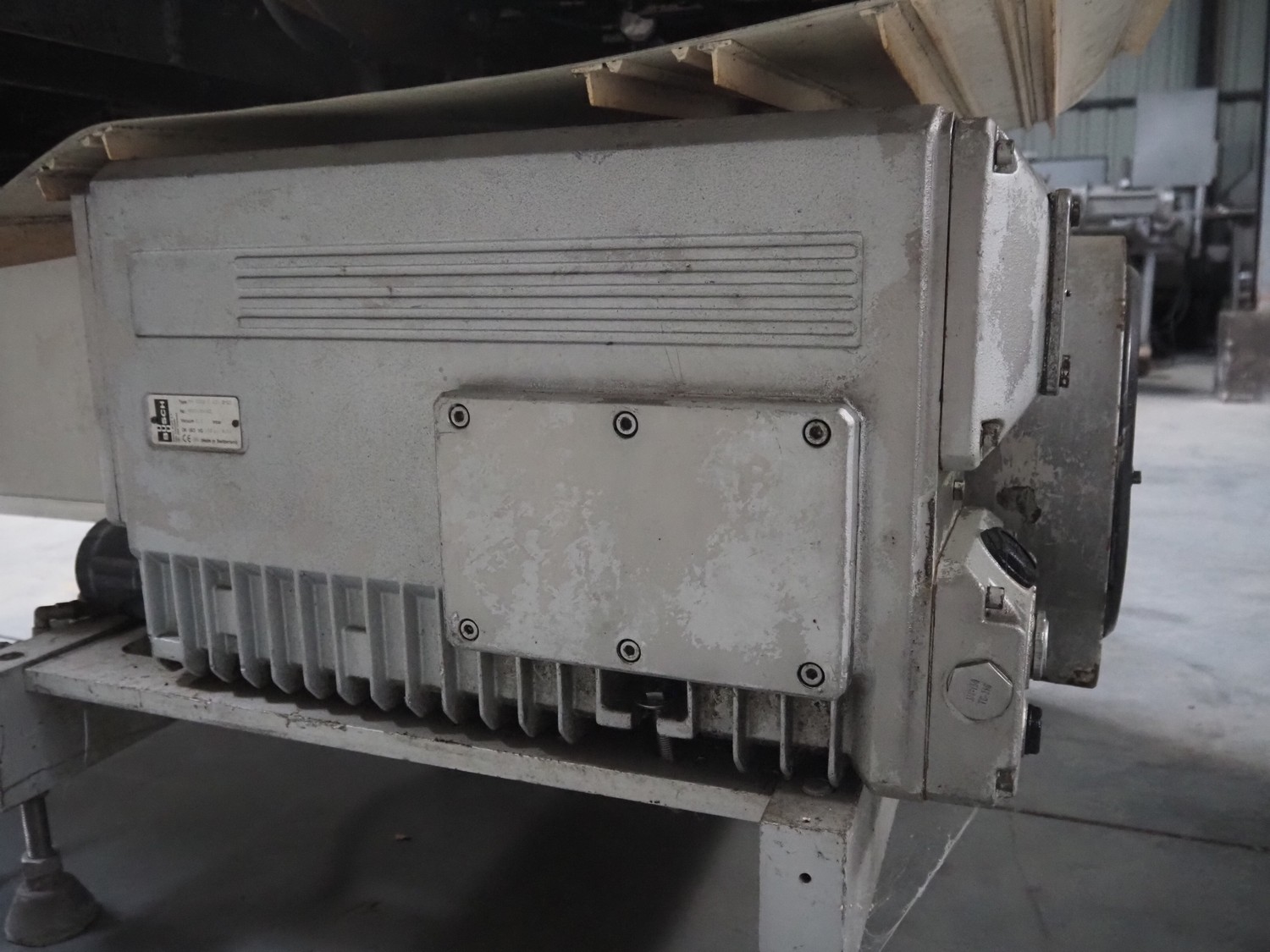 Multivac belt vacuum machine, type: B890, machine number 270, year of construction: 1996, 400 V, 3 Ph, 50 Hz, 25 A, 7 kW, plastic belt with dividers, plastic belt width: 600 mm, distance between dividers: 75 mm, divider height: 30 mm, Busch vacuum pump, type: RA 0250 C 4ZI QMZZ, capacity: 250 m3/h, total dimensions: 1700 mm x 1100 mm x 1250 mm.