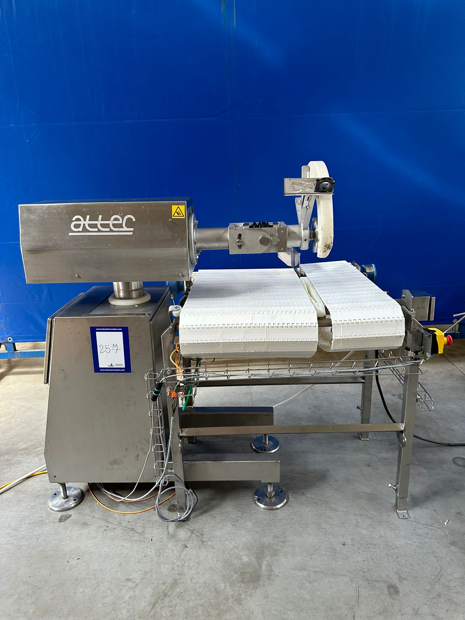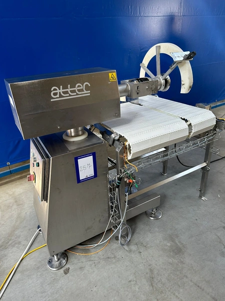 Attec Food Technology circular saw with transport belt, type belt: RSLL300, serial number: 10854, year of construction: 1995, total dimensions: 1400 mm x 1100 mm x 1600 mm. Missing saw blade.