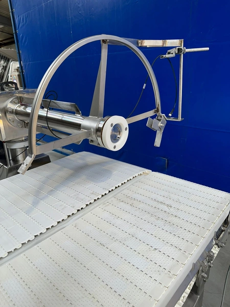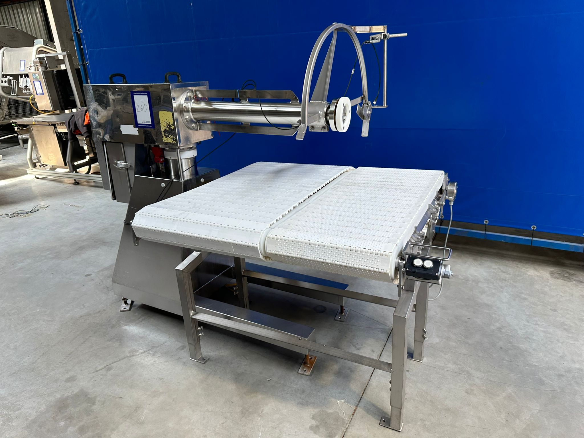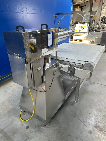 SFK Systems A/S circular saw with transport belt, type: S690-011-007, number: 30695-1003, year of construction: 2012-08, diameter blade: 690 mm, plastic belt, total dimensions: 2200 mm x 1200 mm x 1700 mm. Missing saw blade.