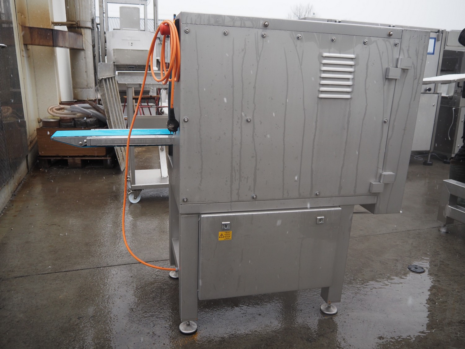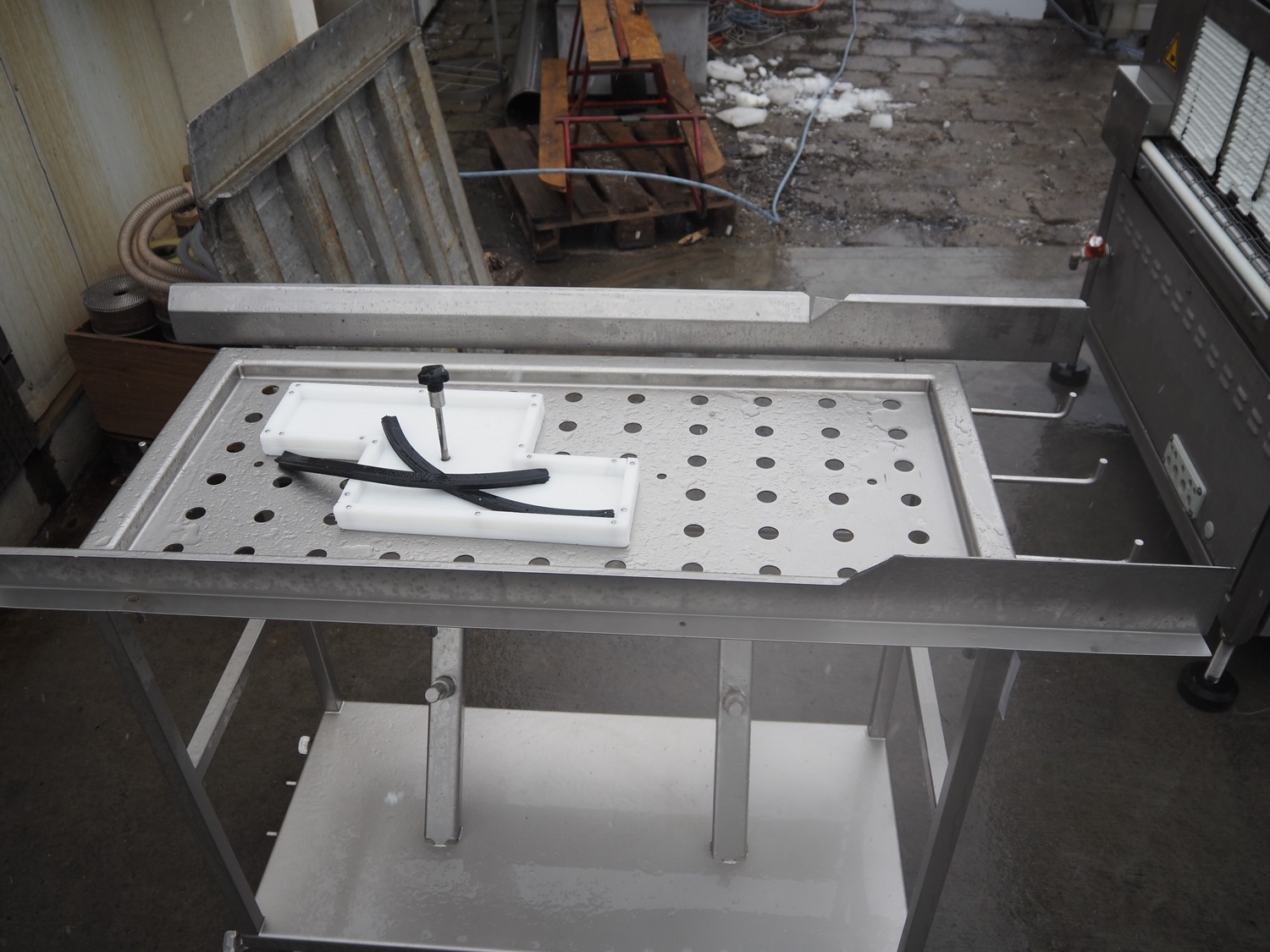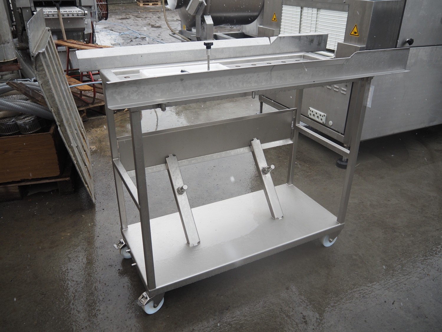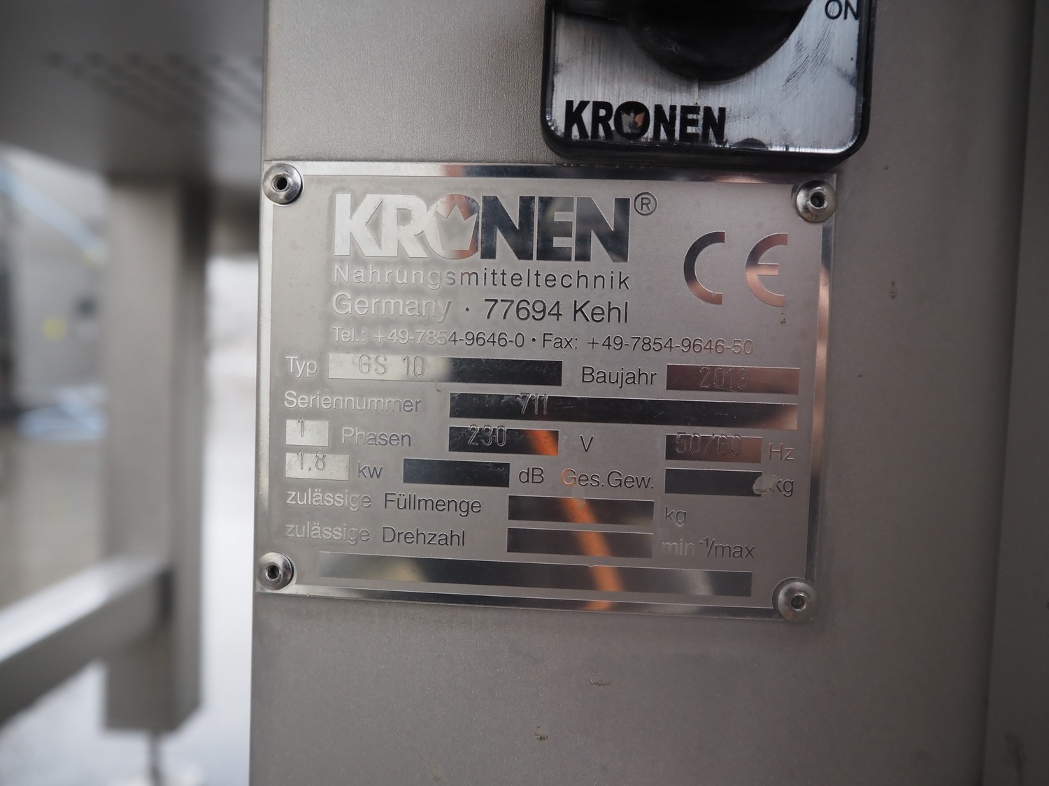 Kronen slicer, type: GS 10, serial number: 711, year of construction: 2013, 230 V, 1 Ph, 50/60 Hz, 1.8 kW, plastic belt, belt width: 130 mm, clearance: 125 mm x 150 mm, total dimensions: 1500 mm x 680 mm x 1280 mm. Including s/s trolley, dimensions: 1370 mm x 610 mm x 1080 mm.