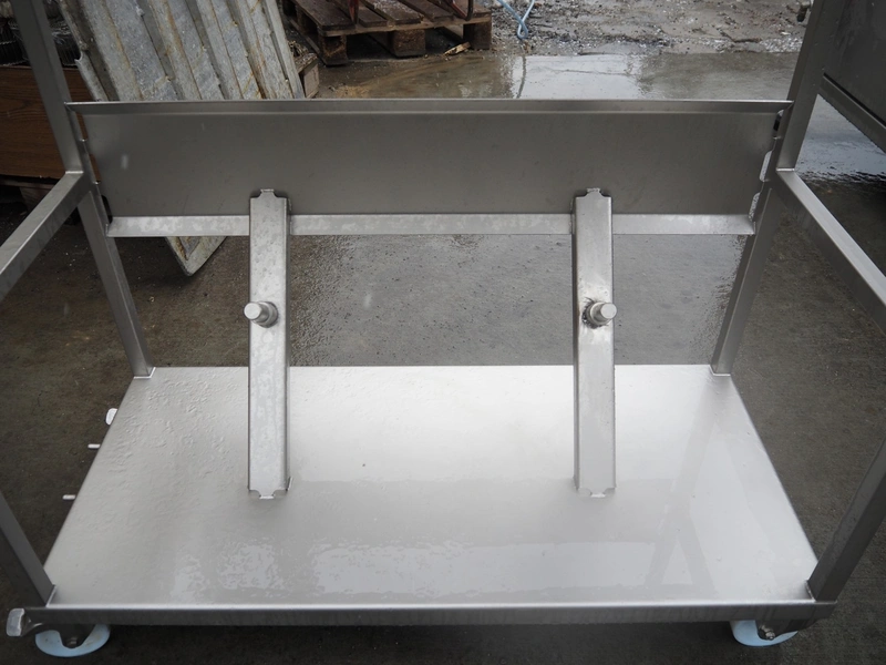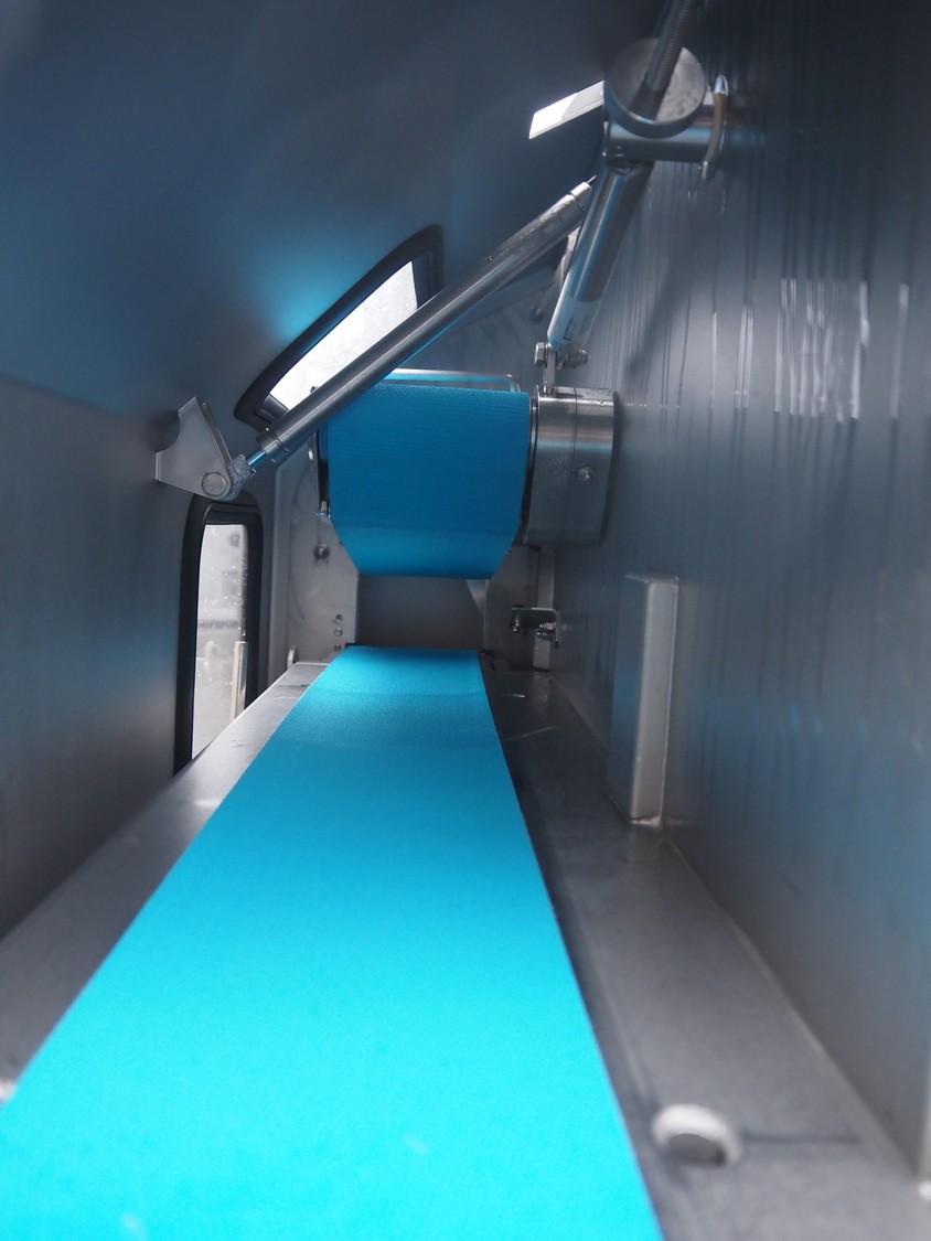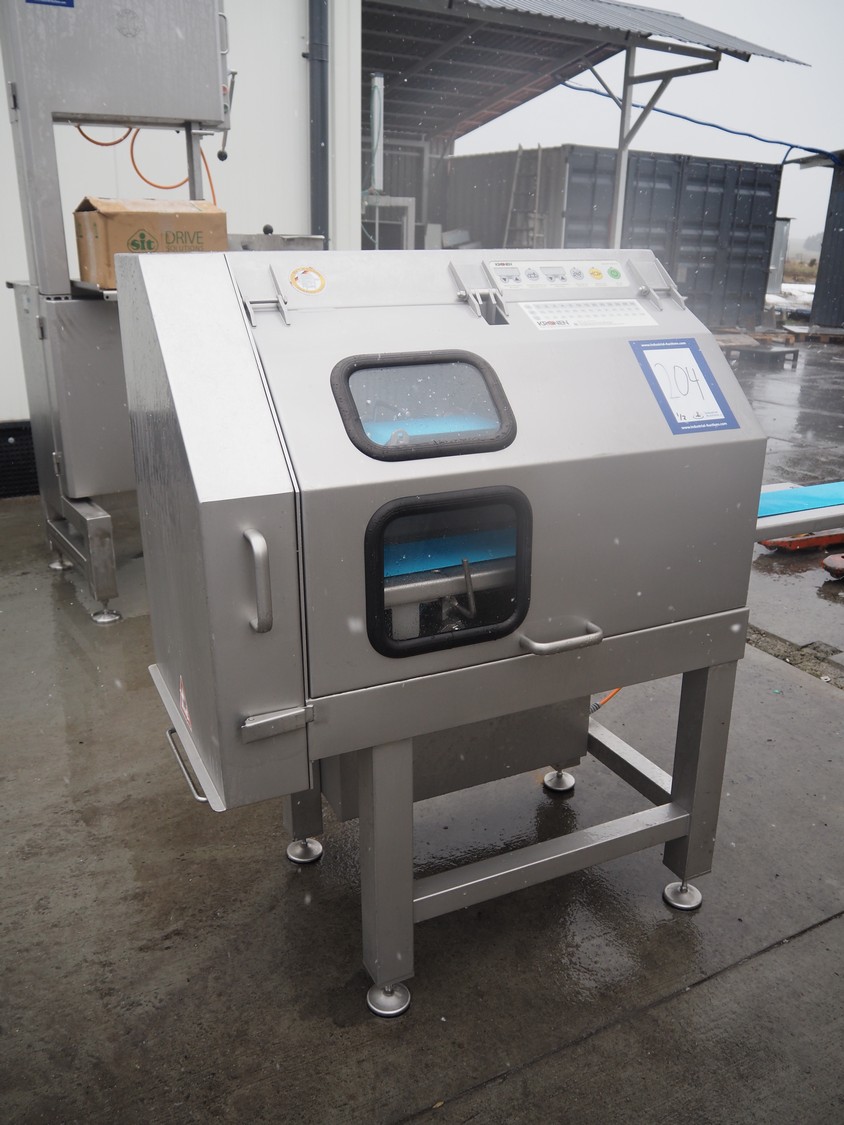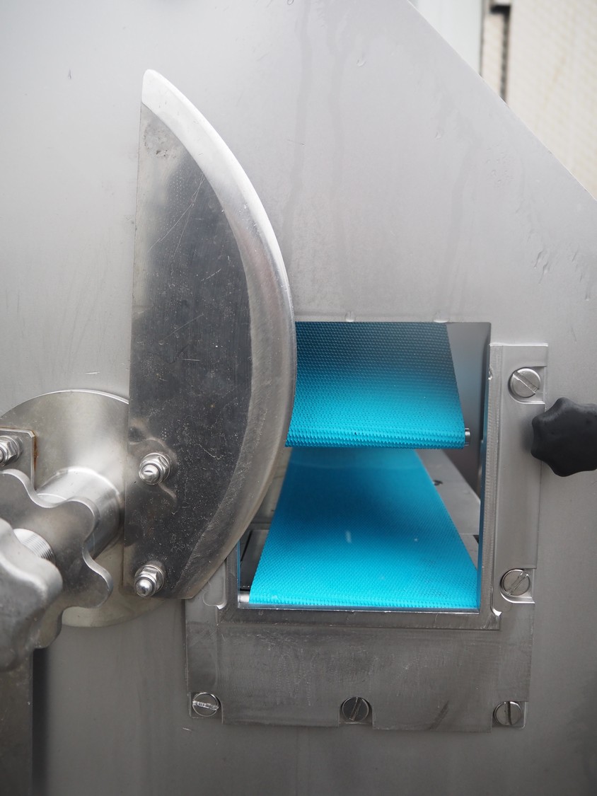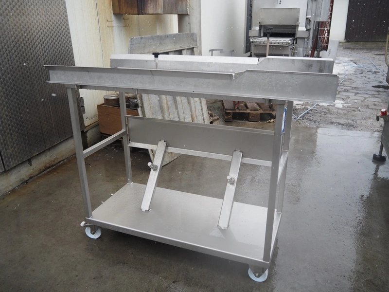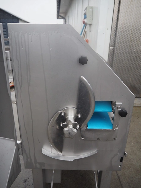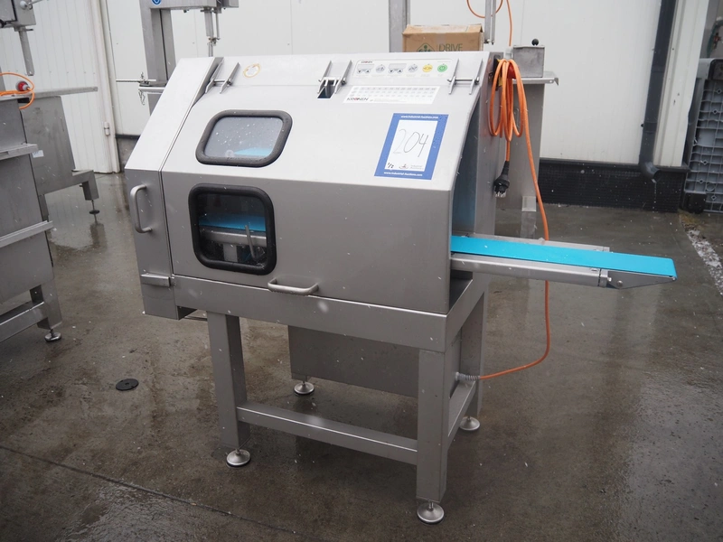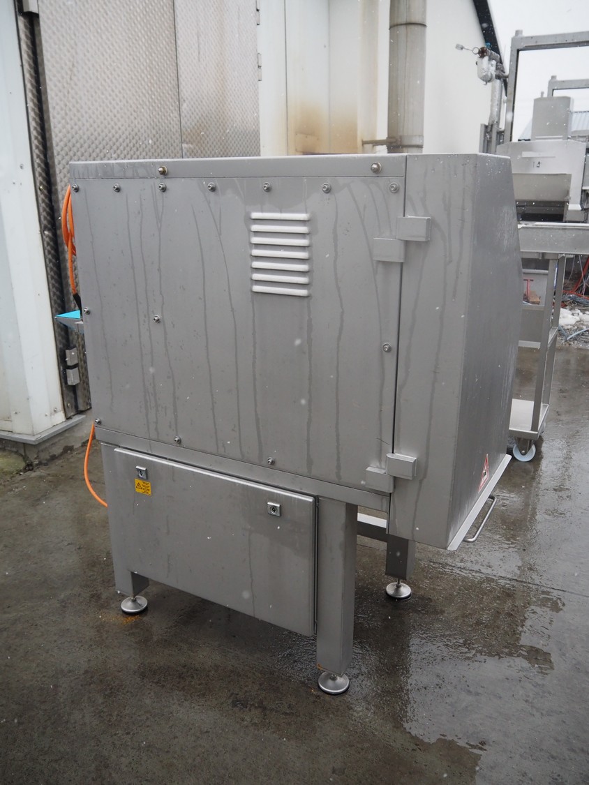 Kronen slicer, type: GS 10, serial number: 711, year of construction: 2013, 230 V, 1 Ph, 50/60 Hz, 1.8 kW, plastic belt, belt width: 130 mm, clearance: 125 mm x 150 mm, total dimensions: 1500 mm x 680 mm x 1280 mm. Including s/s trolley, dimensions: 1370 mm x 610 mm x 1080 mm.