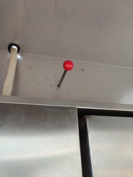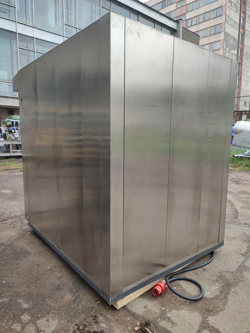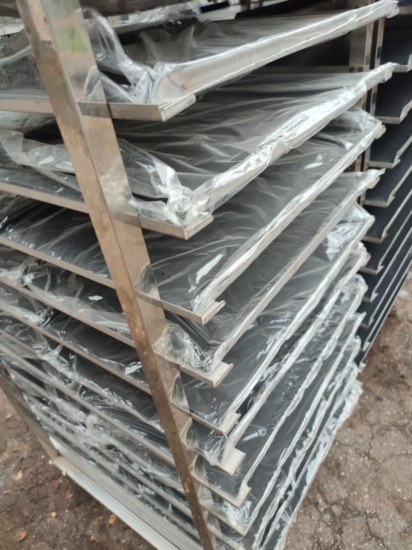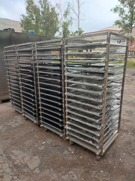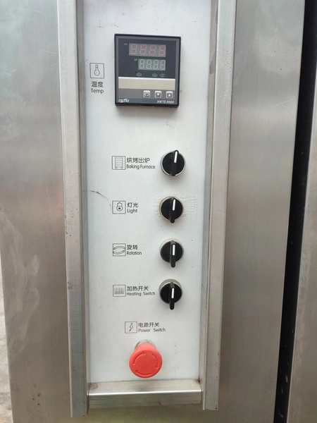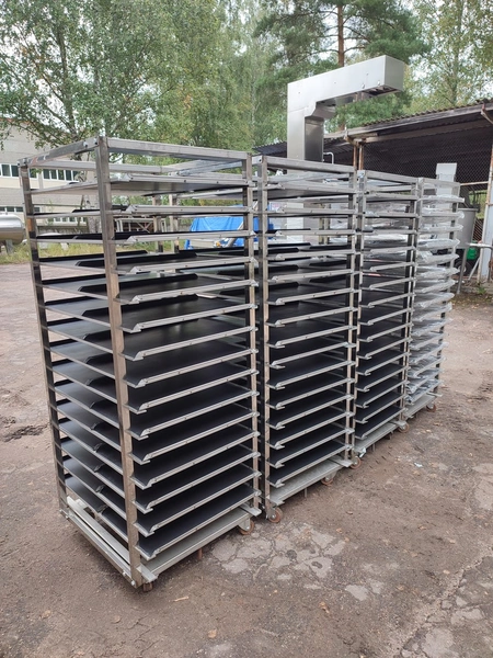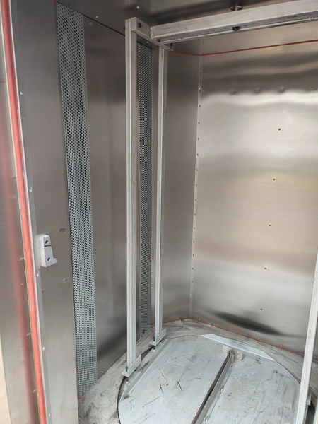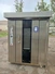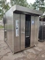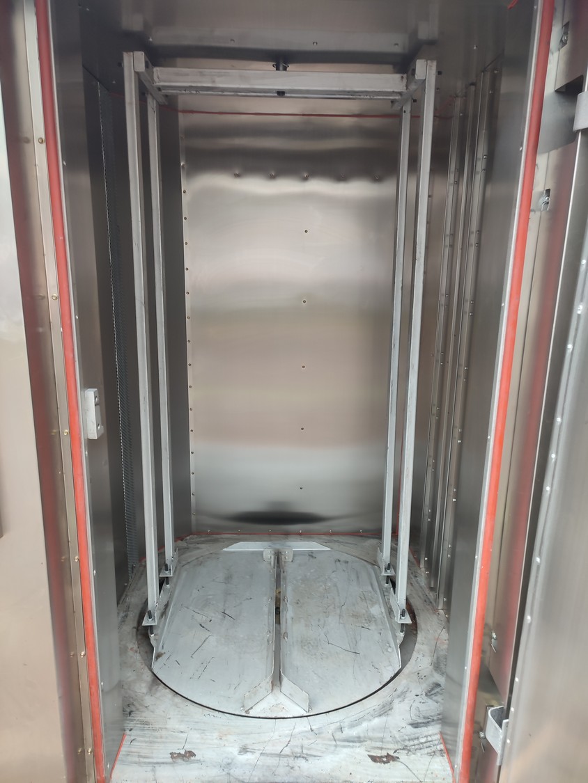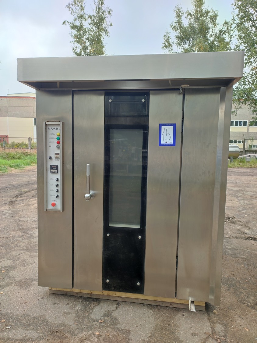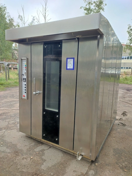 Rotating electric hot air oven with 4 s/s trolleys, 16 floors, 30 baking tray each trolley, floor dimensions: (16x) 610 mm x 815 mm, baking tray dimensions: (30x) 595 mm x 395 mm, trolley dimensions: (4x) 690 mm x 710 mm x 1750 mm, total dimensions oven: 1900 mm x 2500 mm x 2430 mm.