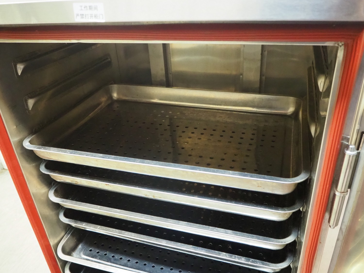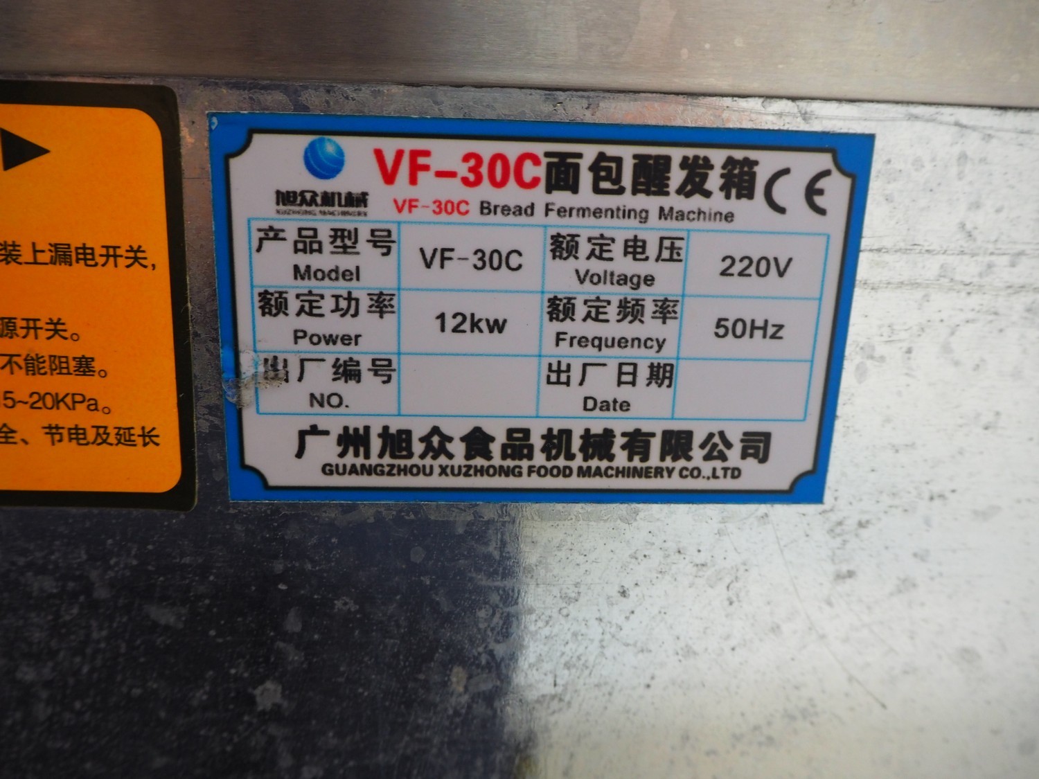 Guangzhou Xuzhong Food Machinery proofer, model: VF-30C, 220 V, 50 Hz, 12 kW, 12 floors, dimensions each floor: 600 mm x 400 mm, 10 plates, inside dimensions: 600 mm x 450 mm x 1000 mm, total dimensions: 800 mm x 600 mm x 1410 mm.