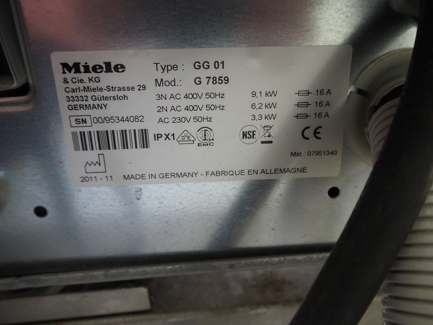 Miele dishwasher, type: GG 01, model: G 7859, serial number: 07951340, year of construction: 2011-11, 400 V, 3 Ph, 50 Hz, 16 A, 9.1 kW, dimensions: 640 mm x 600 mm x 1150 mm.