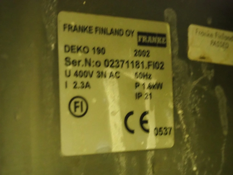 Franke dishwasher, model: DEKO 190, serial number: 02371181.FI02, year of construction: 2002, 400 V, 3 Ph, 50 Hz, 2.3 A, 1.4 kW, inside dimensions: 530 mm x 430 mm x 330 mm, total dimensions: 690 mm x 600 mm x 1300 mm.