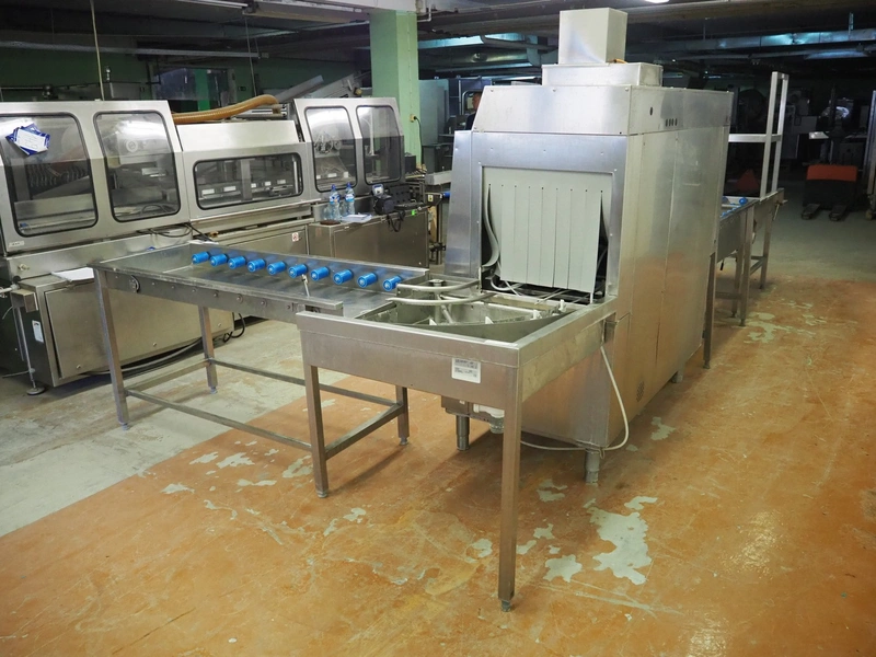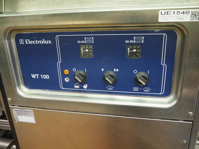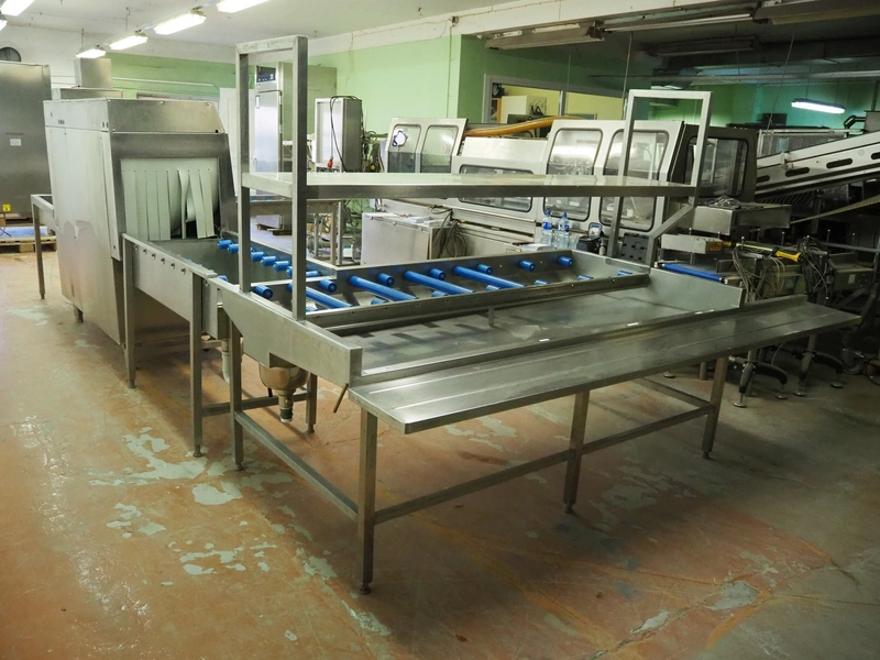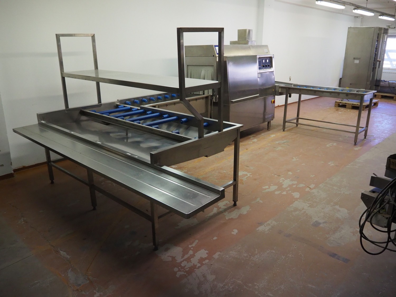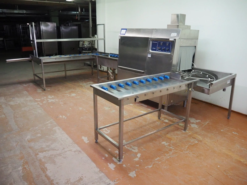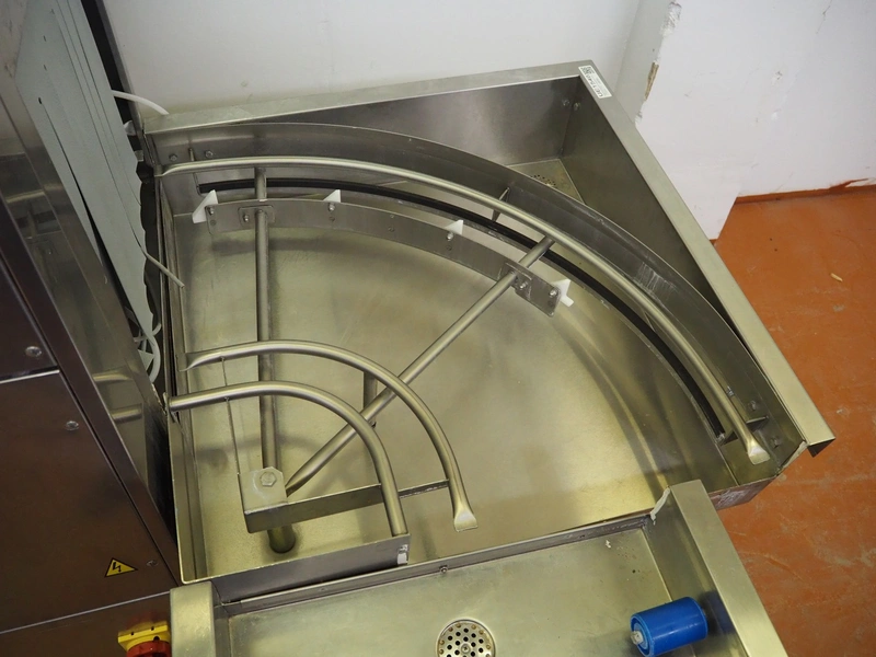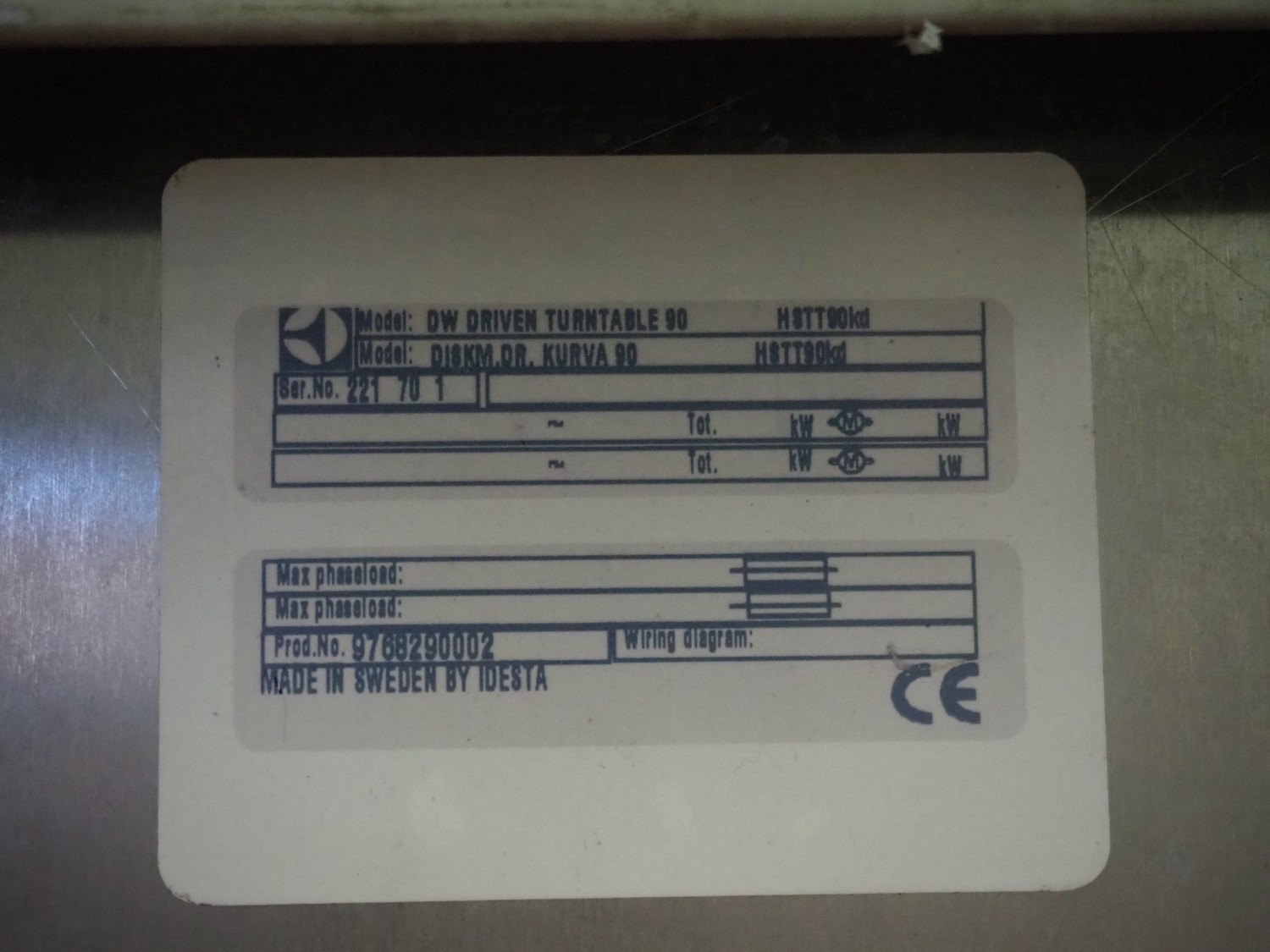 Electrolux dishwasher with infeed- and outfeed table, model: DW Driven Turntable 90, Kurva 90, serial number: 221 70 1, clearance: 550 mm x 400 mm, total dimensions: 1720 mm. x 850 mm x 1950 mm. Infeed table dimensions: 1300 mm x 650 mm x 880 mm and 2200 mm x 1430 mm x 1790 mm outfeed table dimensions: 1470 mm x 850 mm x 880 mm.