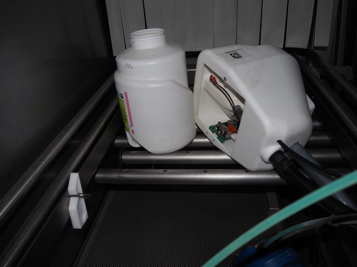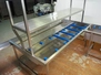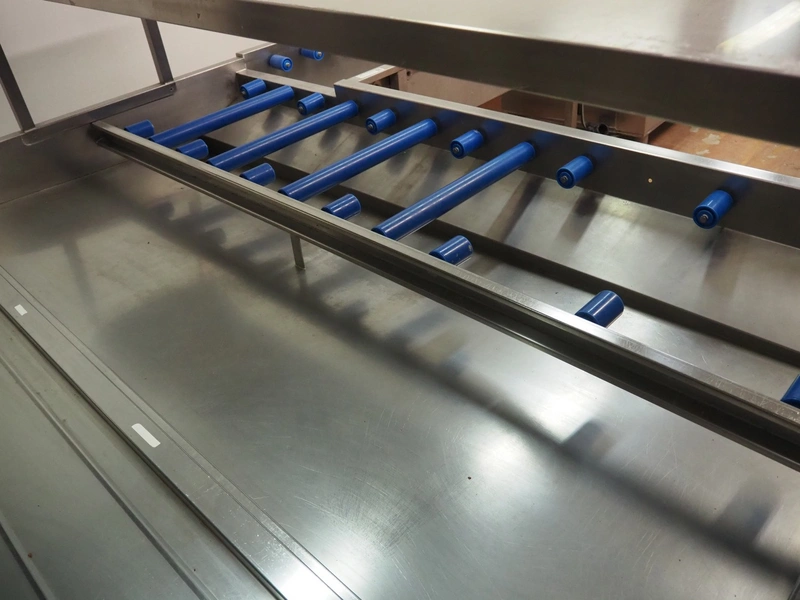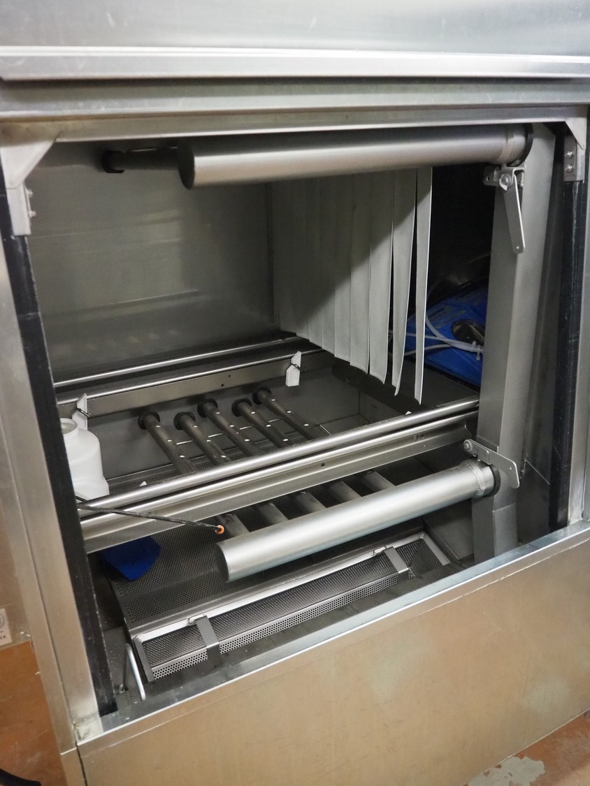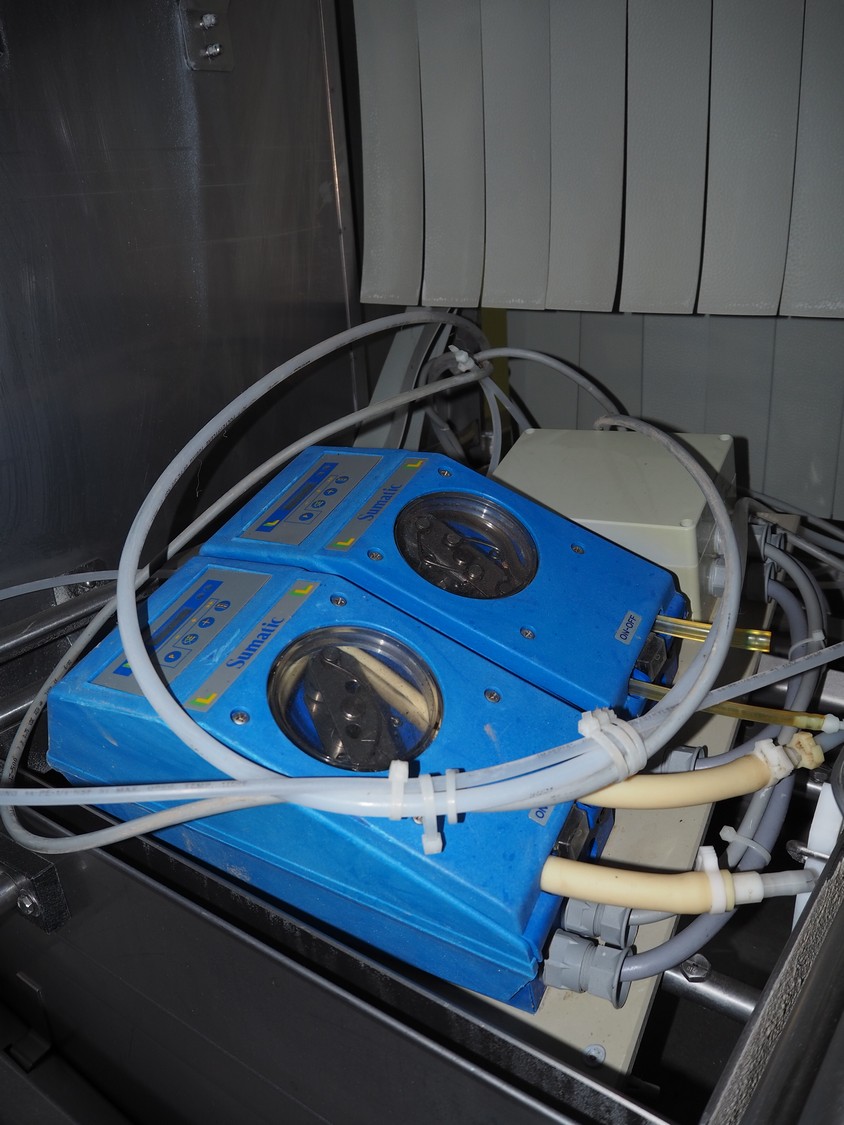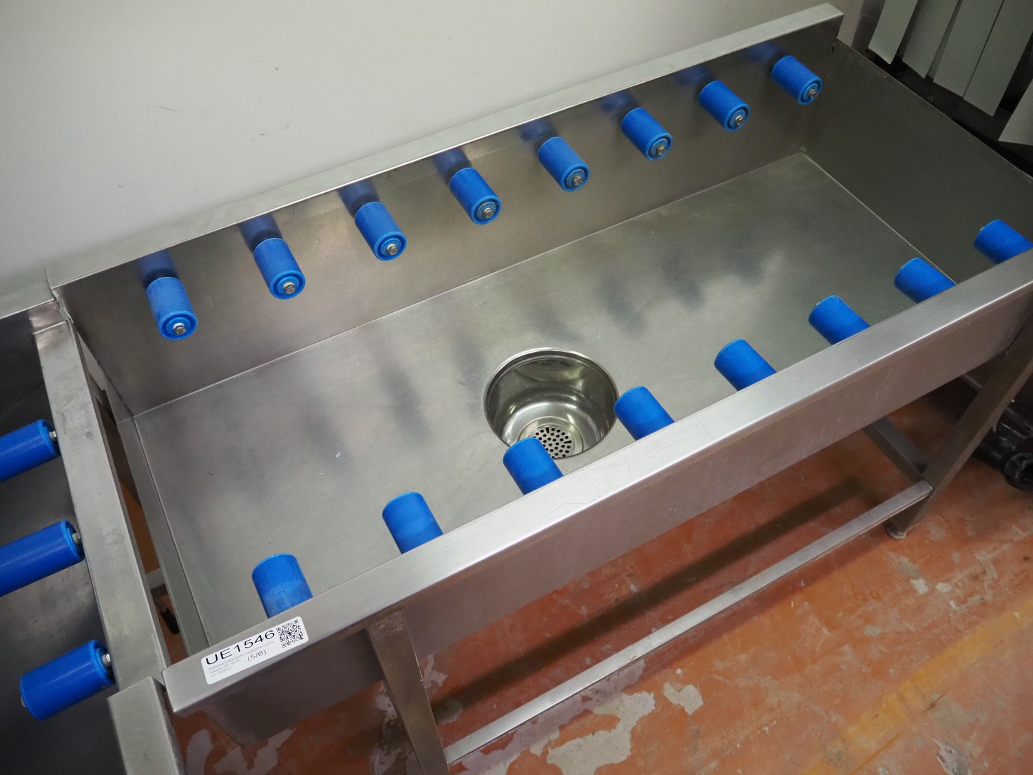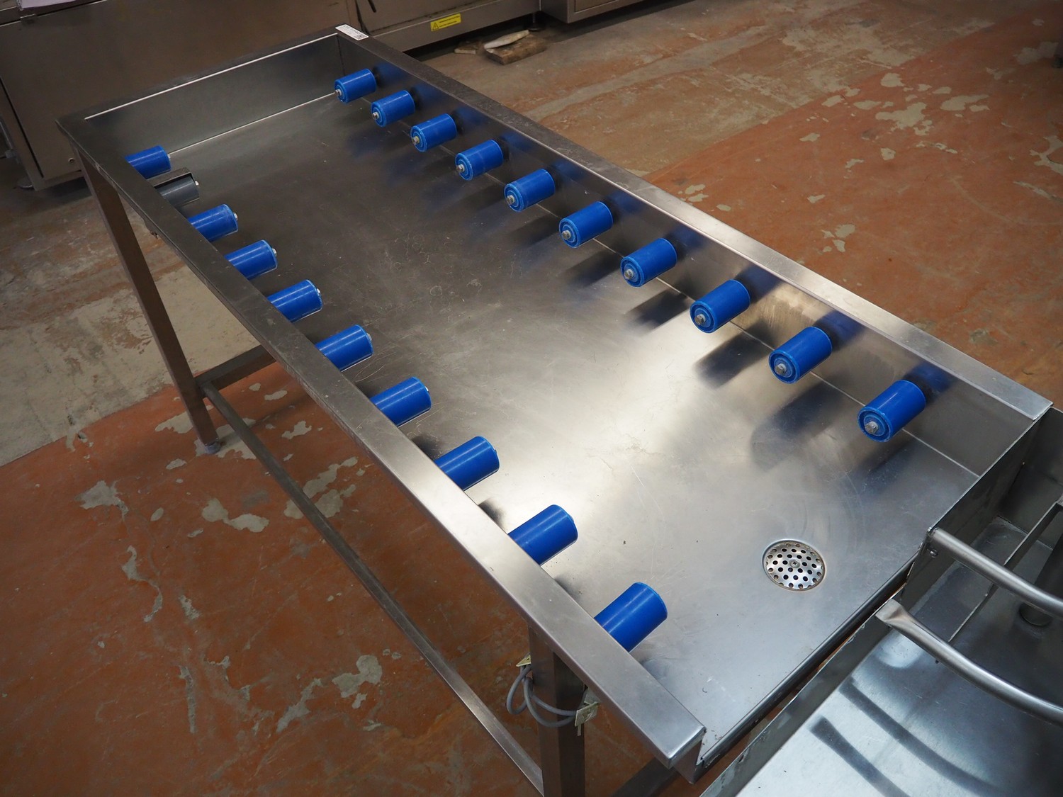 Electrolux dishwasher with infeed- and outfeed table, model: DW Driven Turntable 90, Kurva 90, serial number: 221 70 1, clearance: 550 mm x 400 mm, total dimensions: 1720 mm. x 850 mm x 1950 mm. Infeed table dimensions: 1300 mm x 650 mm x 880 mm and 2200 mm x 1430 mm x 1790 mm outfeed table dimensions: 1470 mm x 850 mm x 880 mm.
