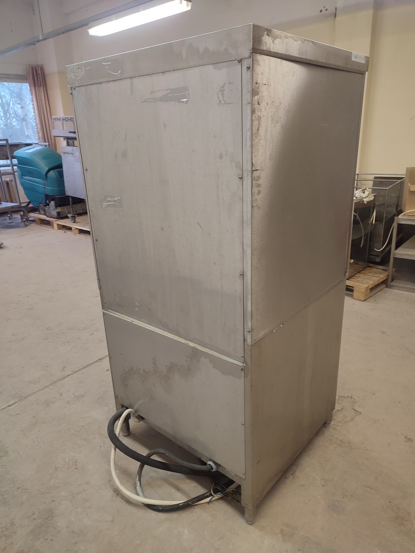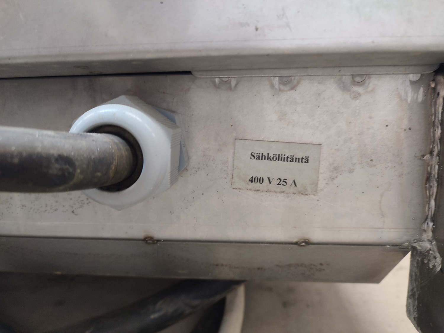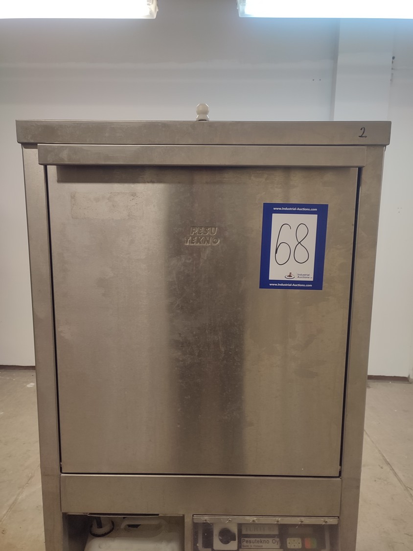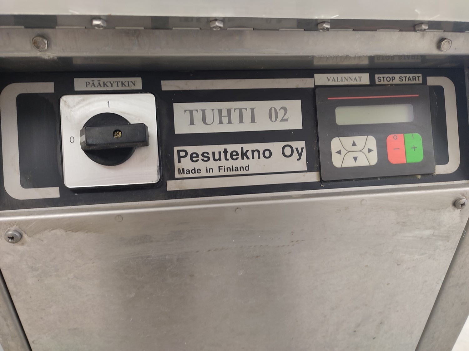 Pesutekno Oy dishwasher, type: Tuhti 02, number: 012001, 400 V, 3 Ph, 50 Hz, 22 A, 16.9 kW, dimensions: 800 mm x 800 mm x 1680 mm.