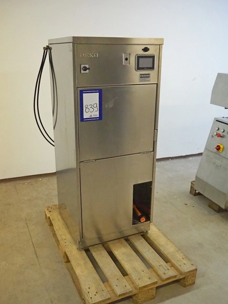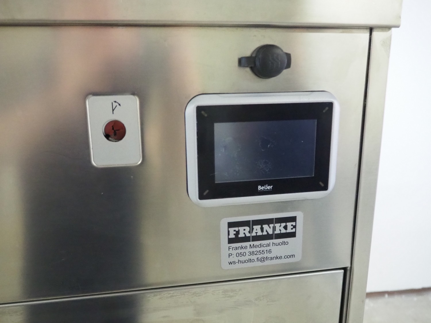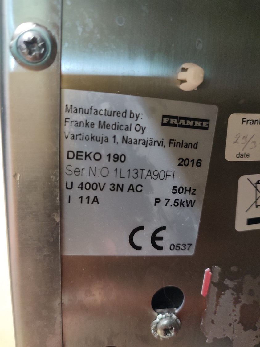 Franke Medical Oy dishwasher, model: DEKO 190, serial number: O 1L13TA90FI, year of construction: 2016, 400 V, 3 Ph, 50 Hz, 11 A, 7.5 kW, inside dimensions: 540 mm x 360 mm x 560 mm, total dimensions: 635 mm x 600 mm x 1455 mm.
