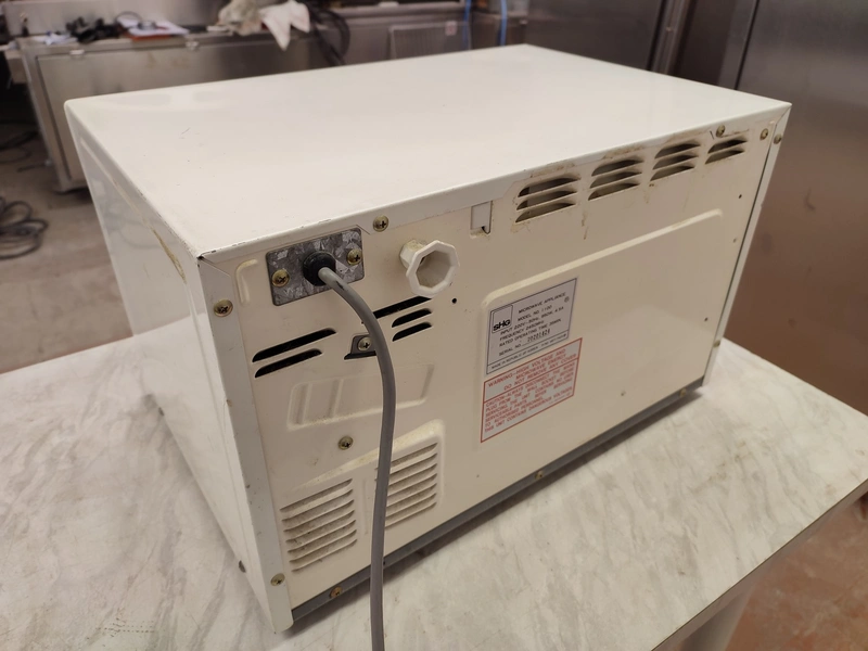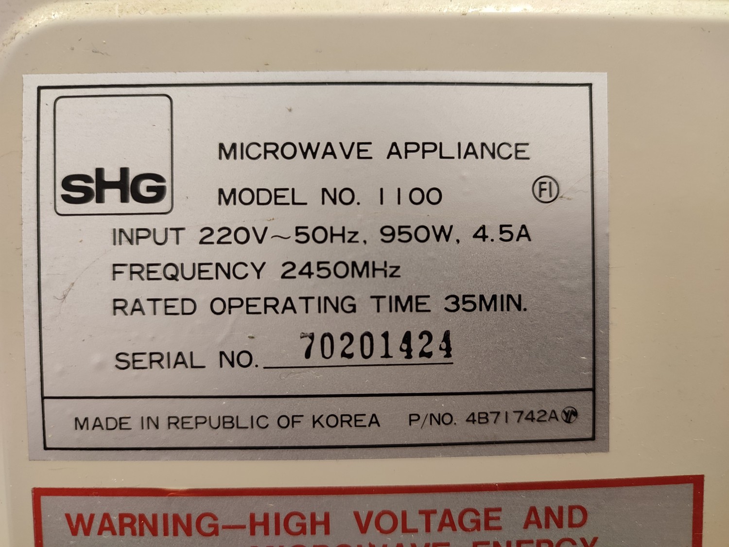 SHG microwave, model: 1100, serial number: 70201424, 220 V, 50 Hz, 4.5 A, 950 W, dimensions: 500 mm x 400 mm x 310 mm.