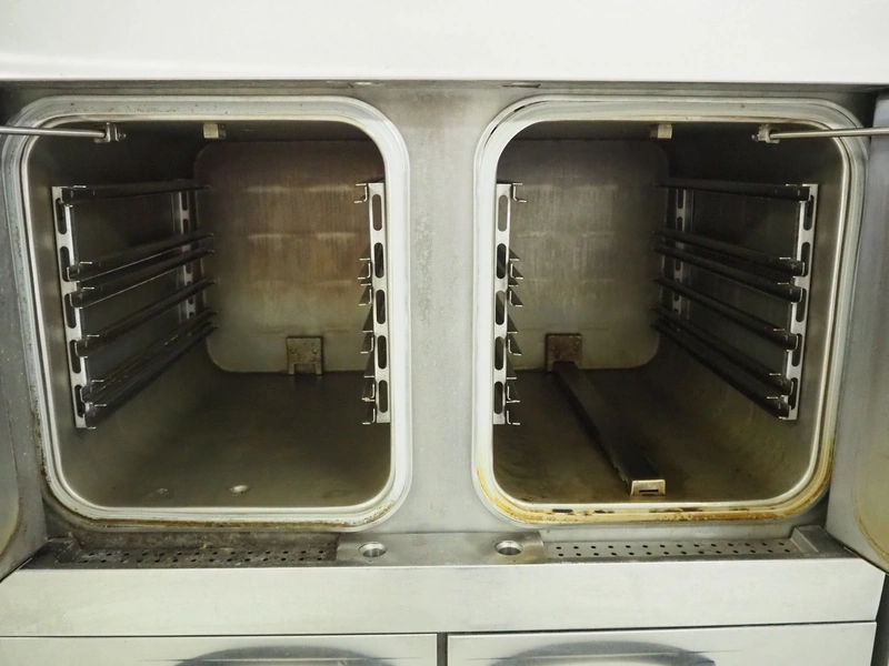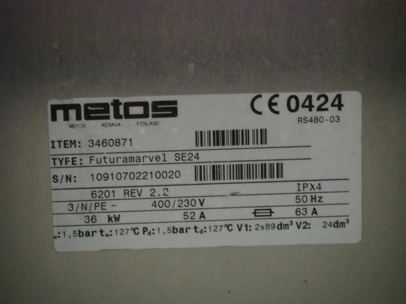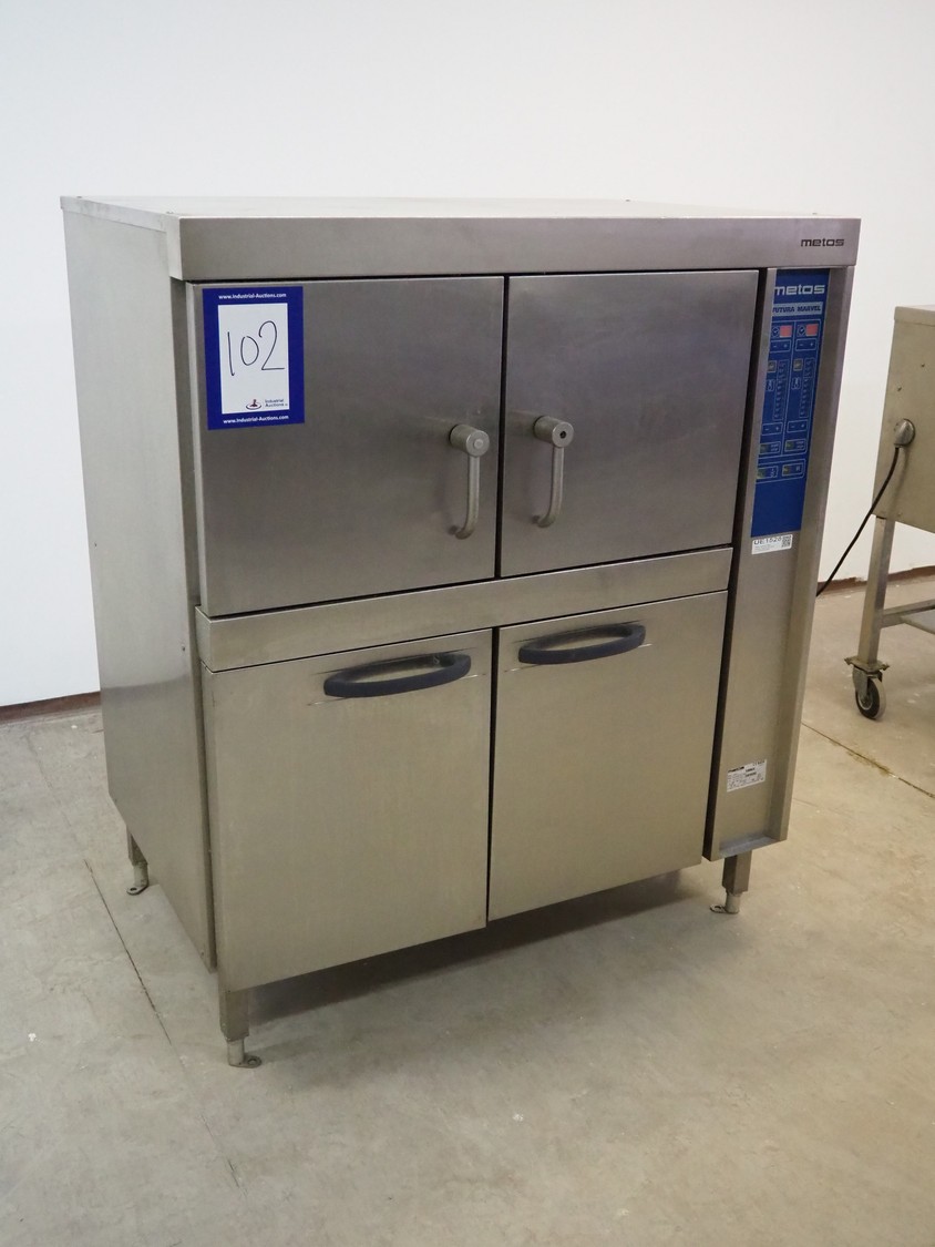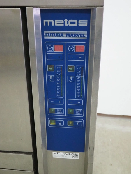Metos pressure steamer, type: Futuramarvel SE24, serial number: 10910702210020, 400/230 V, 3 Ph, 50 Hz, 36 kW, 52 A, (2x) 6 floors, dimensions each floor: 550 mm x 320 mm, total dimensions: 1200 mm x 800 mm x 1570 mm.