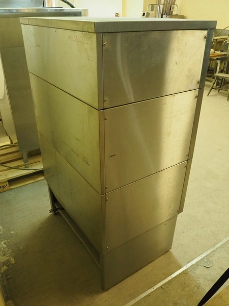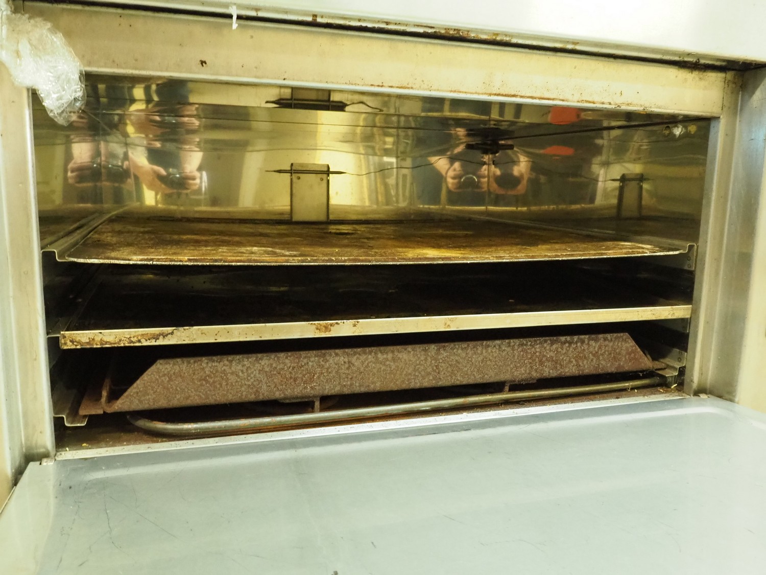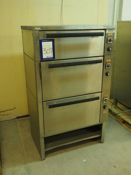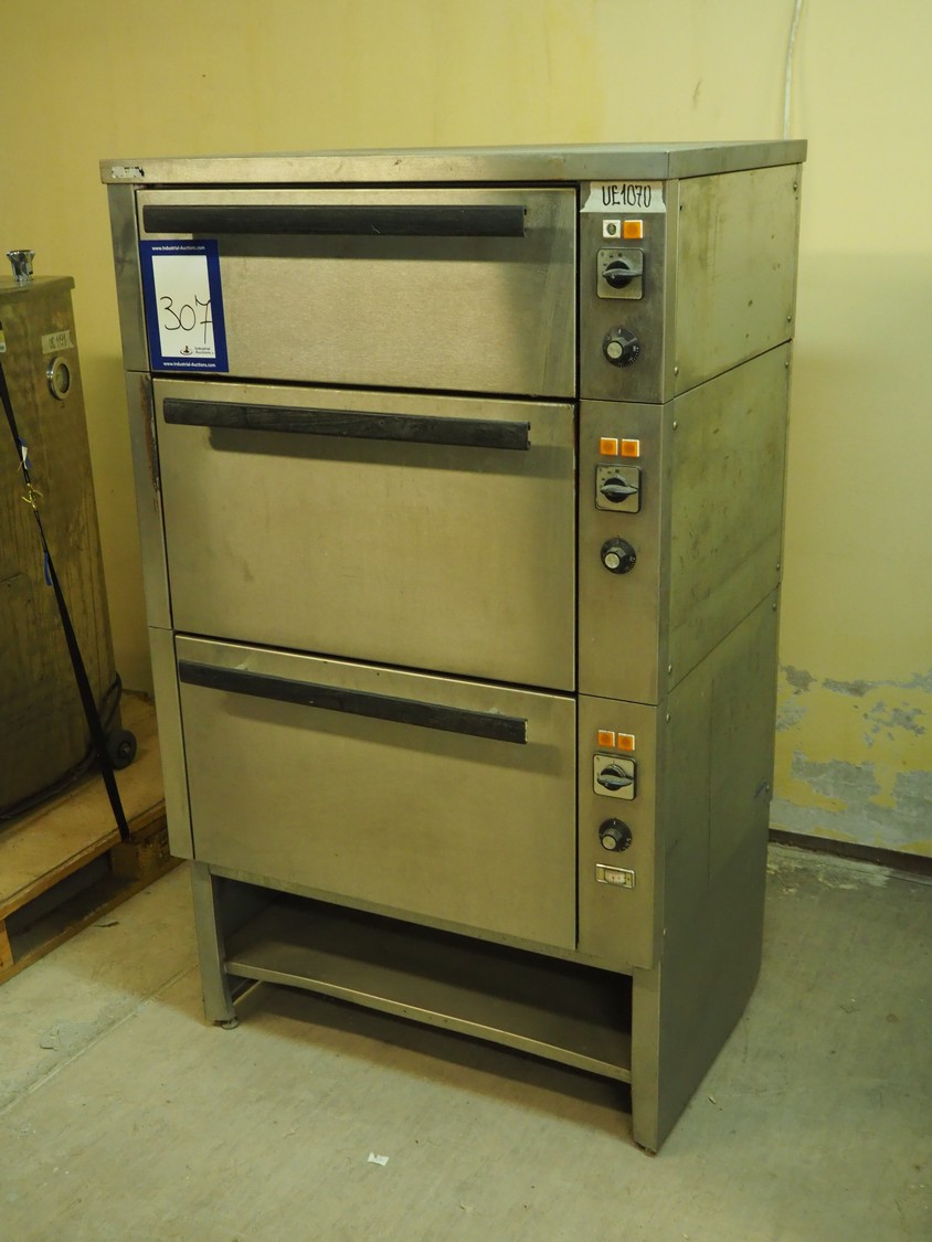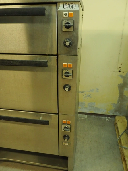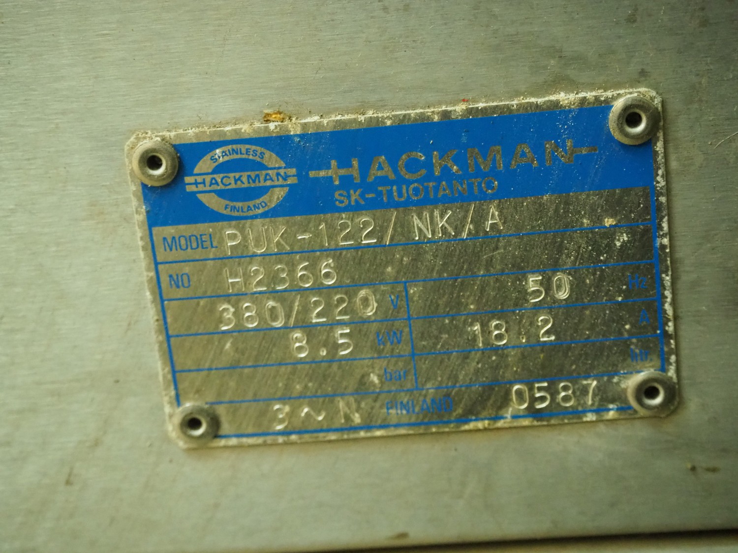 Hackman triple deck oven, model: PUK-122/NK/A, number: H2366, 380/220 V, 3 Ph, 50 Hz, 18.2 A, 8.5 kW, inside dimensions: (2x) 660 mm x 550 mm x 320 mm and (1x) 660 mm x 550 mm x 180 mm, total dimensions: 900 mm x 650 m x 1530 mm.