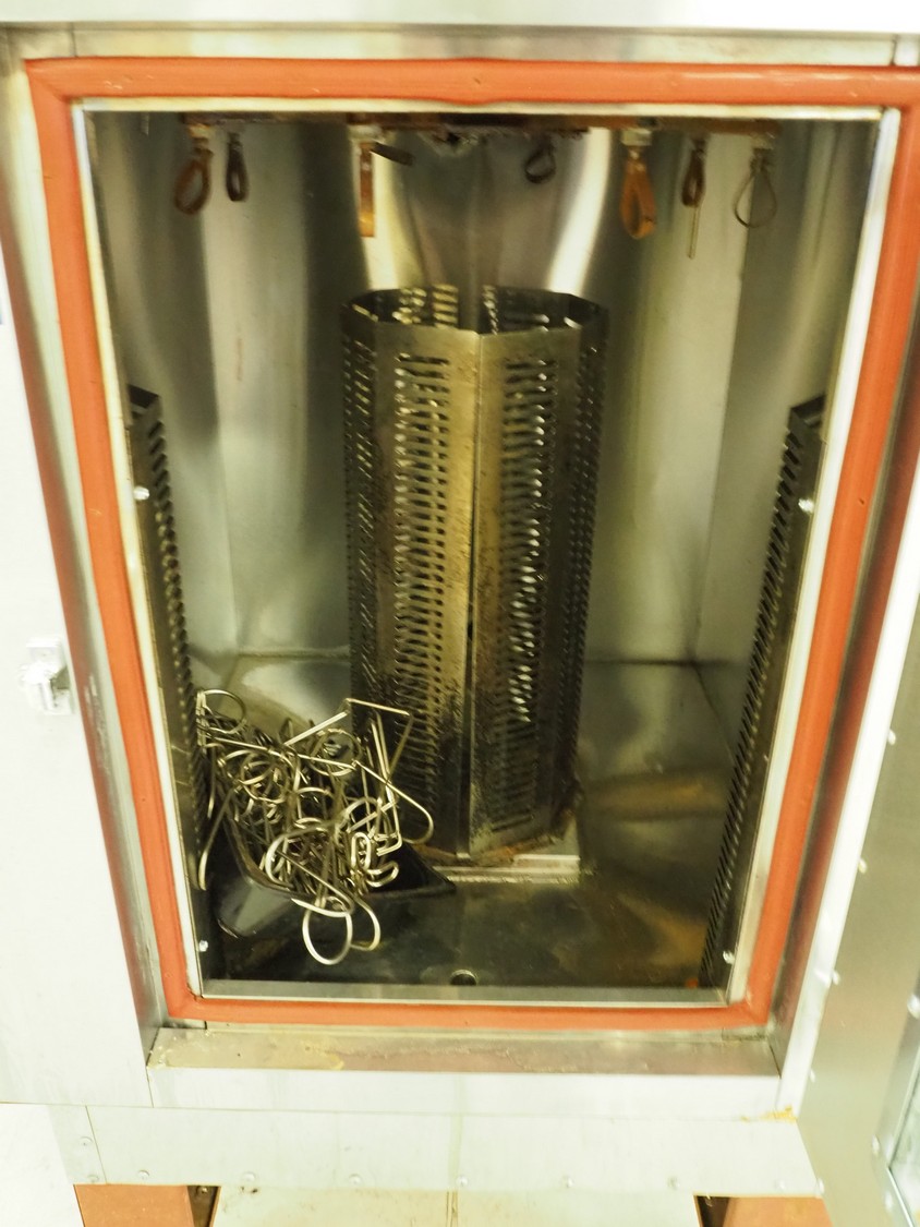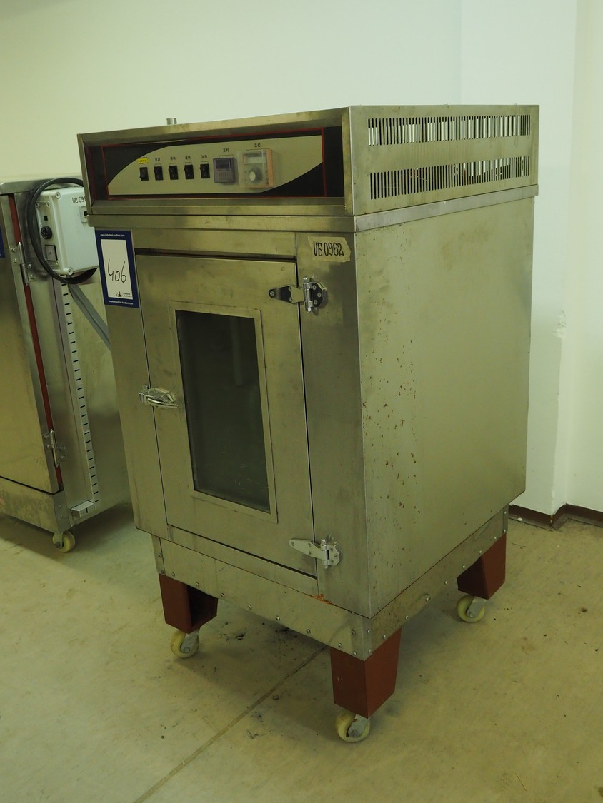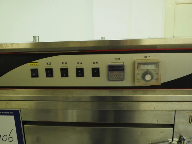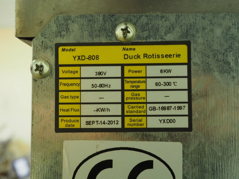 Mobile rotisserie oven for ducks, model: YXD-808, serial number: YXD00, year of construction: Sept-14-2012, 380 V, 50-60 Hz, 6 kW, temperature range: 60-300°C, inside dimensions: 650 mm x 450 mm x 730 mm, total dimensions: 850 mm x 840 mm x 1600 mm.