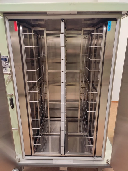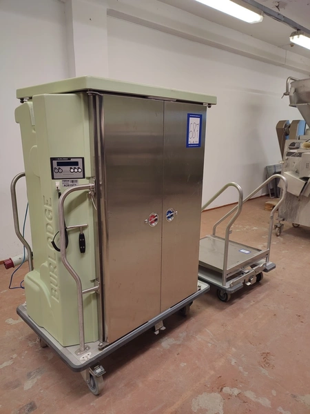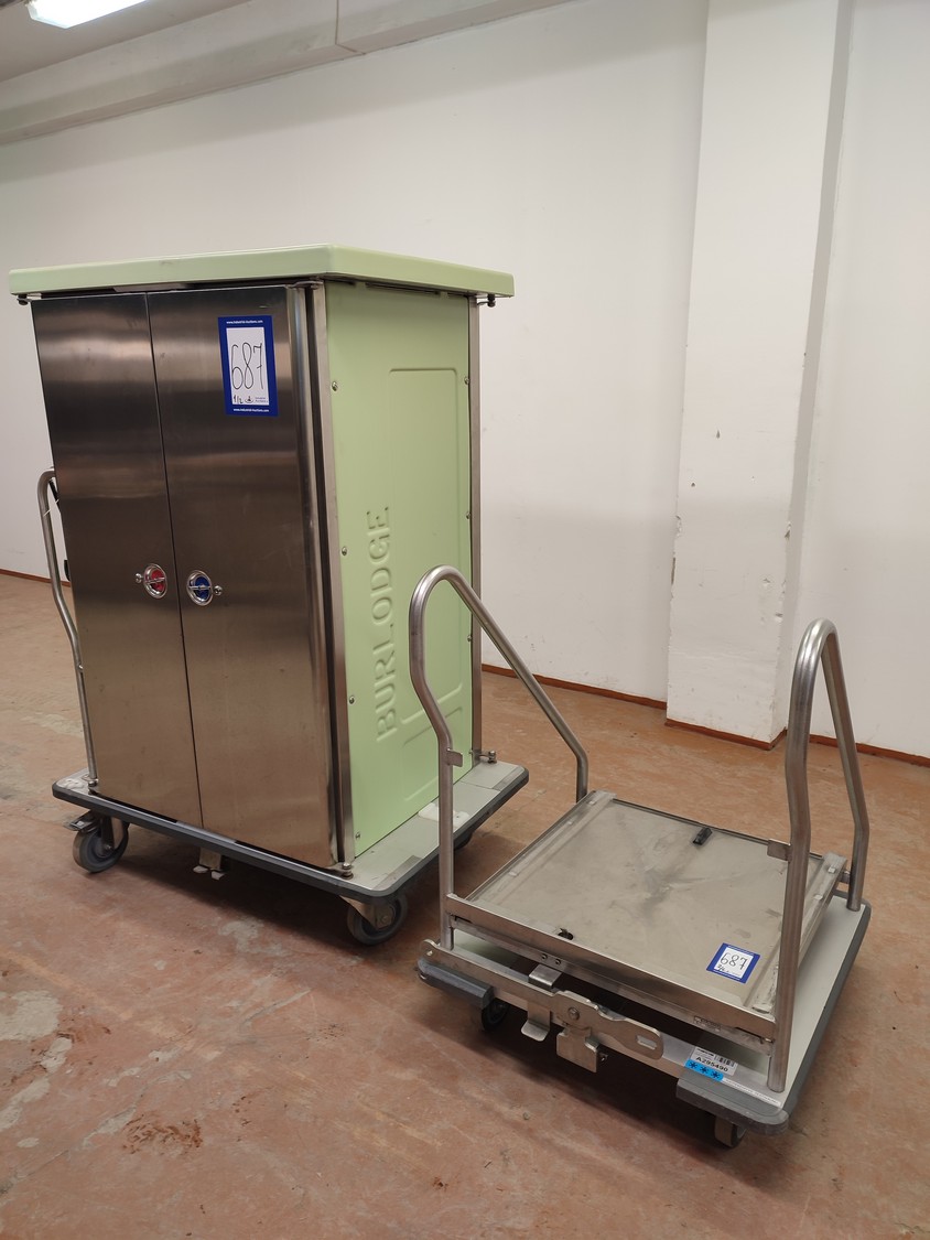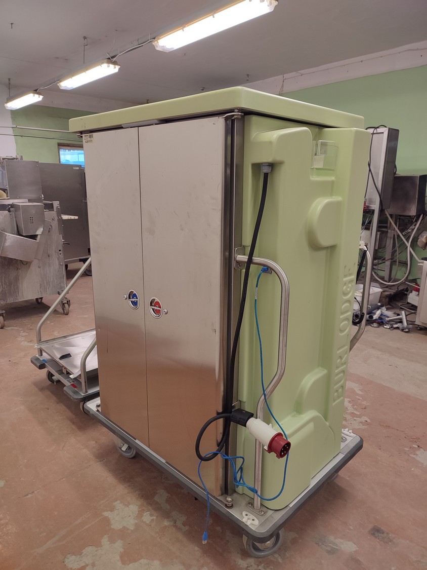 Burlodge serving trolley for portioned meals on trays, type: NOVAFLEX, serial number: BLC 106607, year of construction: 6.10.2009, 400 V, 3 Ph, 50 Hz, 12.5 A, 7.6 kW, transport trolley dimensions: 1170 mm x 780 mm x 1620 mm, loading trolley dimensions: 780 mm x 800 mm x 1040 mm.