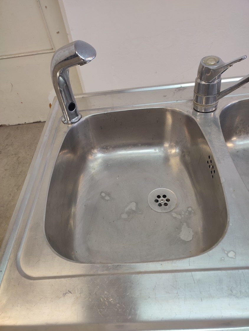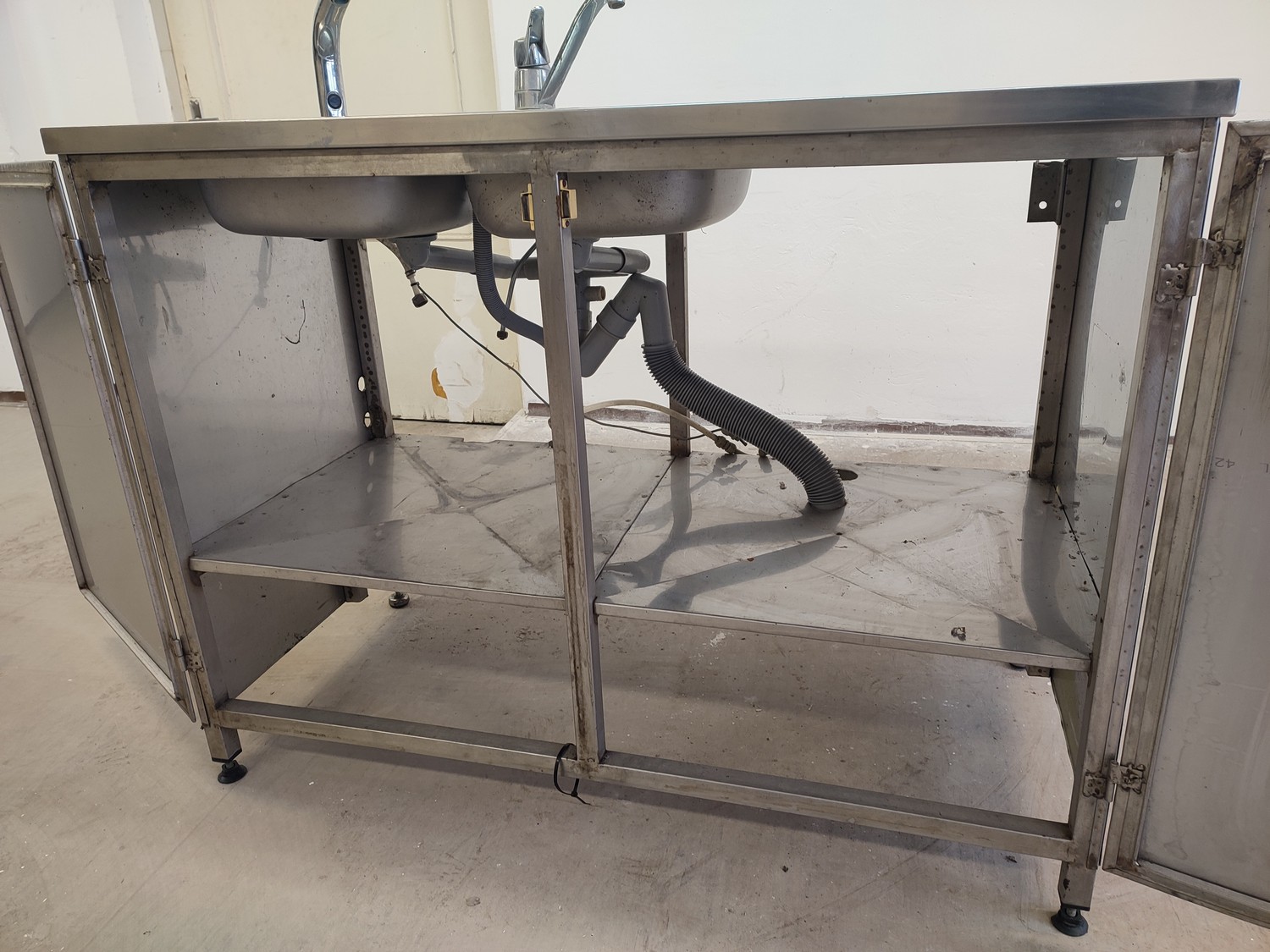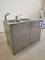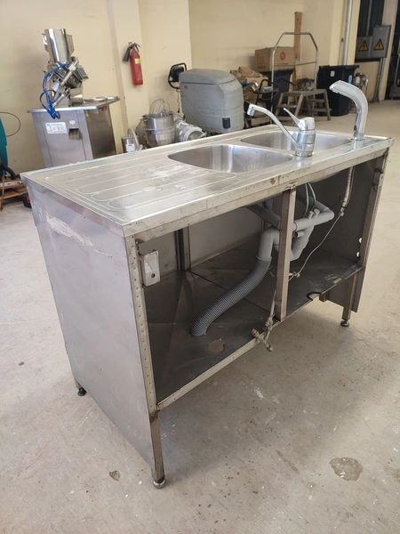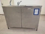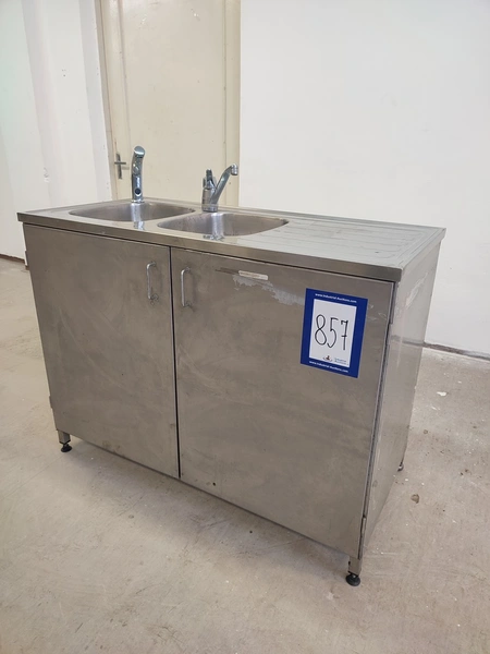 S/s cabinet with double sink, dimensions: 1200 mm x 600 mm x 1100 mm.