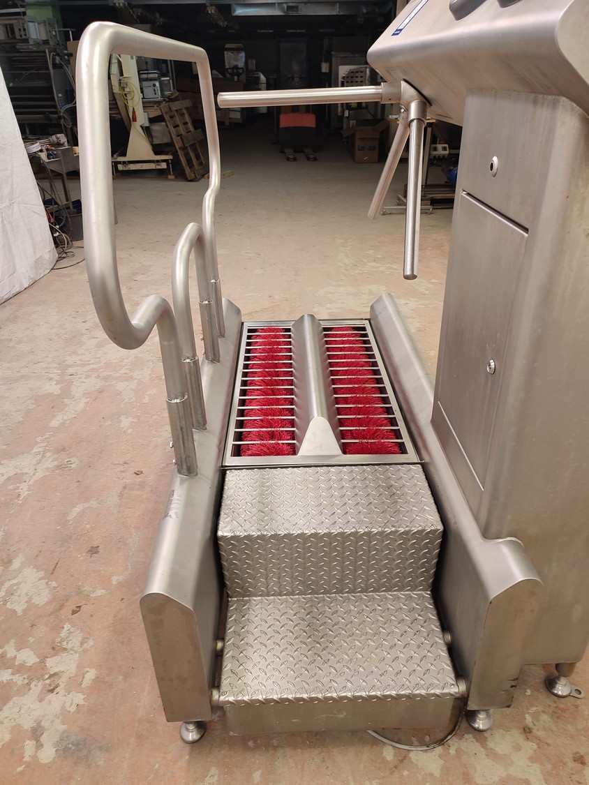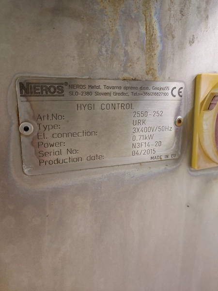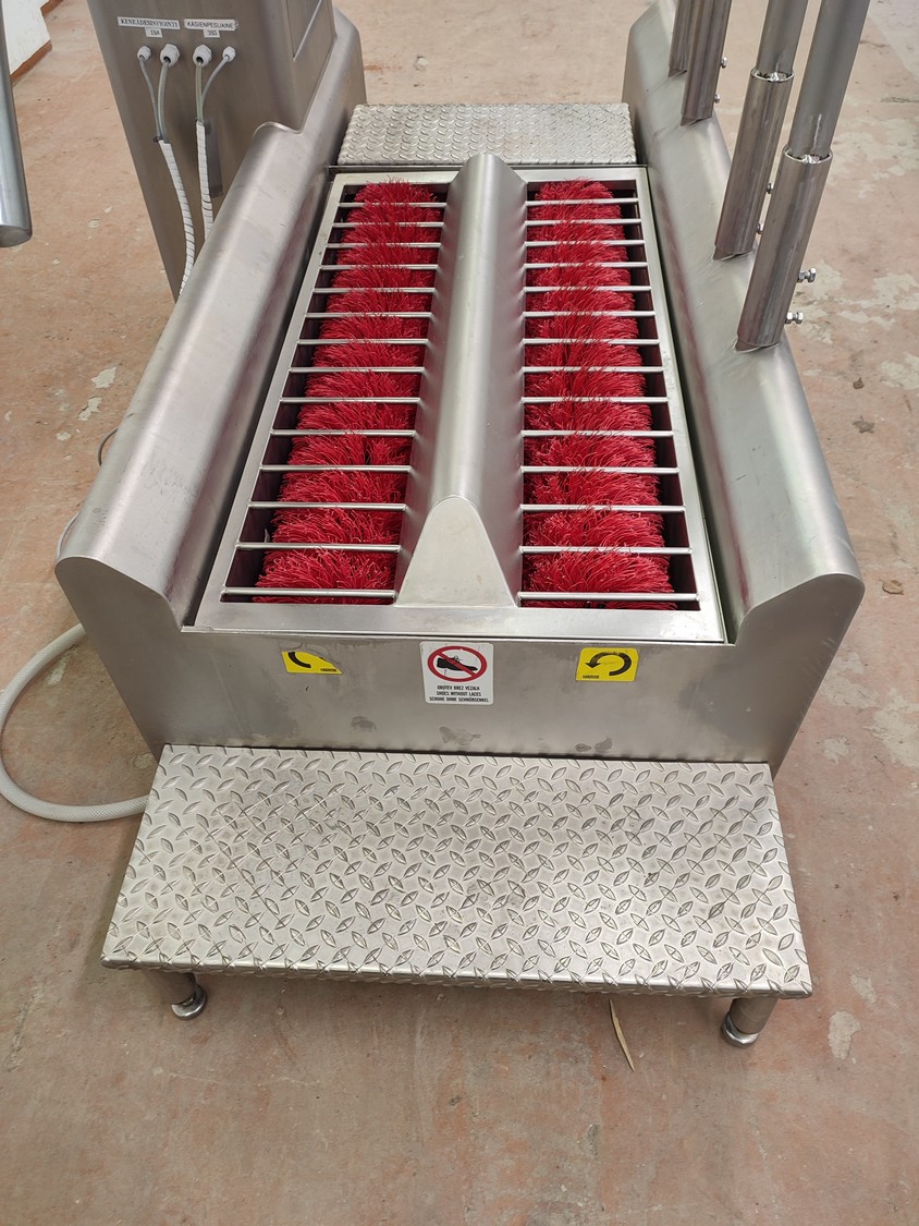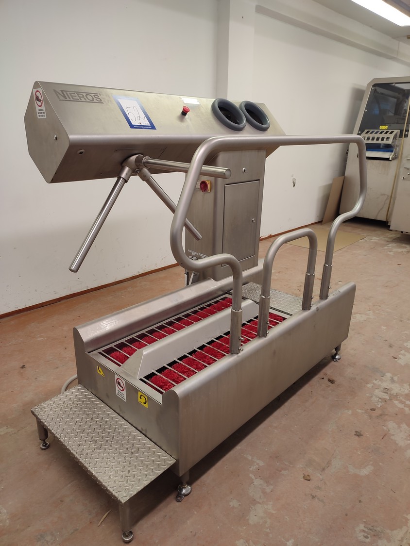 Nieros hygiene station with sole cleaner, tourniquet and hand disinfection, type: URK, serial number: N3F14-20, year of construction: 04/2015, 400 V, 3 Ph, 50 Hz, 0.71 kW, brush length: (2x) 900 mm, total dimensions: 1880 mm x 1000 mm x 1600 mm.